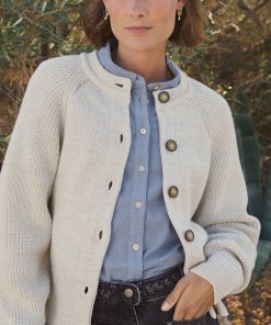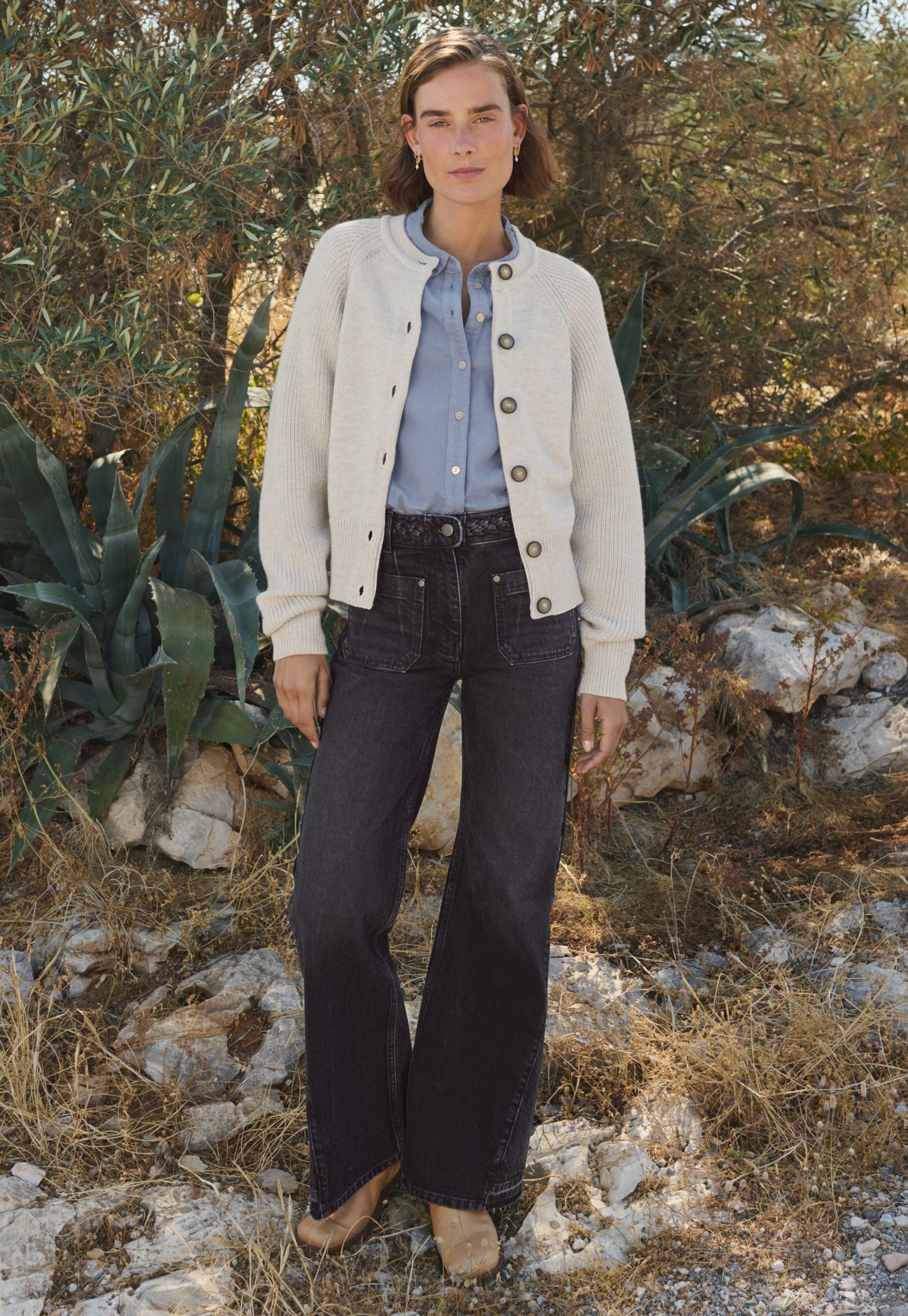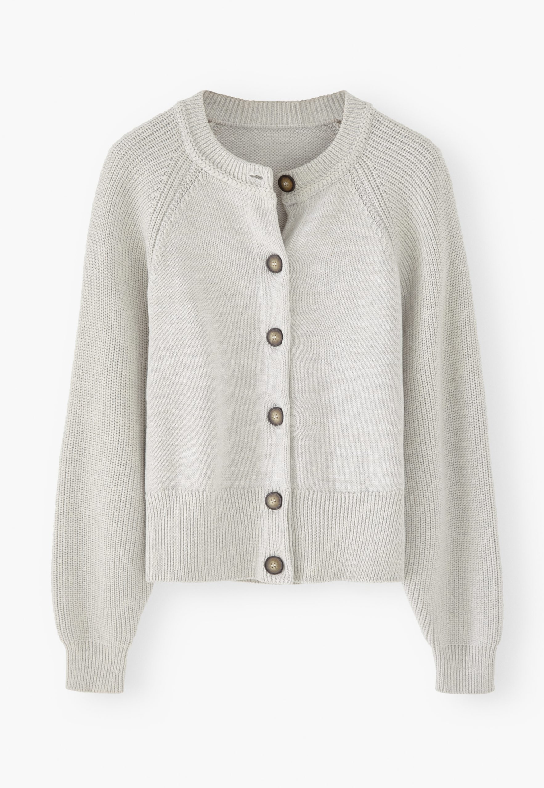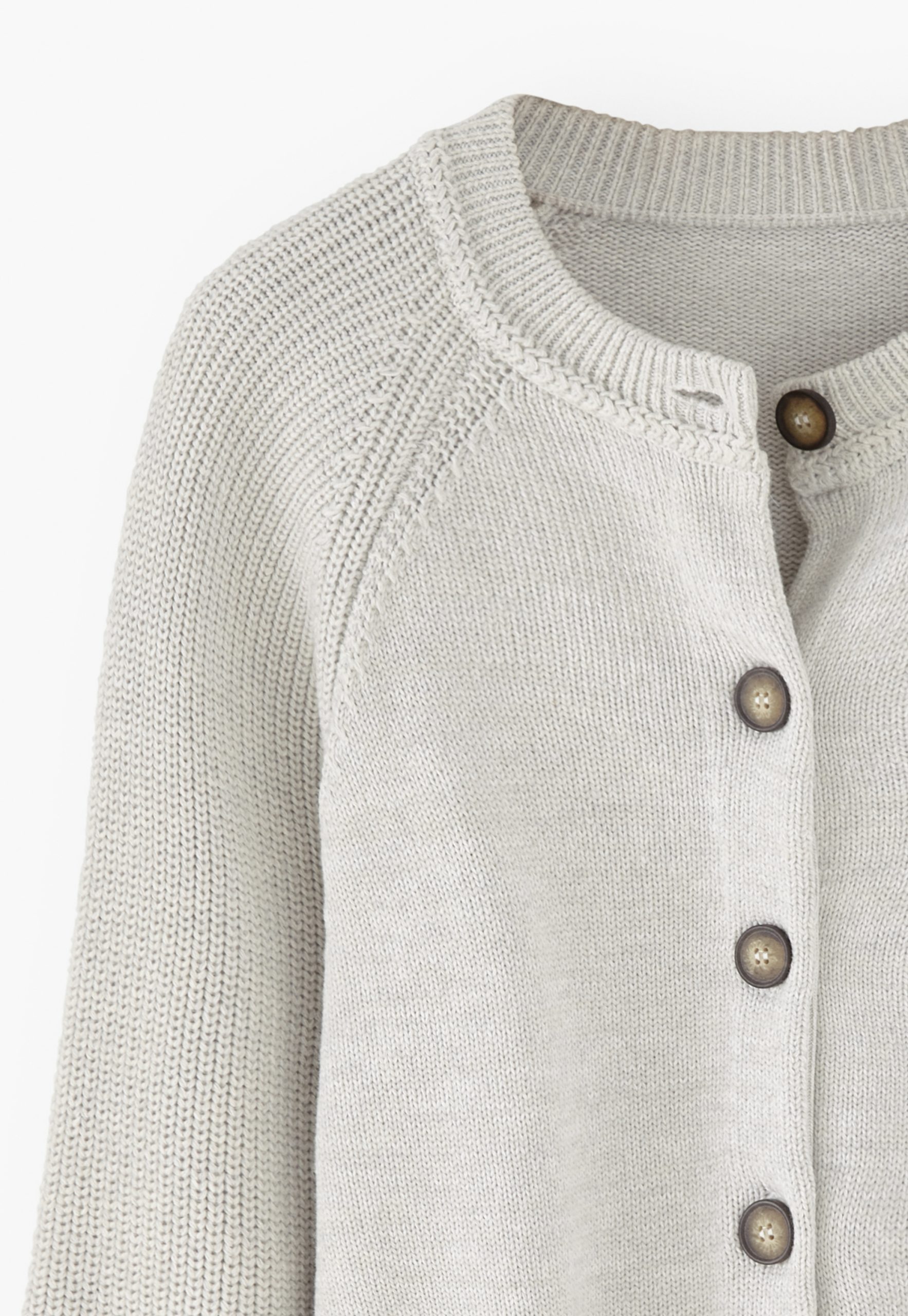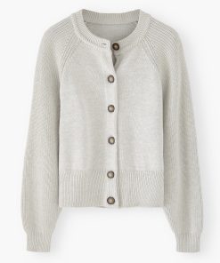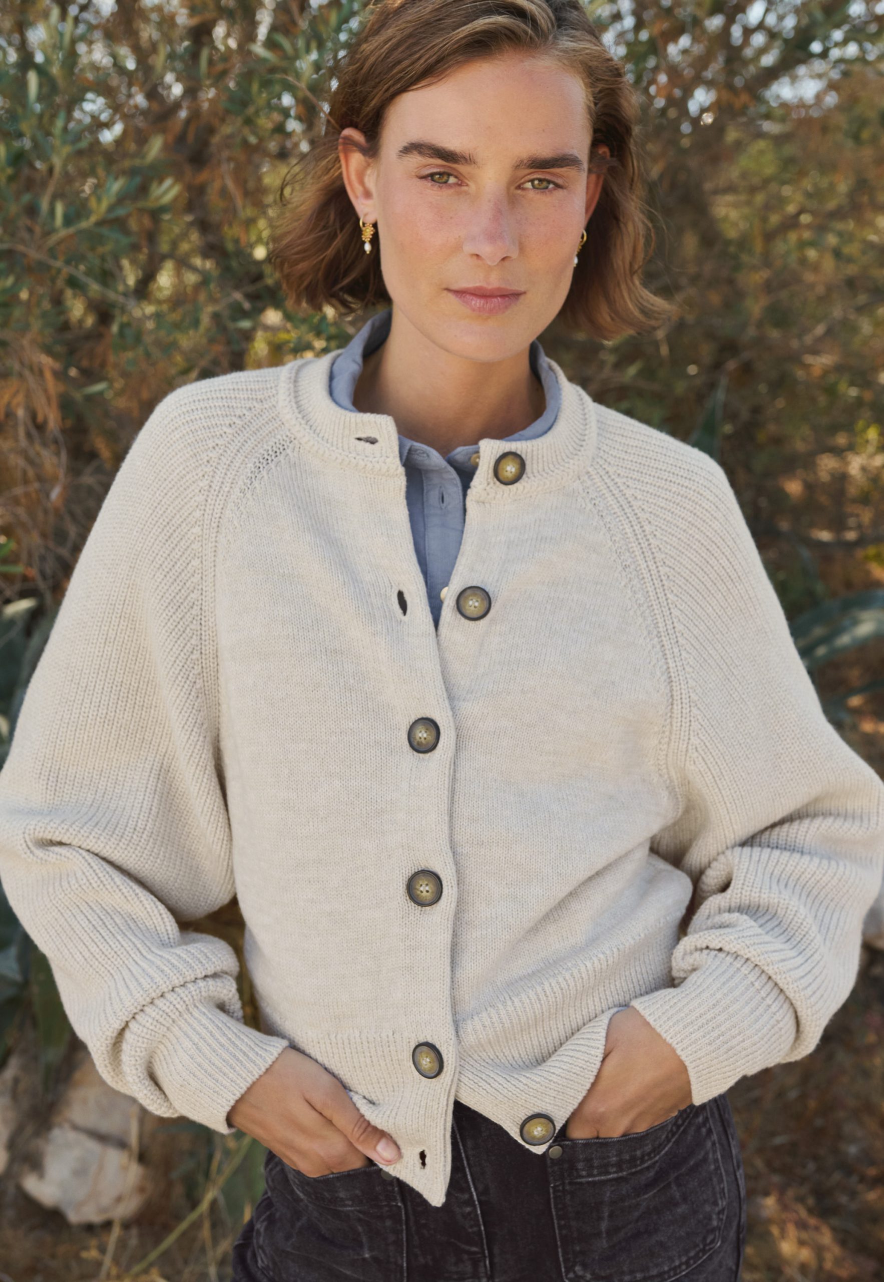 Playing with proportion, this smooth-knit button-through cardigan has batwing-style sleeves contrasting with a neat body. The blend of merino wool and brushed organic cotton creates a subtle marled effect.
