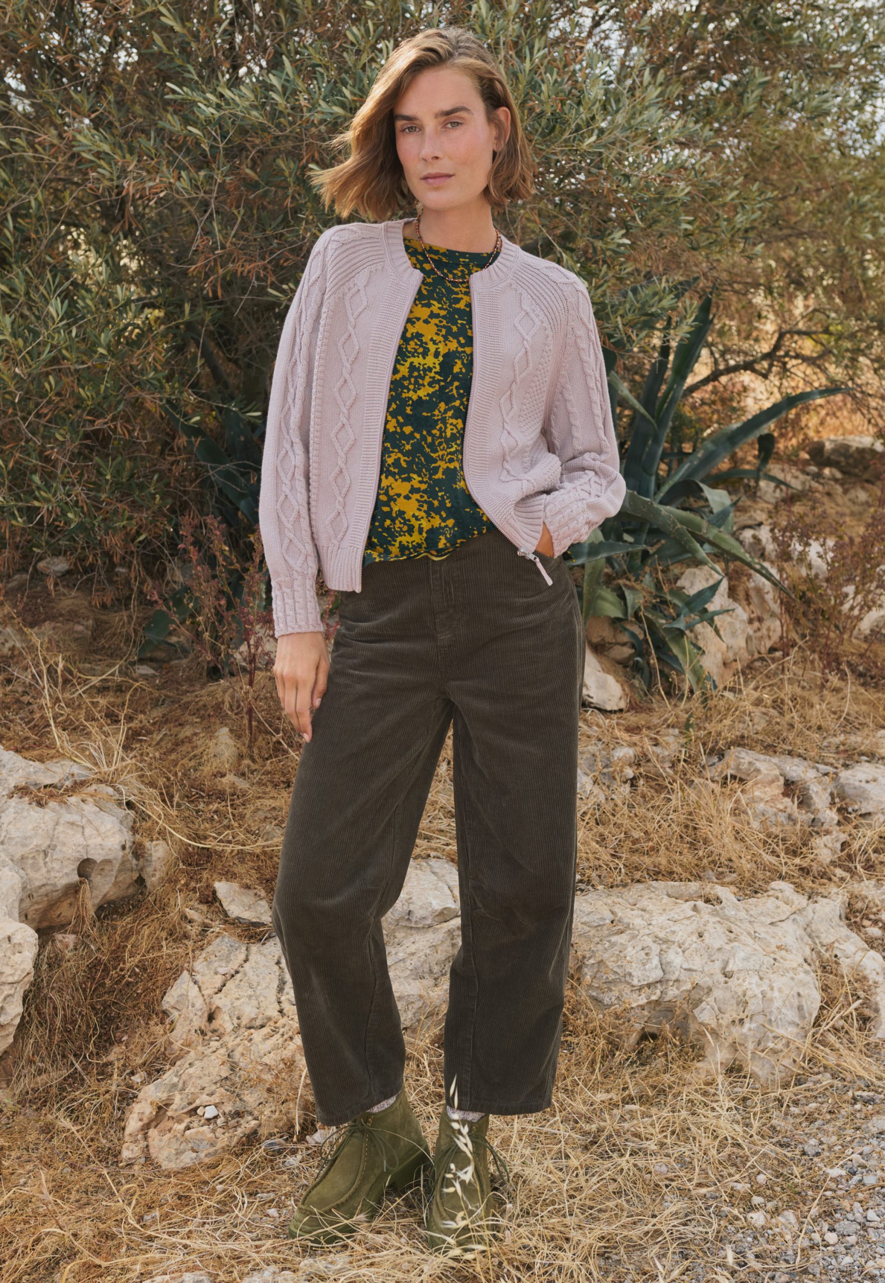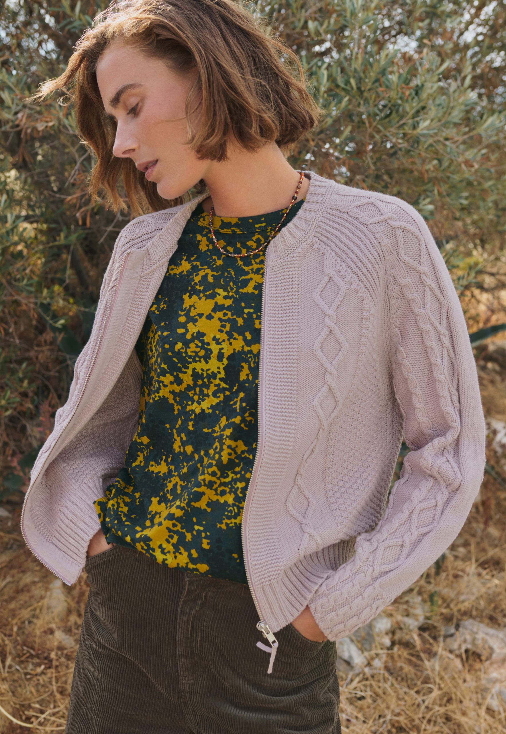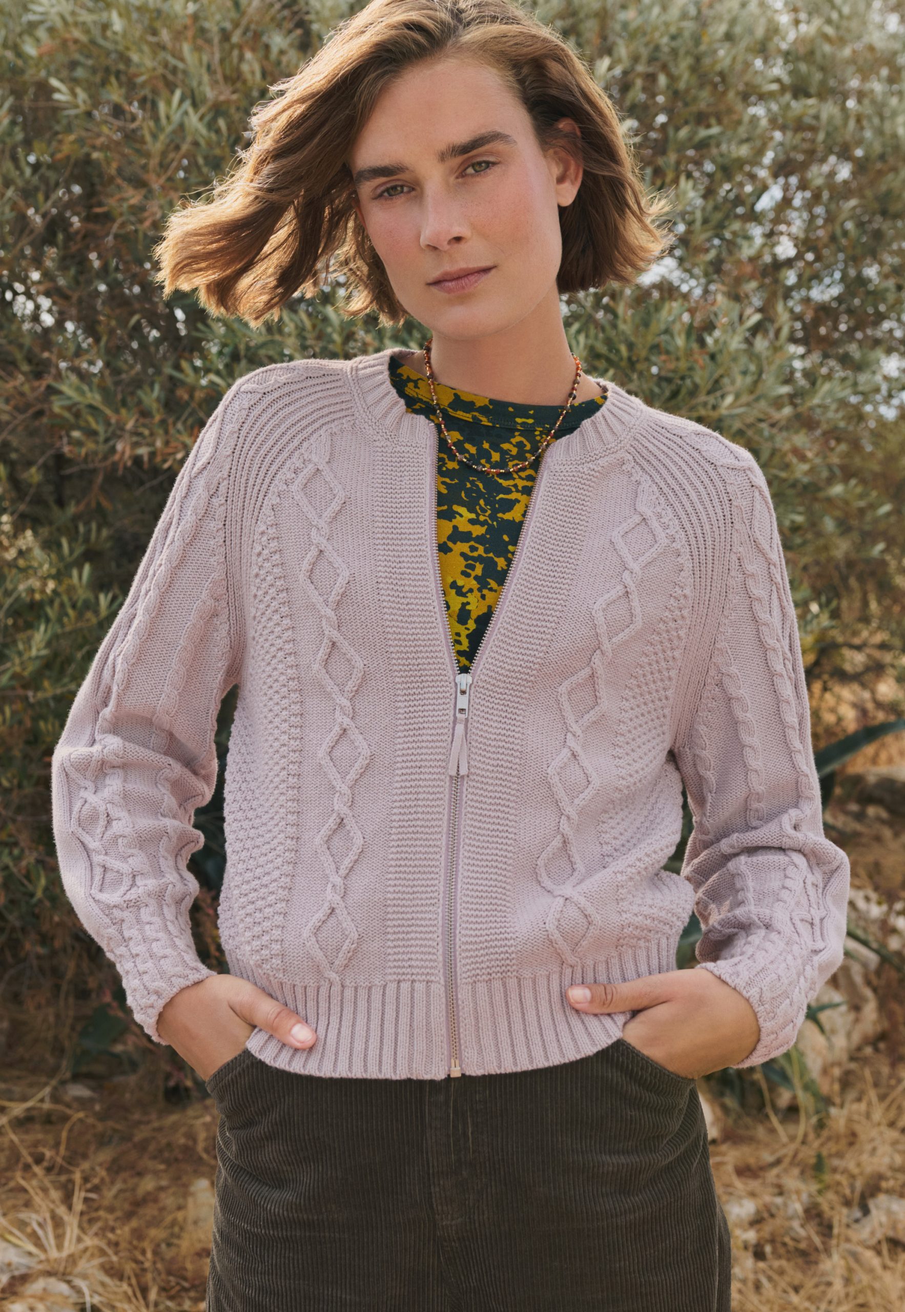 A timeless cable-knit cardigan that’s brought right up to date with a touch of bomber jacket styling. Knitted from premium brushed organic cotton in bold colour, it puts the smart into casual.