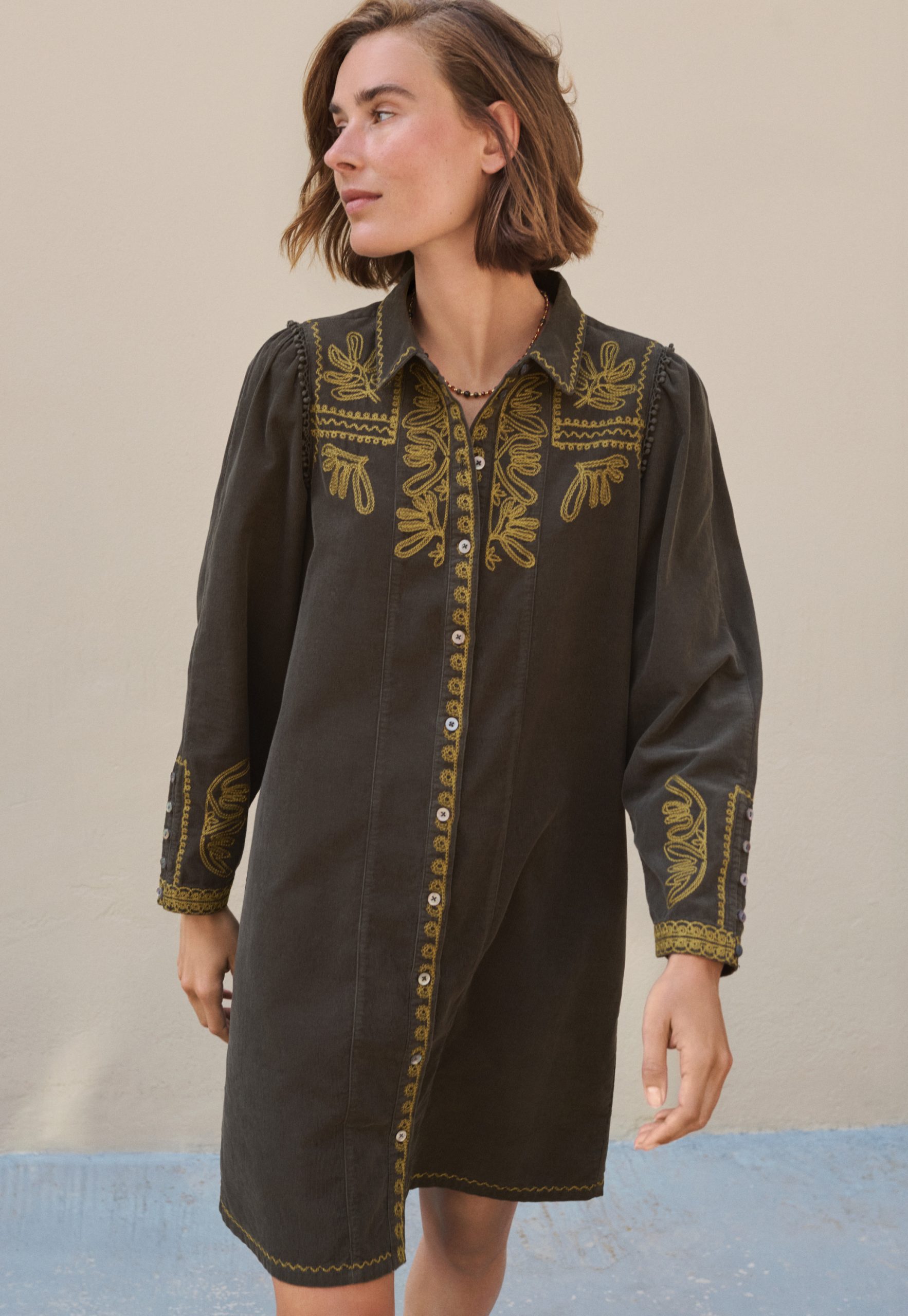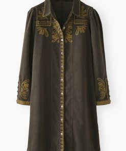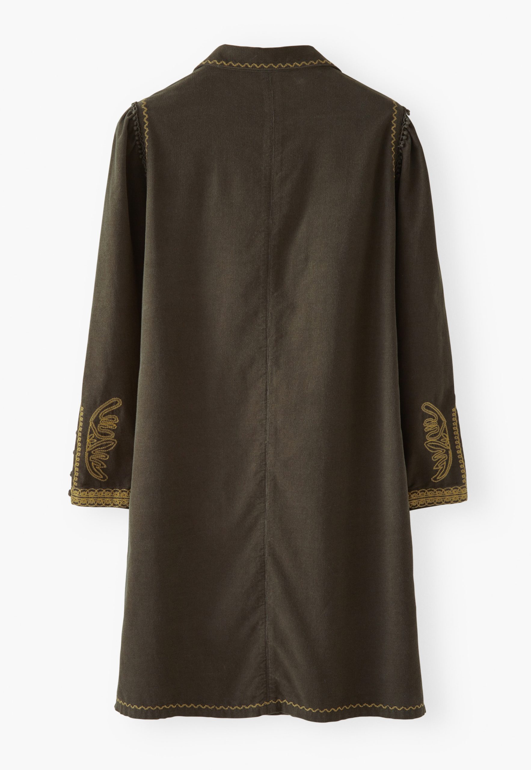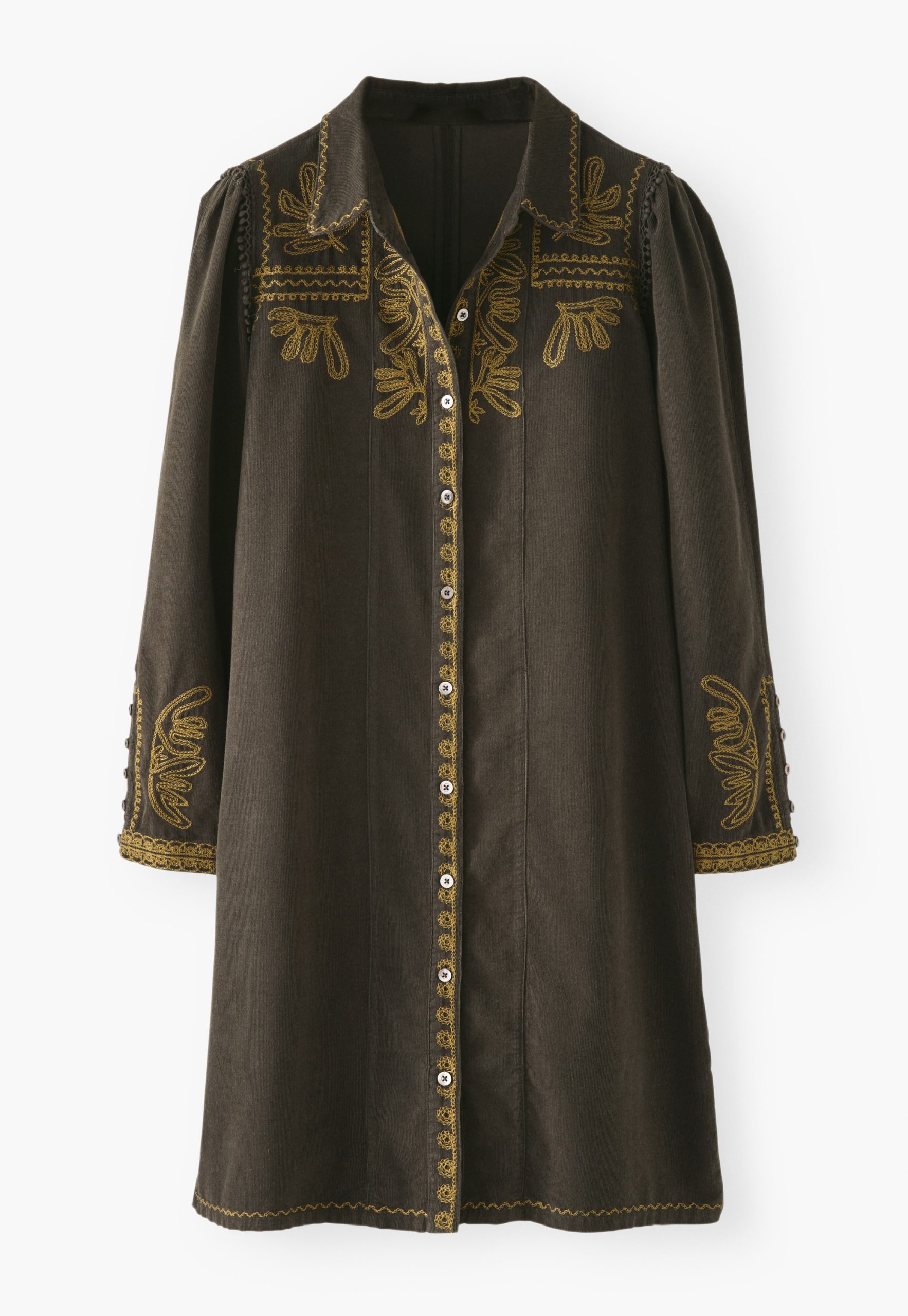 For when you want to wear a distinctive dress but still feel comfortable, this is the one. In a neat, straight fit, and made from soft and velvety fine-wale cotton cord, it has contrast embroidery around the collar and shoulder. Fastening with buttons throughout, it can double as an elegant long jacket.