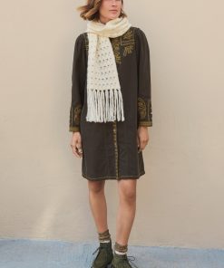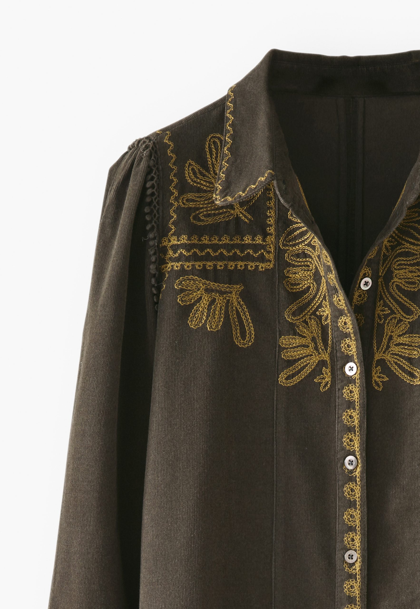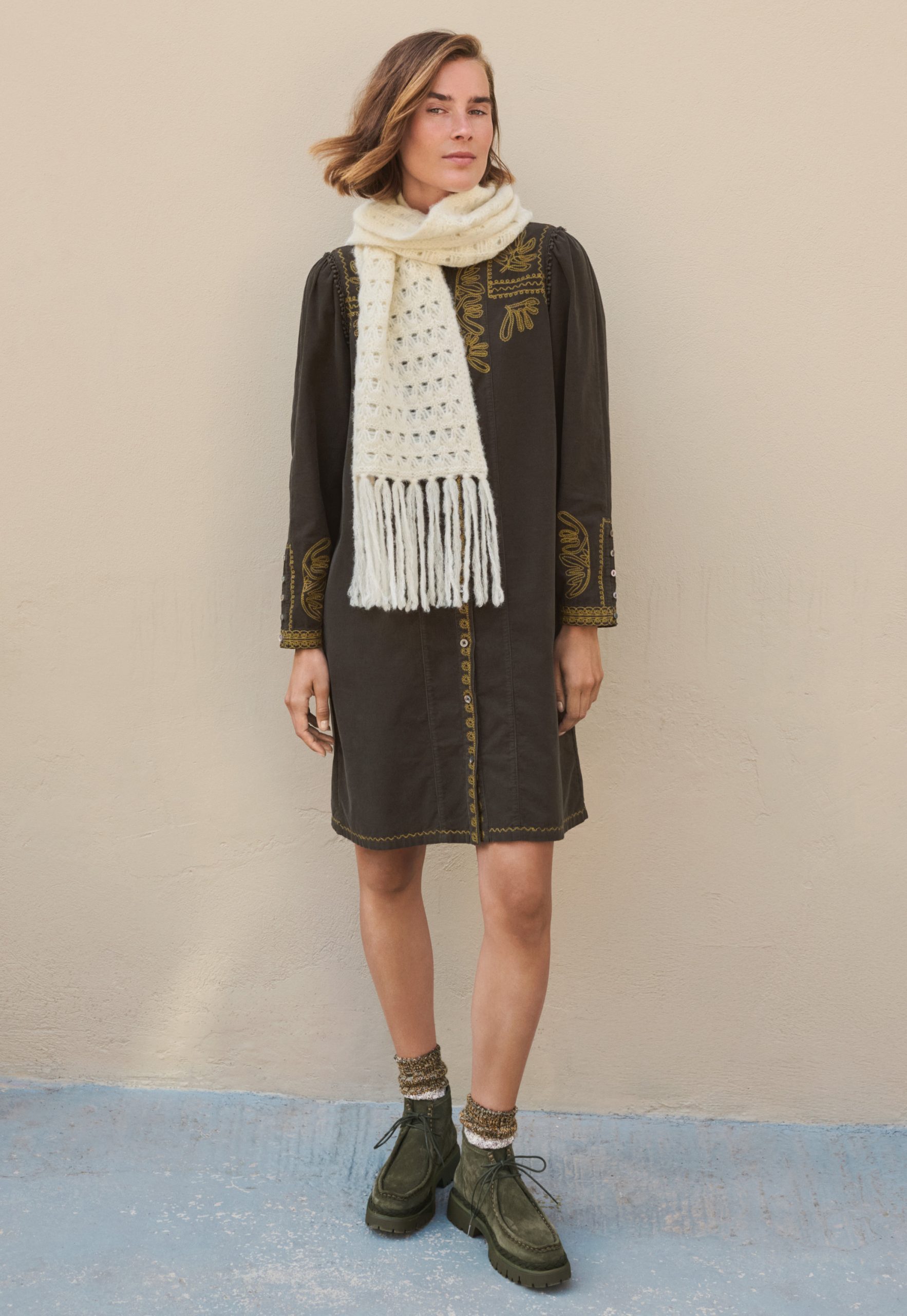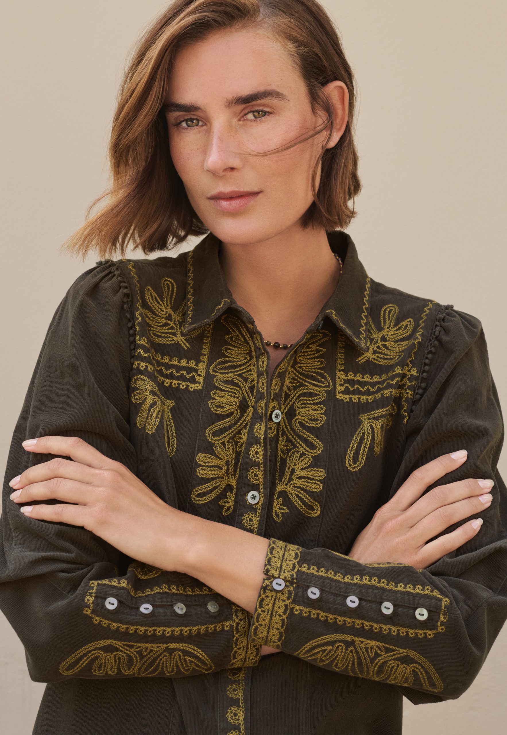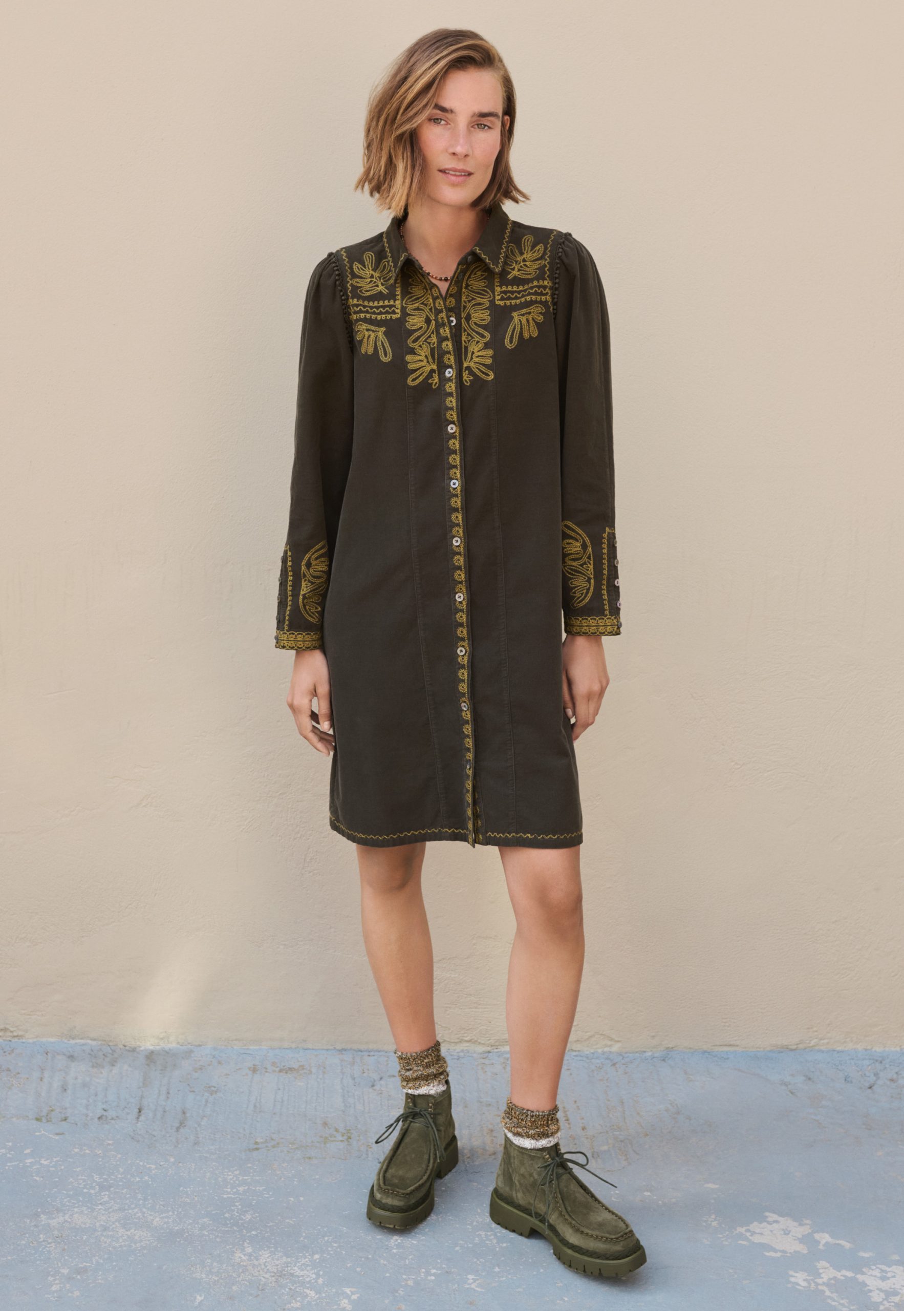 For when you want to wear a distinctive dress but still feel comfortable, this is the one. In a neat, straight fit, and made from soft and velvety fine-wale cotton cord, it has contrast embroidery around the collar and shoulder. Fastening with buttons throughout, it can double as an elegant long jacket.