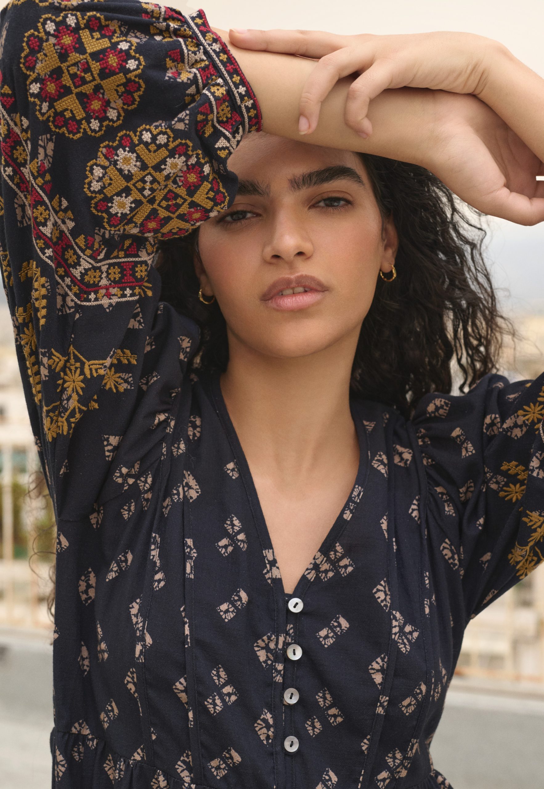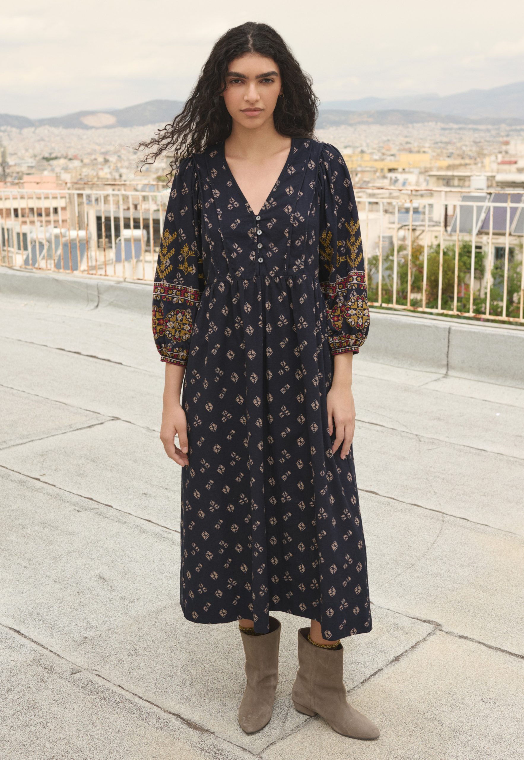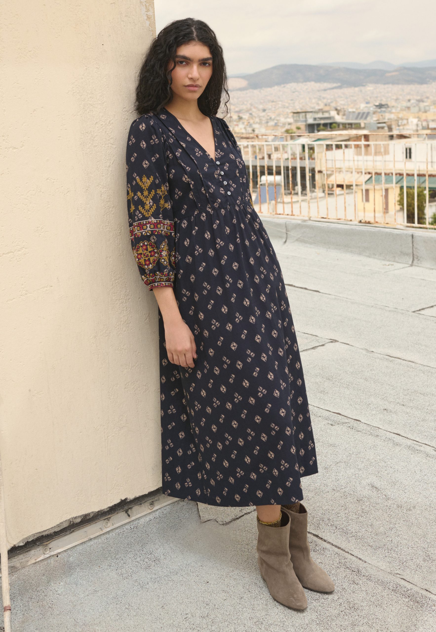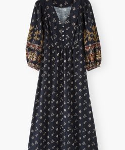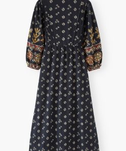 A dress that blends free spirit with distinctive details. Made from rich midweight cotton, with an all-over exclusive print and intricate geometric embroidery across the sleeves, it’s ready for your next evening out.