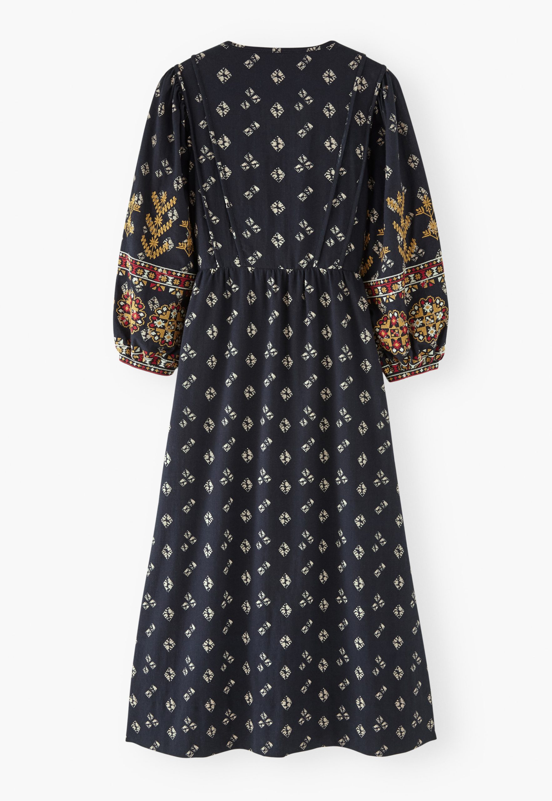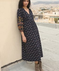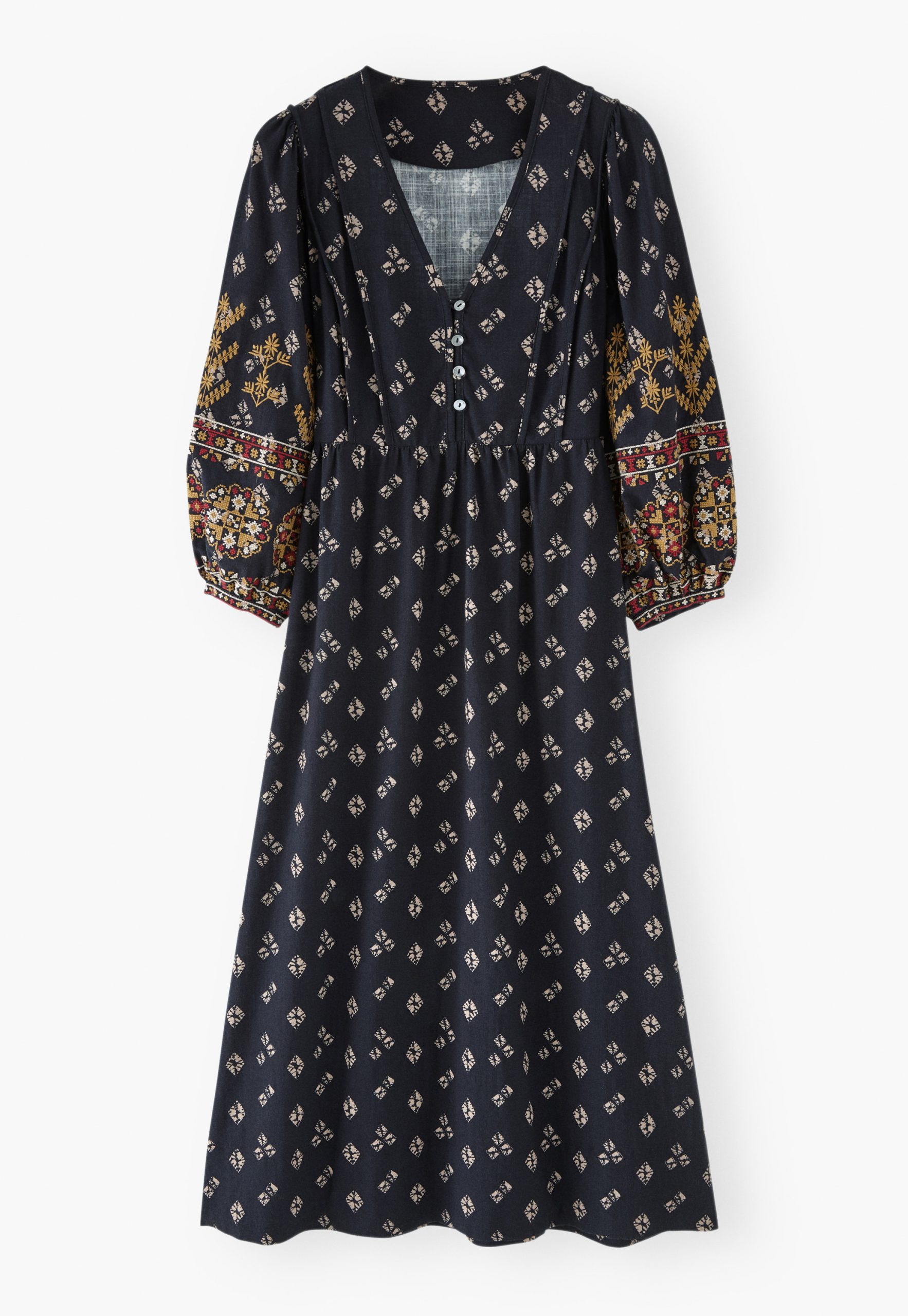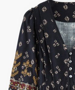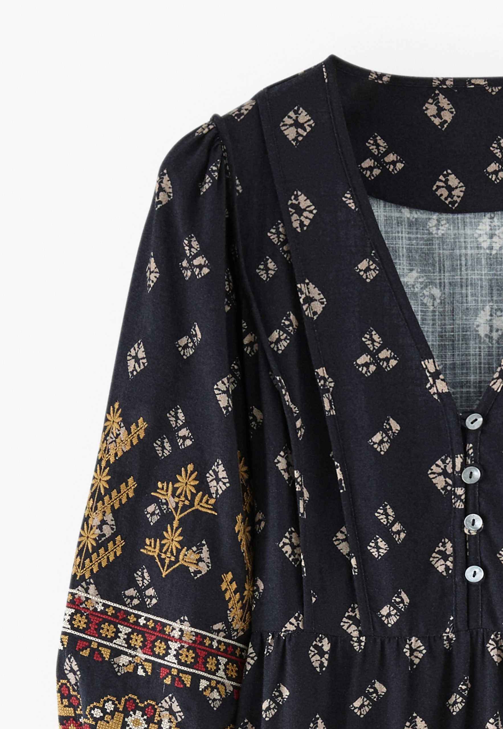 A dress that blends free spirit with distinctive details. Made from rich midweight cotton, with an all-over exclusive print and intricate geometric embroidery across the sleeves, it’s ready for your next evening out.