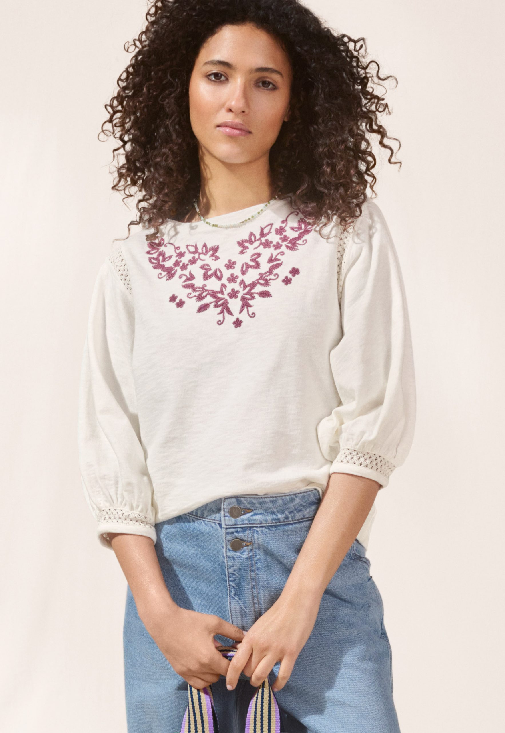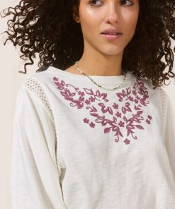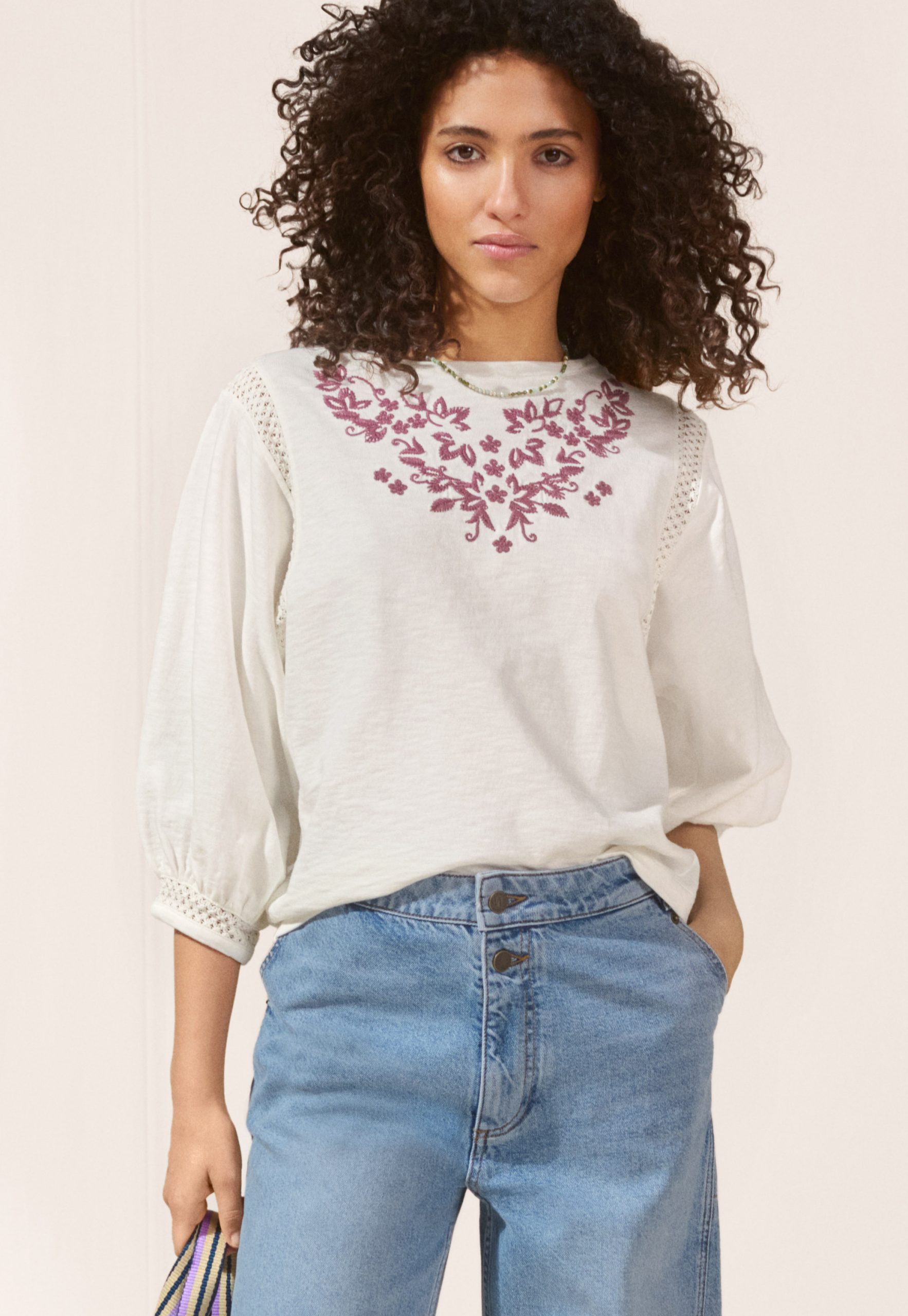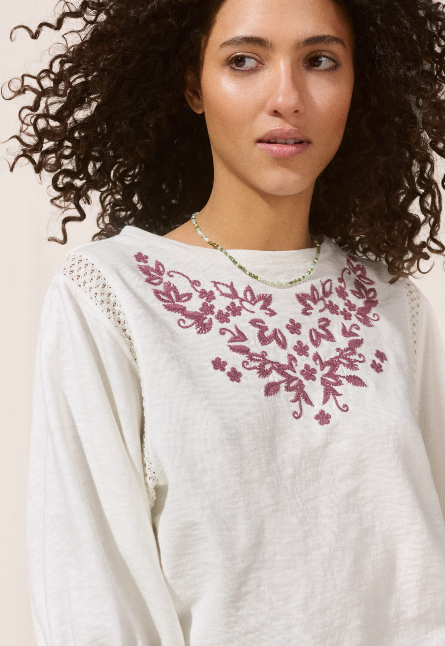 The ease of a sweatshirt with an elevated look thanks to the lovely embroidery detail at the front and the lace inserts at the arms and cuffs.