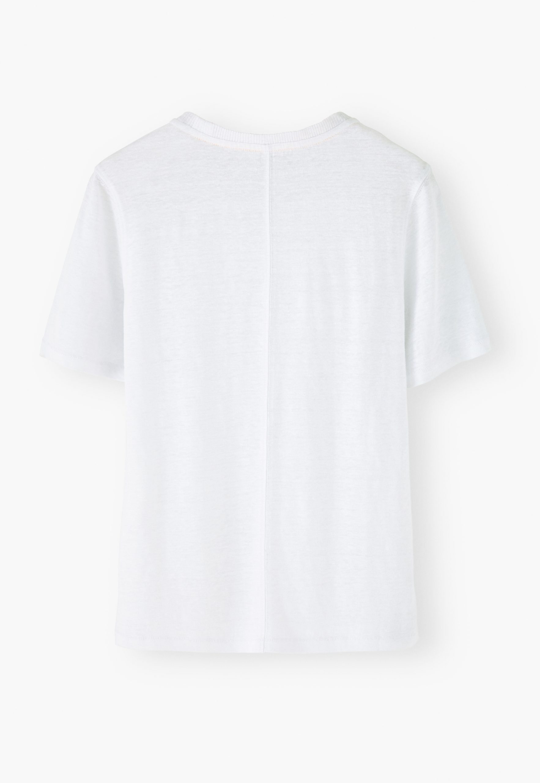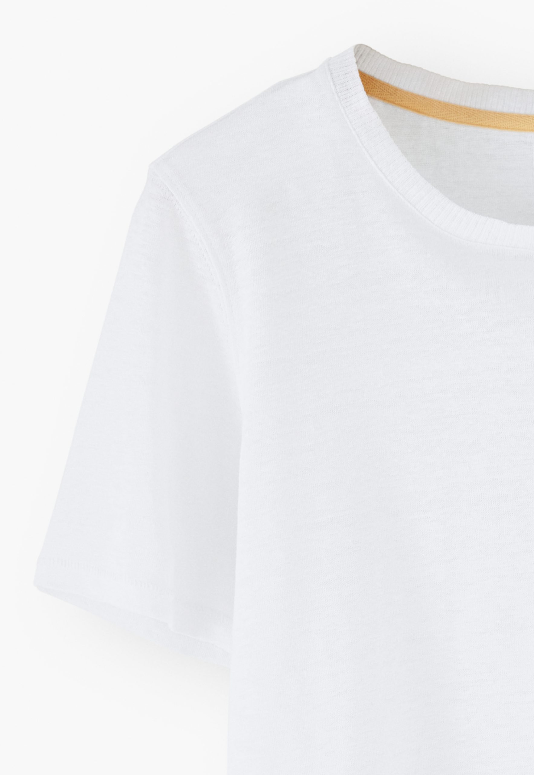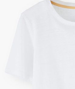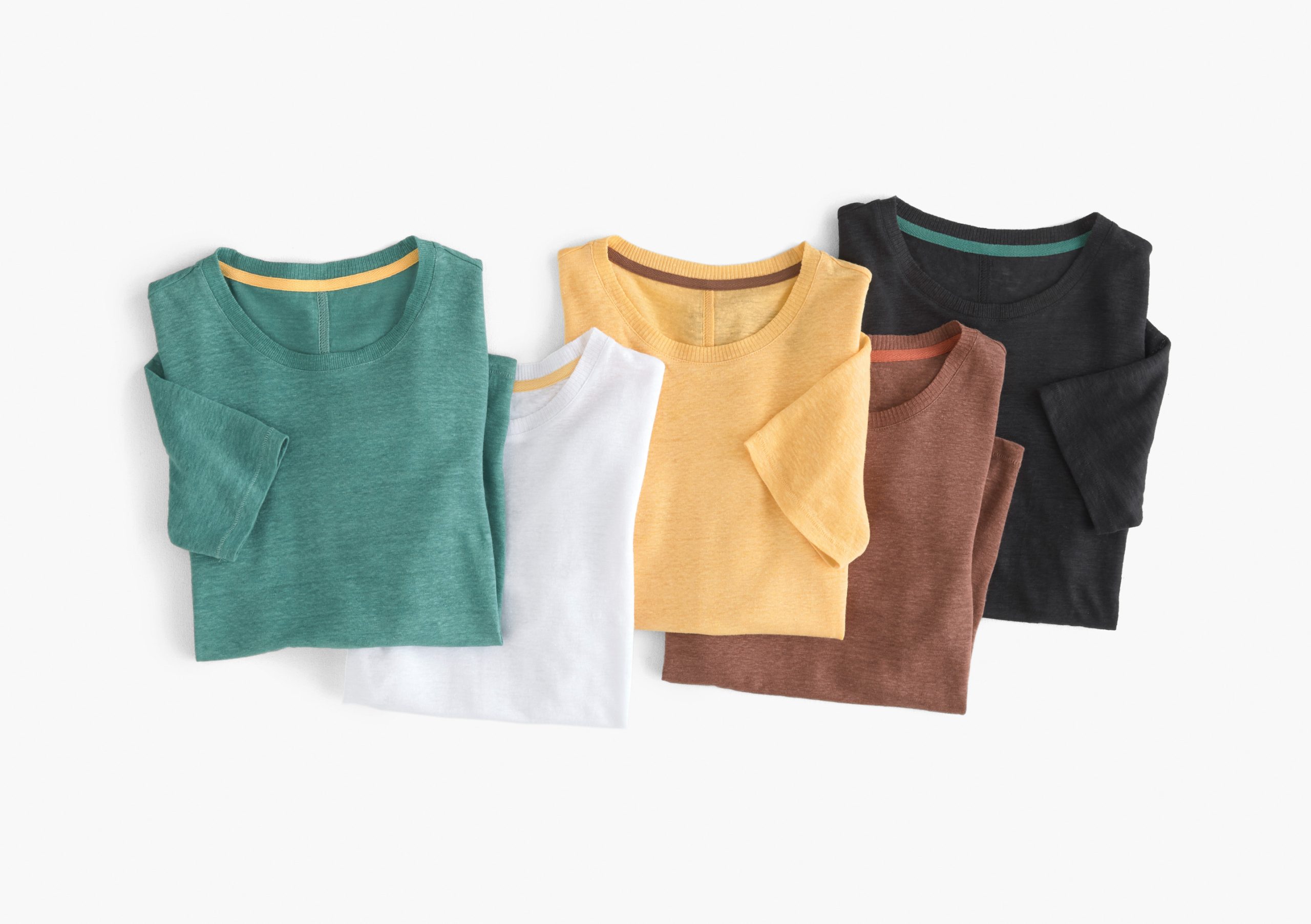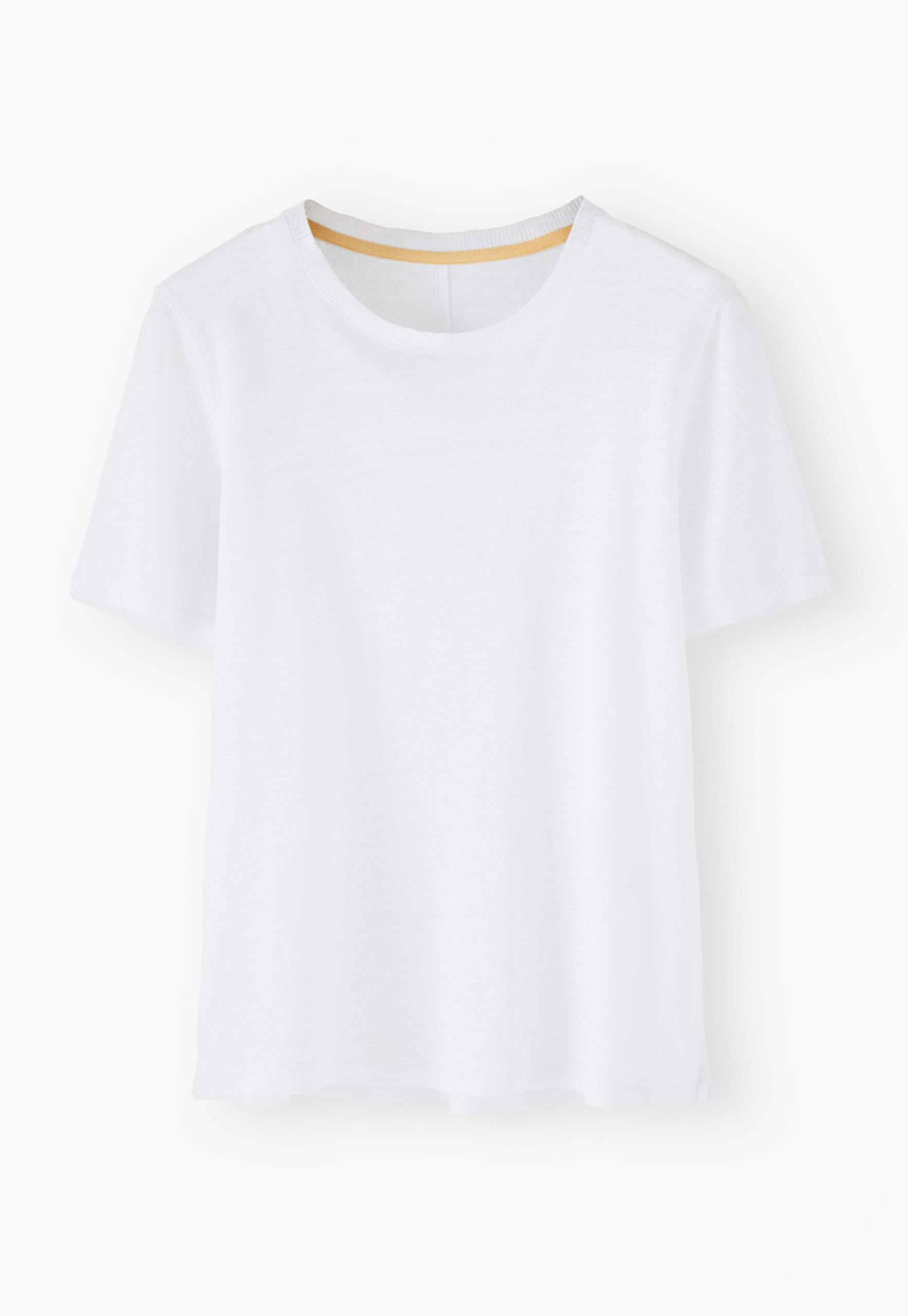 Introducing a new relaxed cut for your favourite linen jersey T-shirt. The round neckline has a rib detail that’s repeated in a vent at the sides and there’s a neat seam at the back.