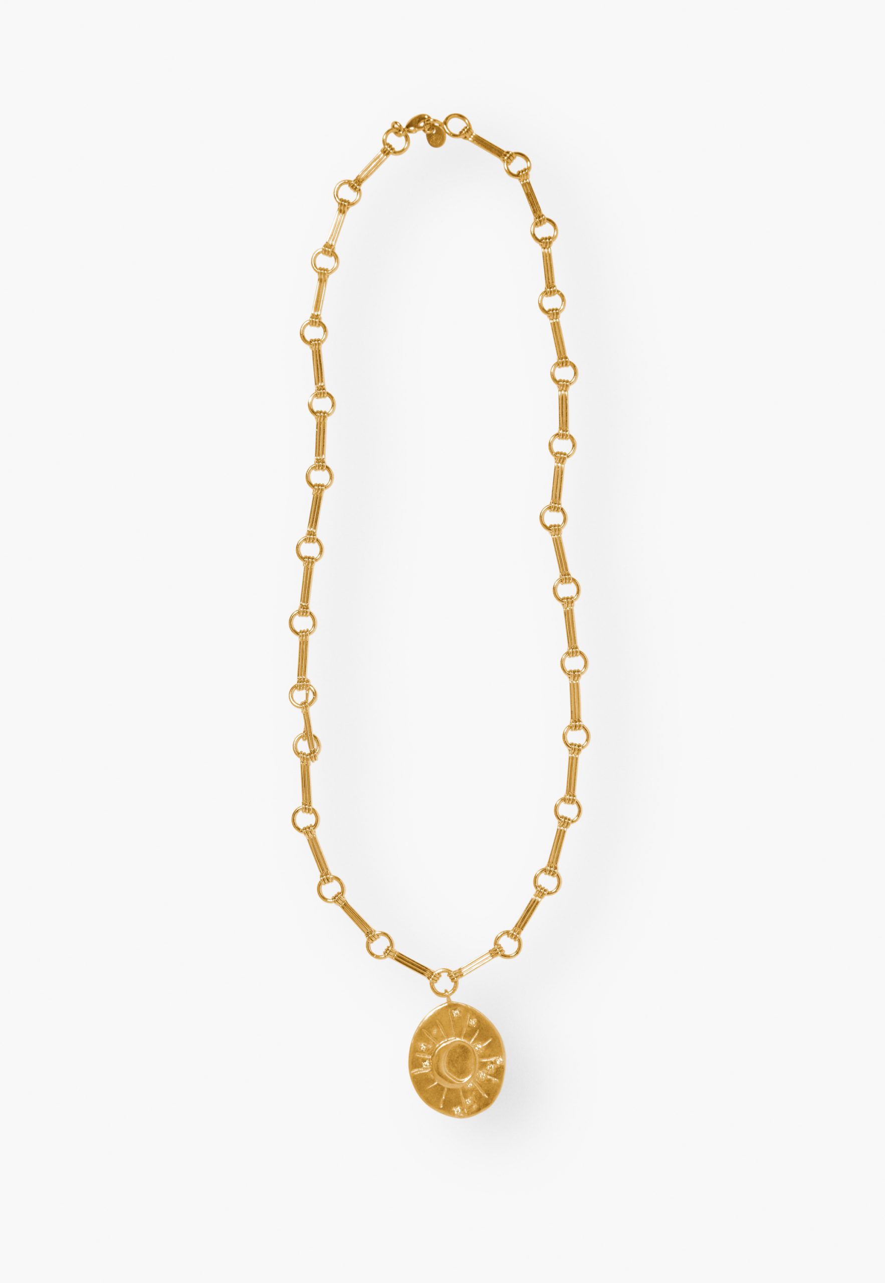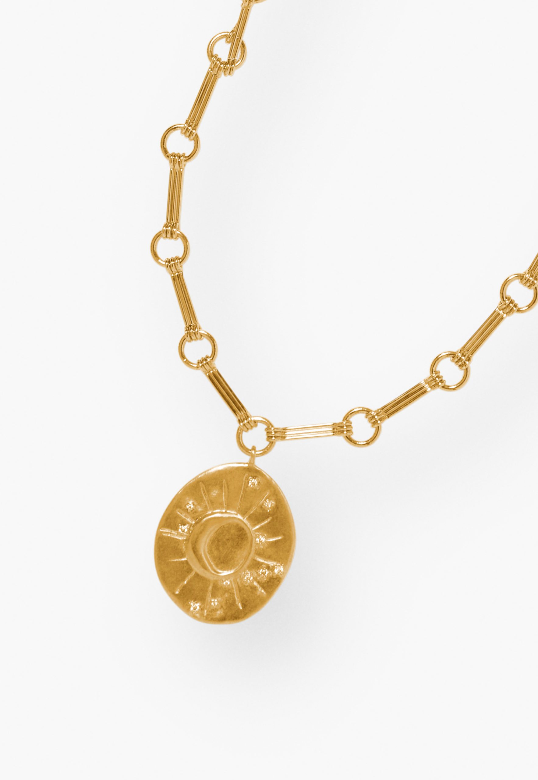 This chunky gold chain is made with a bar-and-hoop design, finished with a matte gold charm. Engraved with sun and moon graphics and trimmed with tiny white zircons that sparkle.