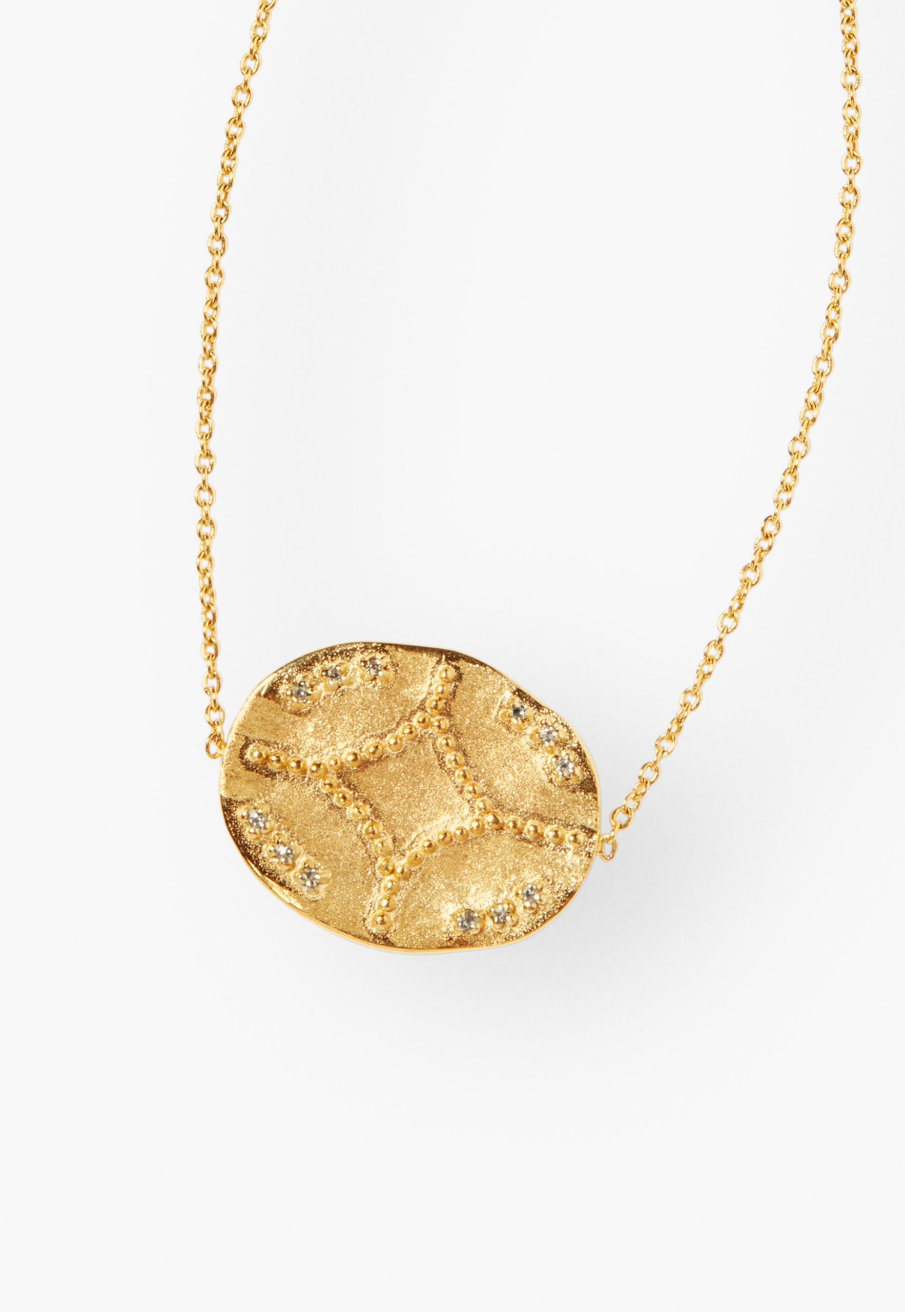 Urban jewellery with a travelling soul from designer Louise Kendricks. A beautiful fine-gold chain bracelet with a brushed gold pendant engraved paved with mini zircons to catch the light.