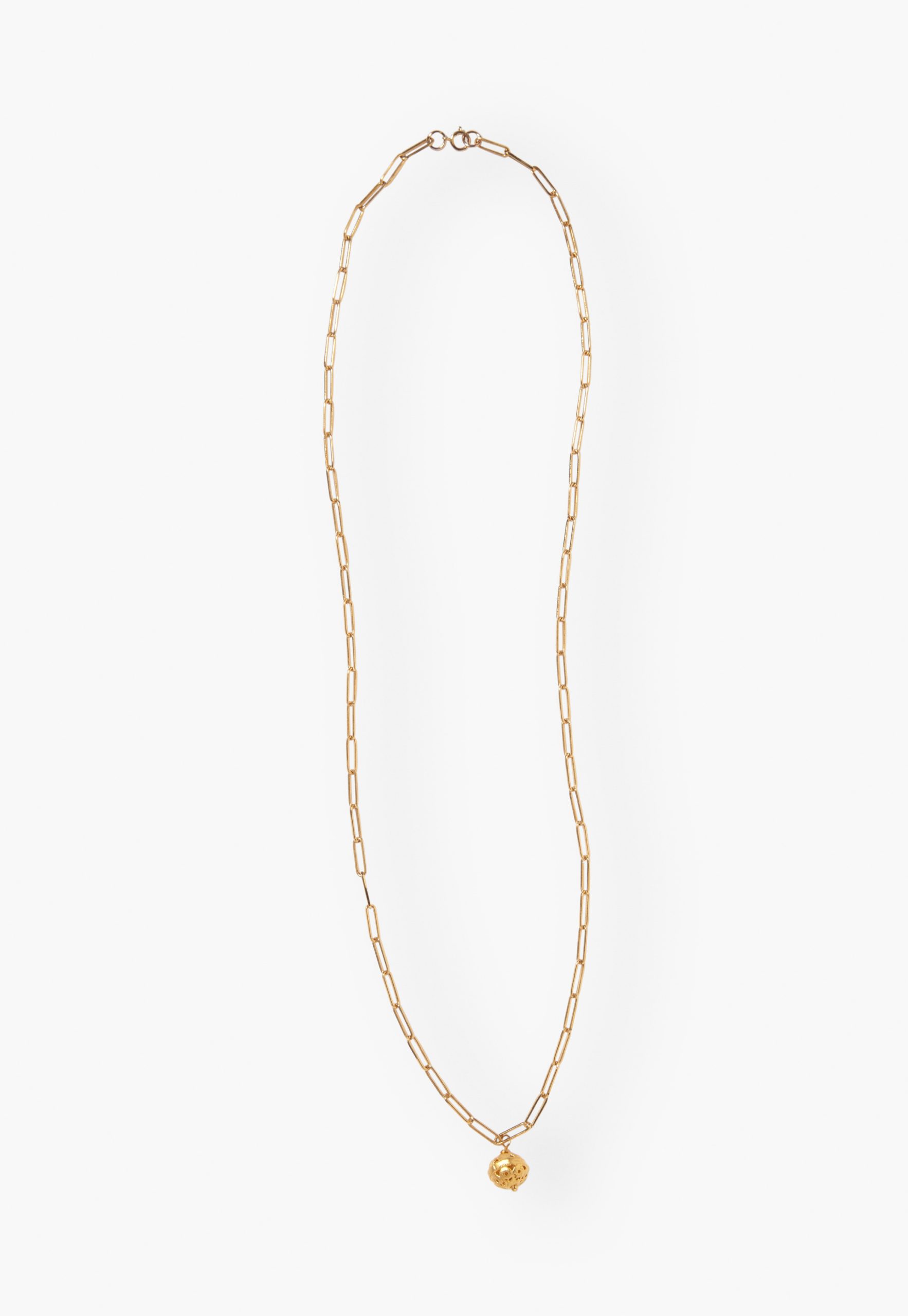 A long paperclip-chain necklace finished with a filigree ball charm.
