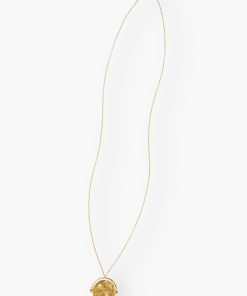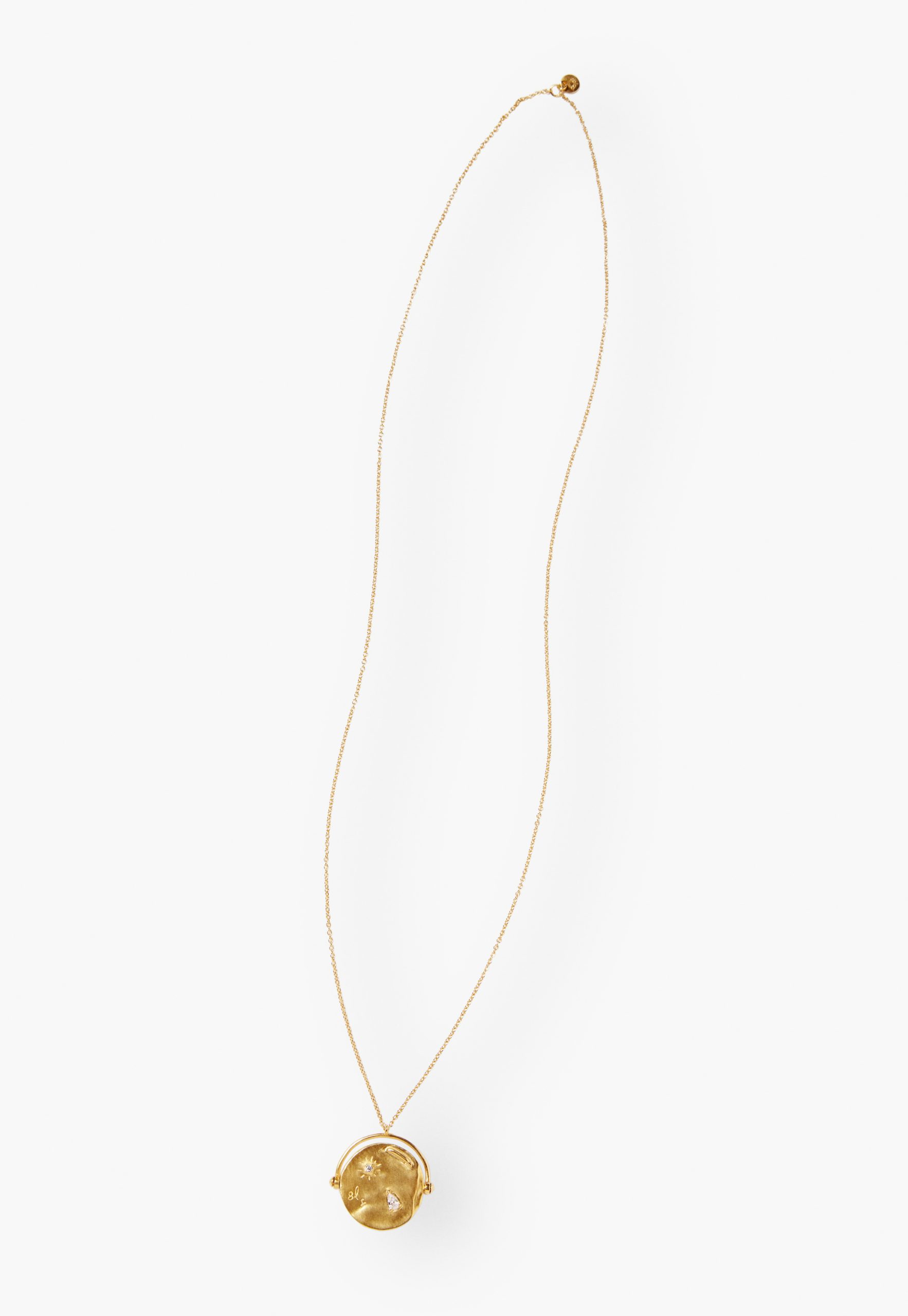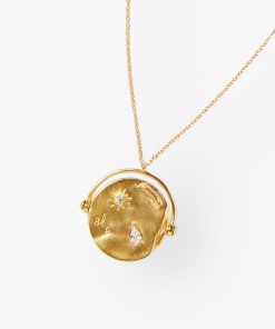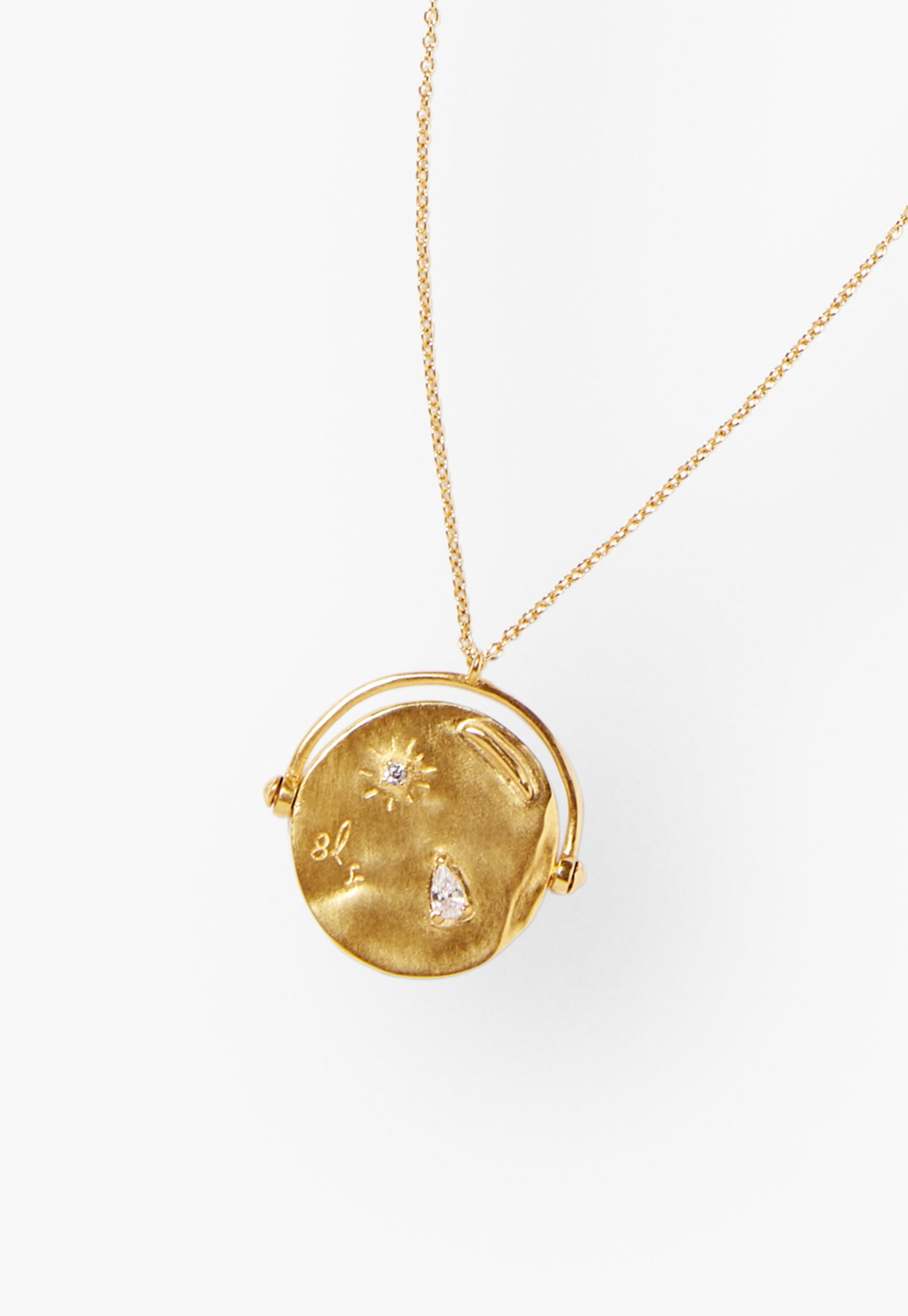 Urban jewellery with a travelling soul from designer Louise Kendricks. A playful reversable matte gold pendant engraved and set with zirconia hangs from a fine gold chain.