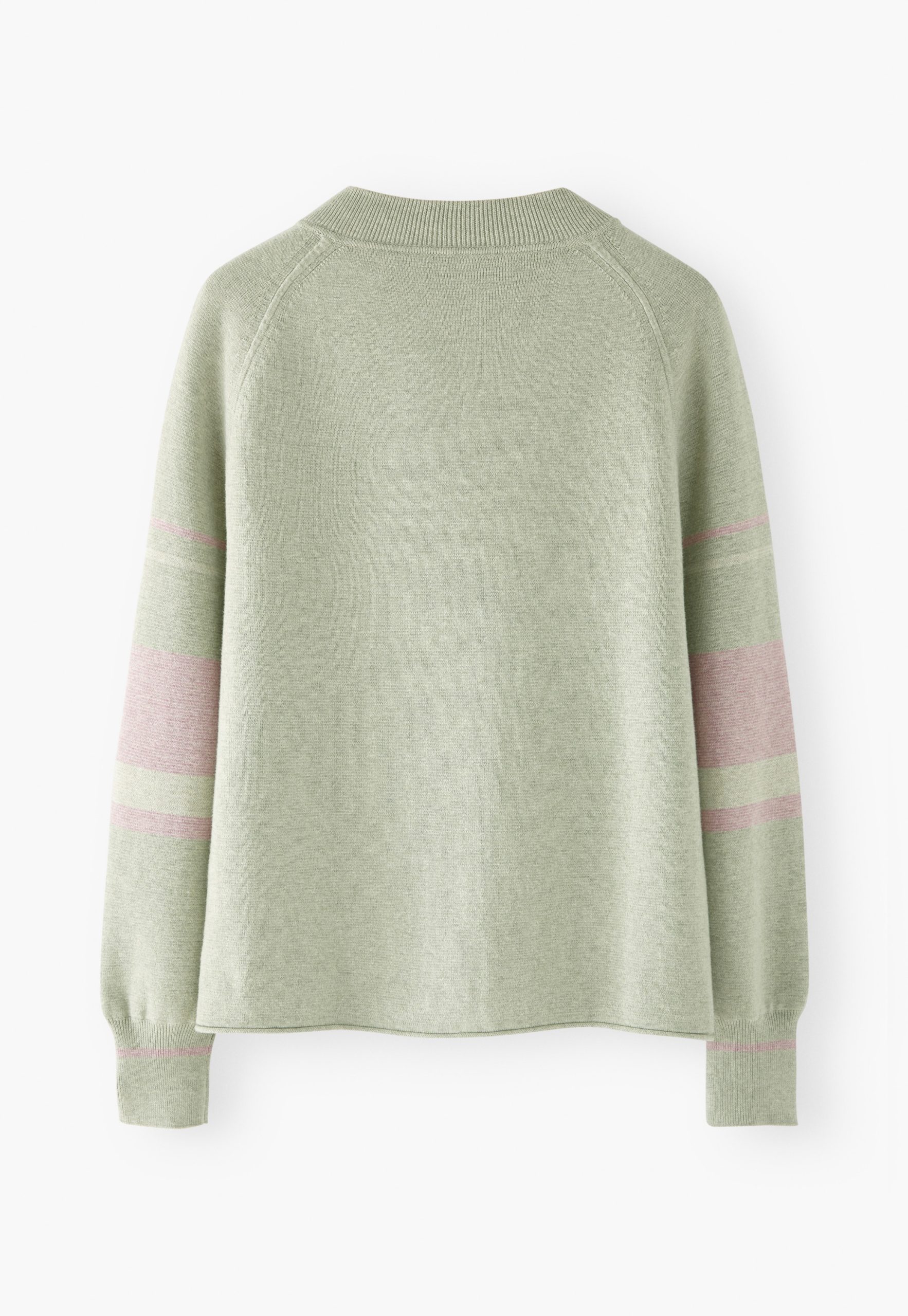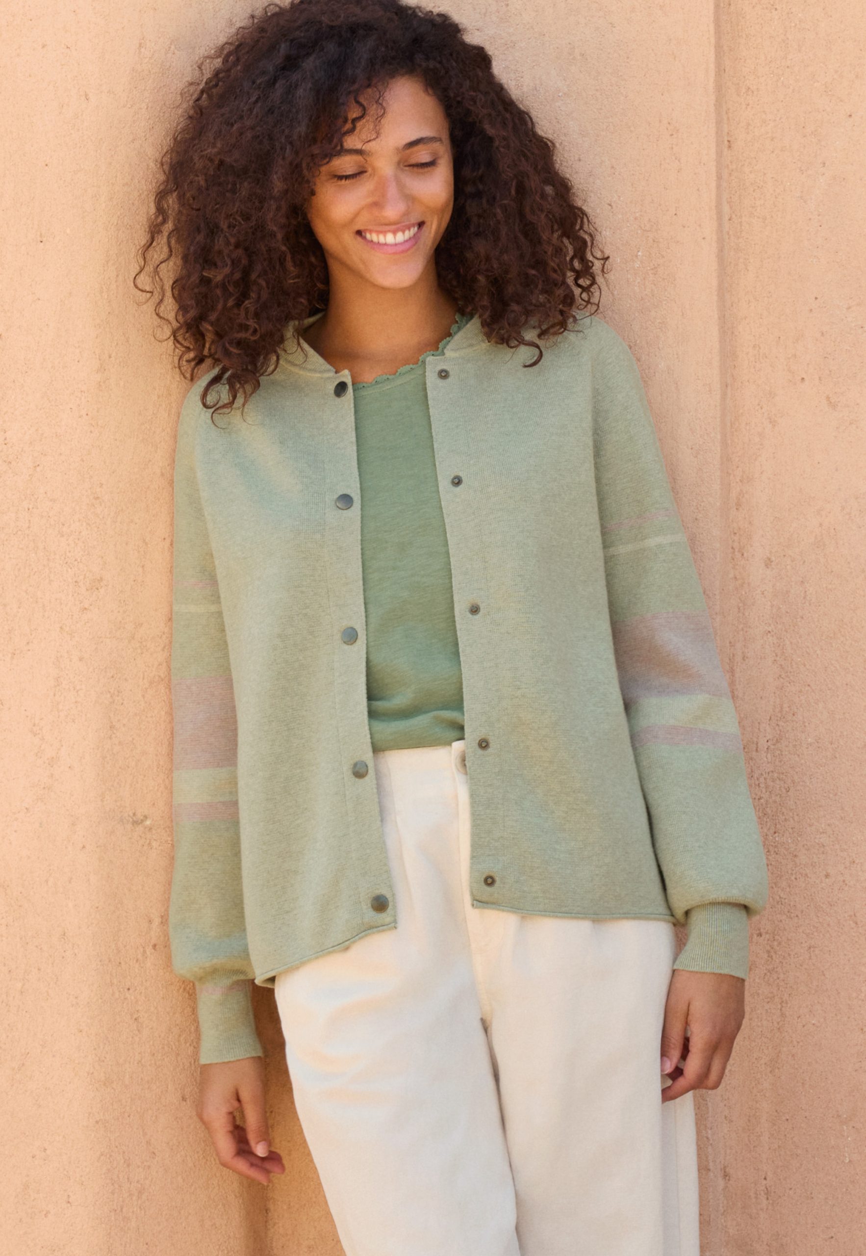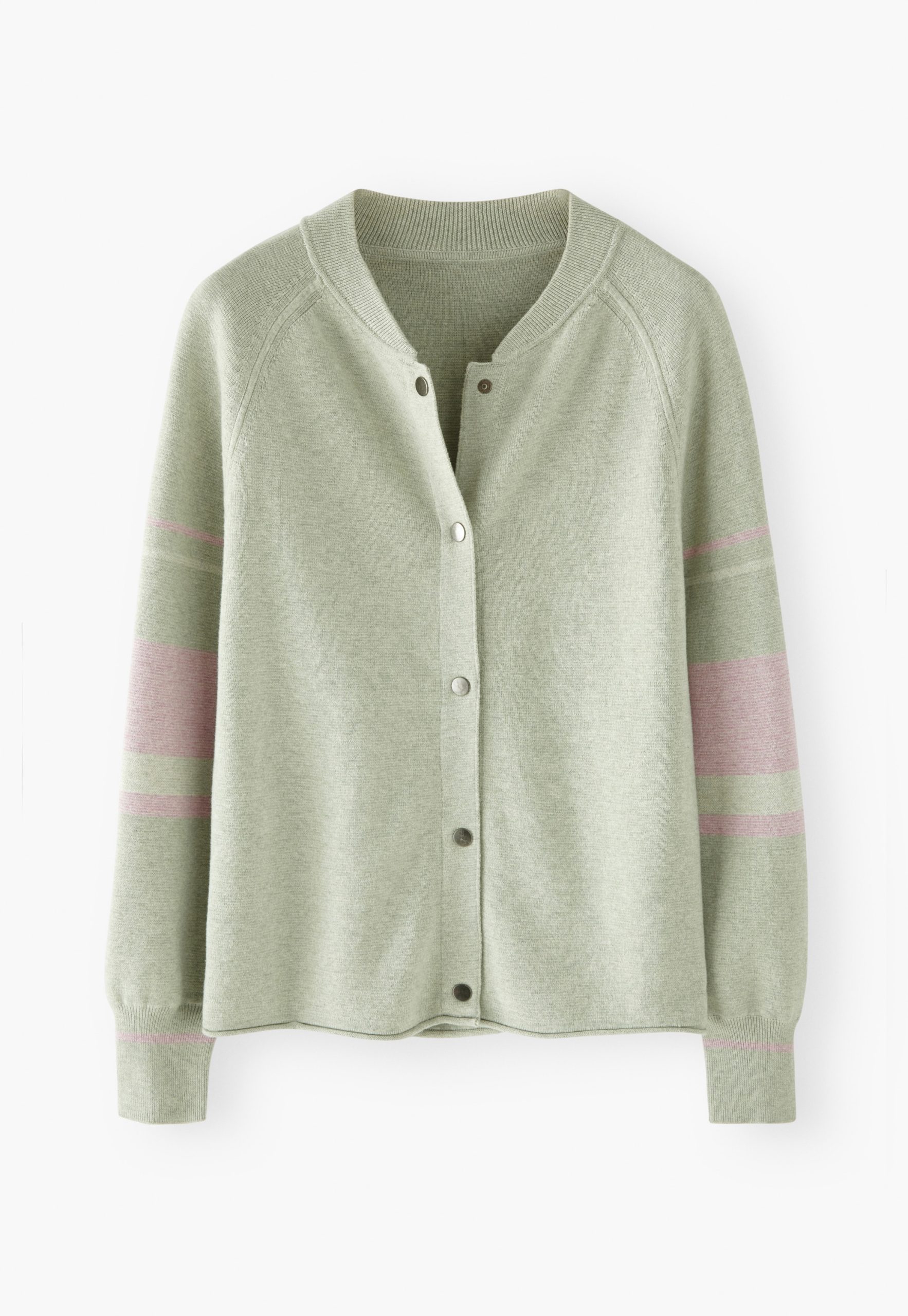 There’s a touch of bomber jacket styling with this smooth knitted cotton jacket. It’s beautifully finished with neat stripy rib cuffs and a roll-back detail at the hem.