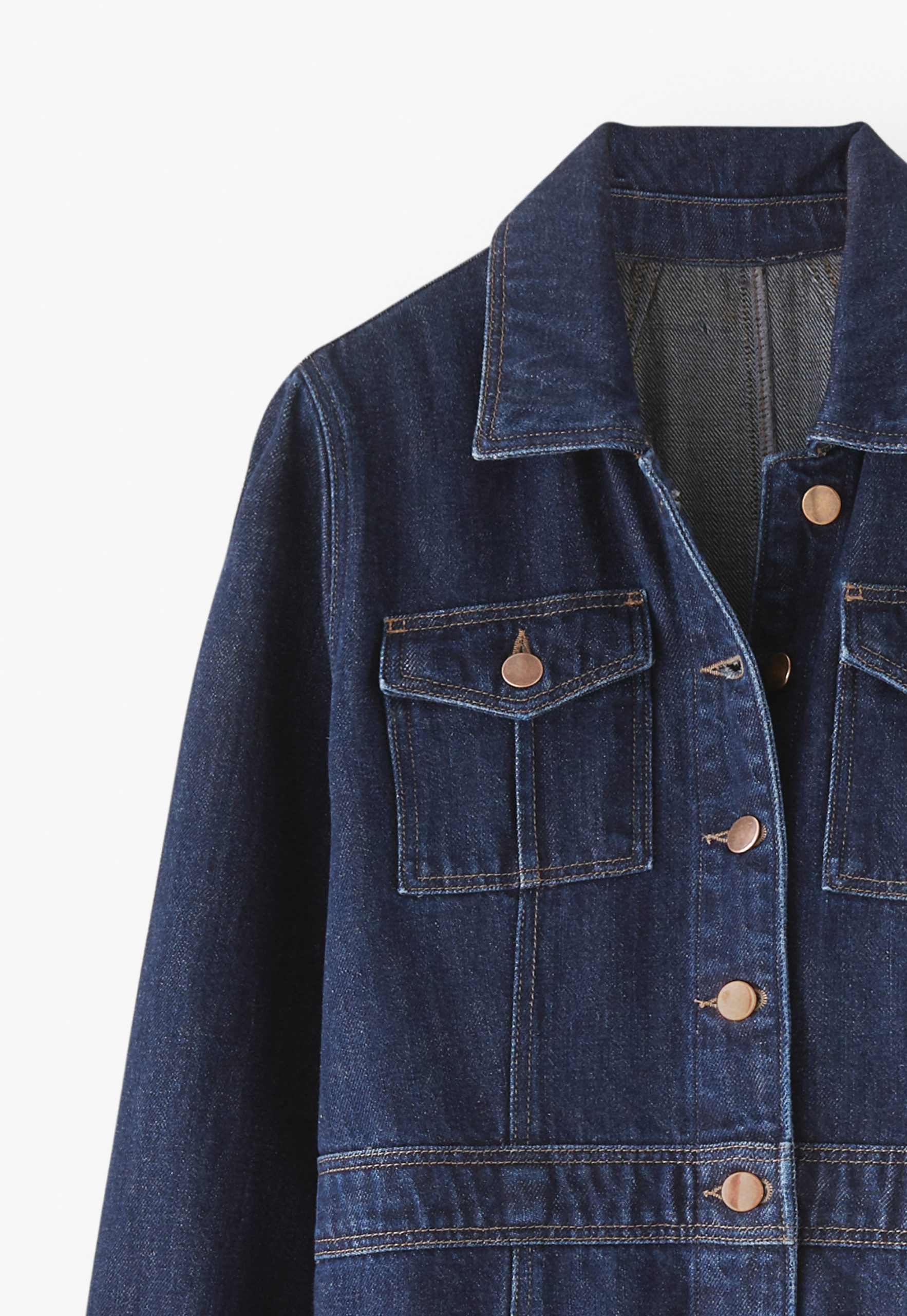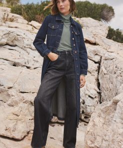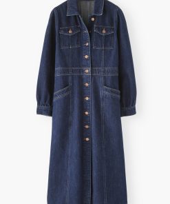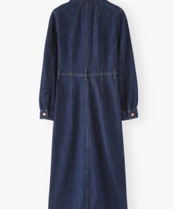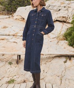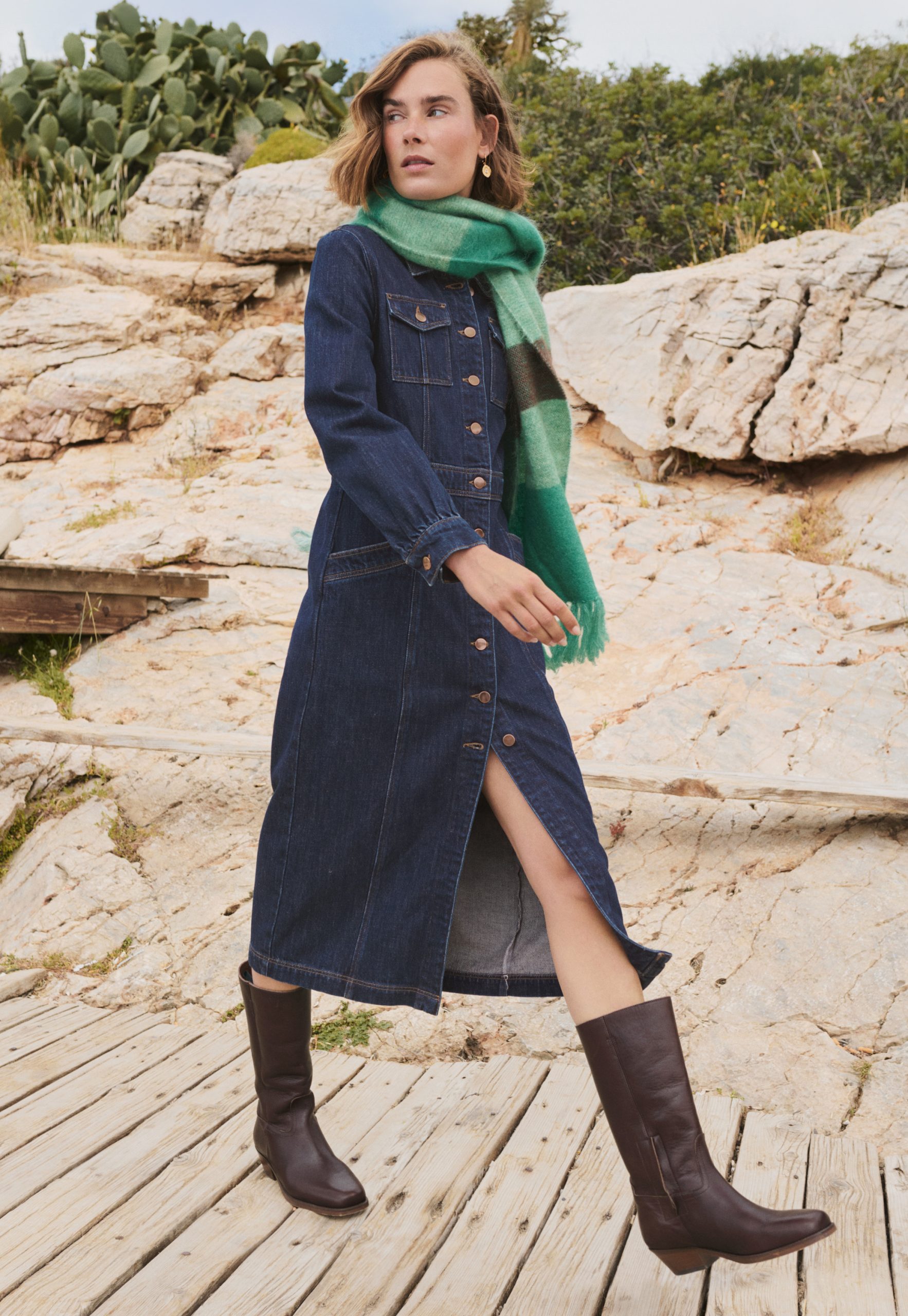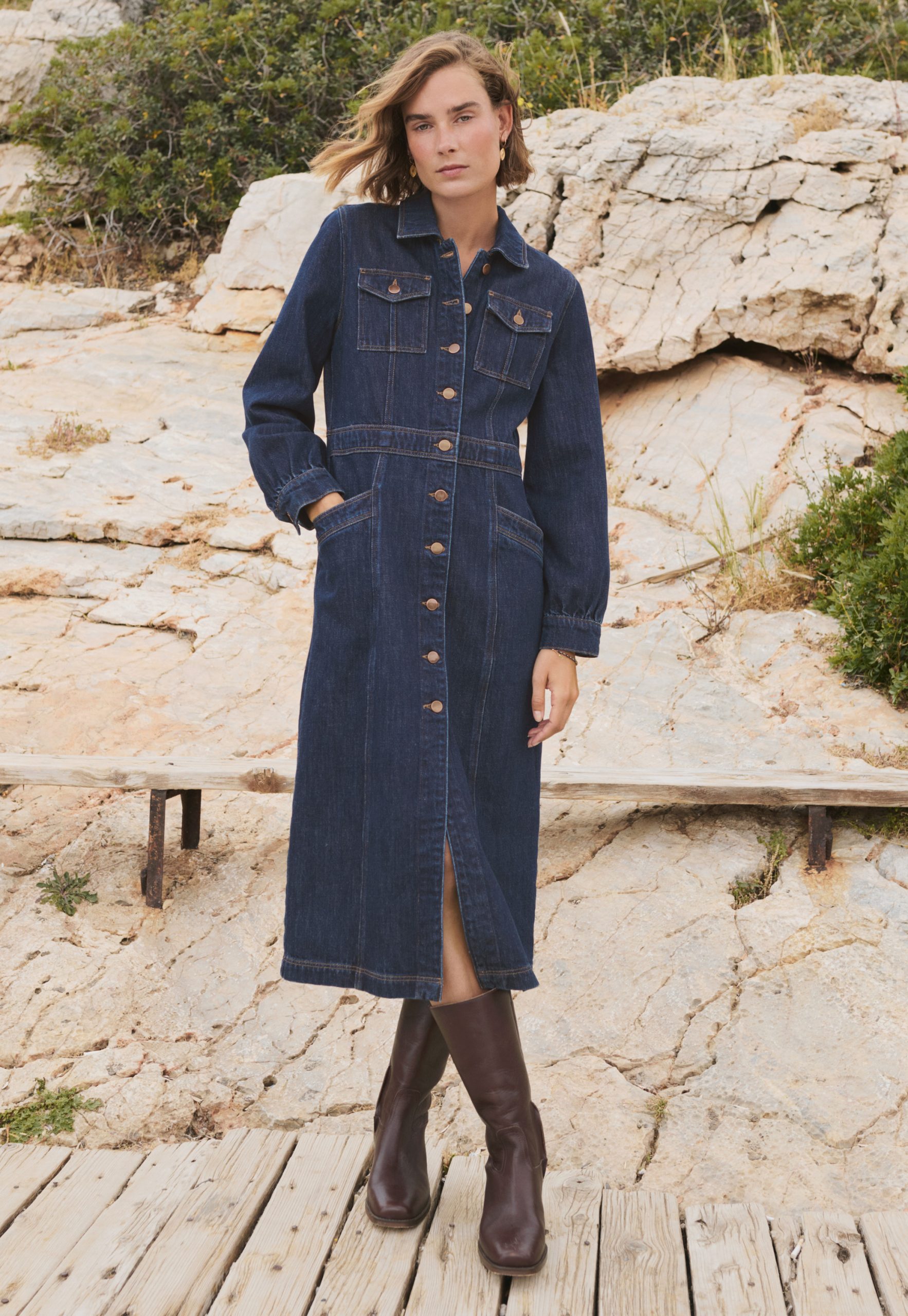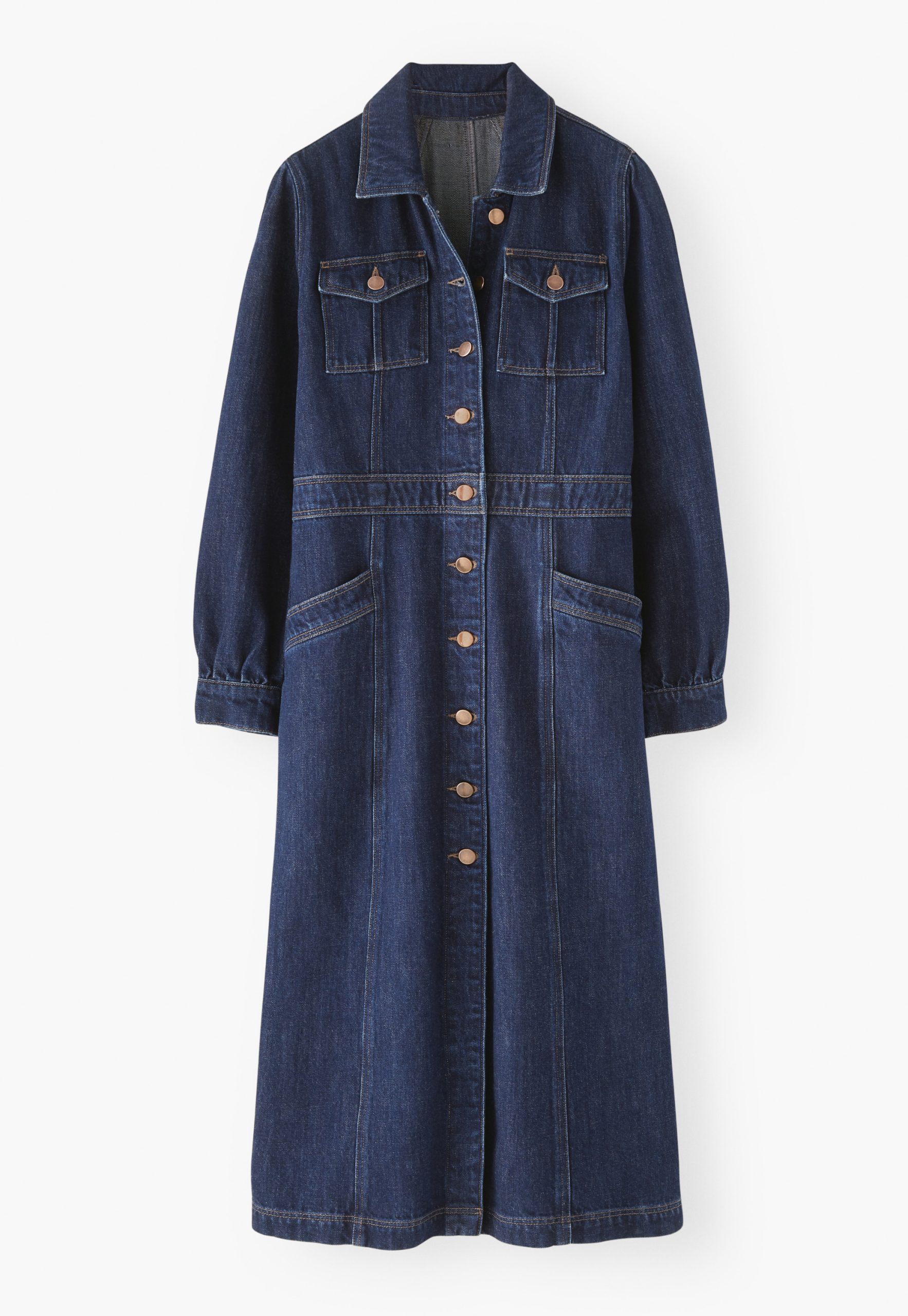A deep indigo shirtdress made from substantial cotton and hemp denim. In a straight, regular fit with utility styling – copper hardware and contrast stitching. Wear with bare legs and trainers until the temperature drops.