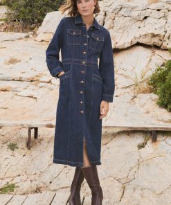 A deep indigo shirtdress made from substantial cotton and hemp denim. In a straight, regular fit with utility styling – copper hardware and contrast stitching. Wear with bare legs and trainers until the temperature drops.