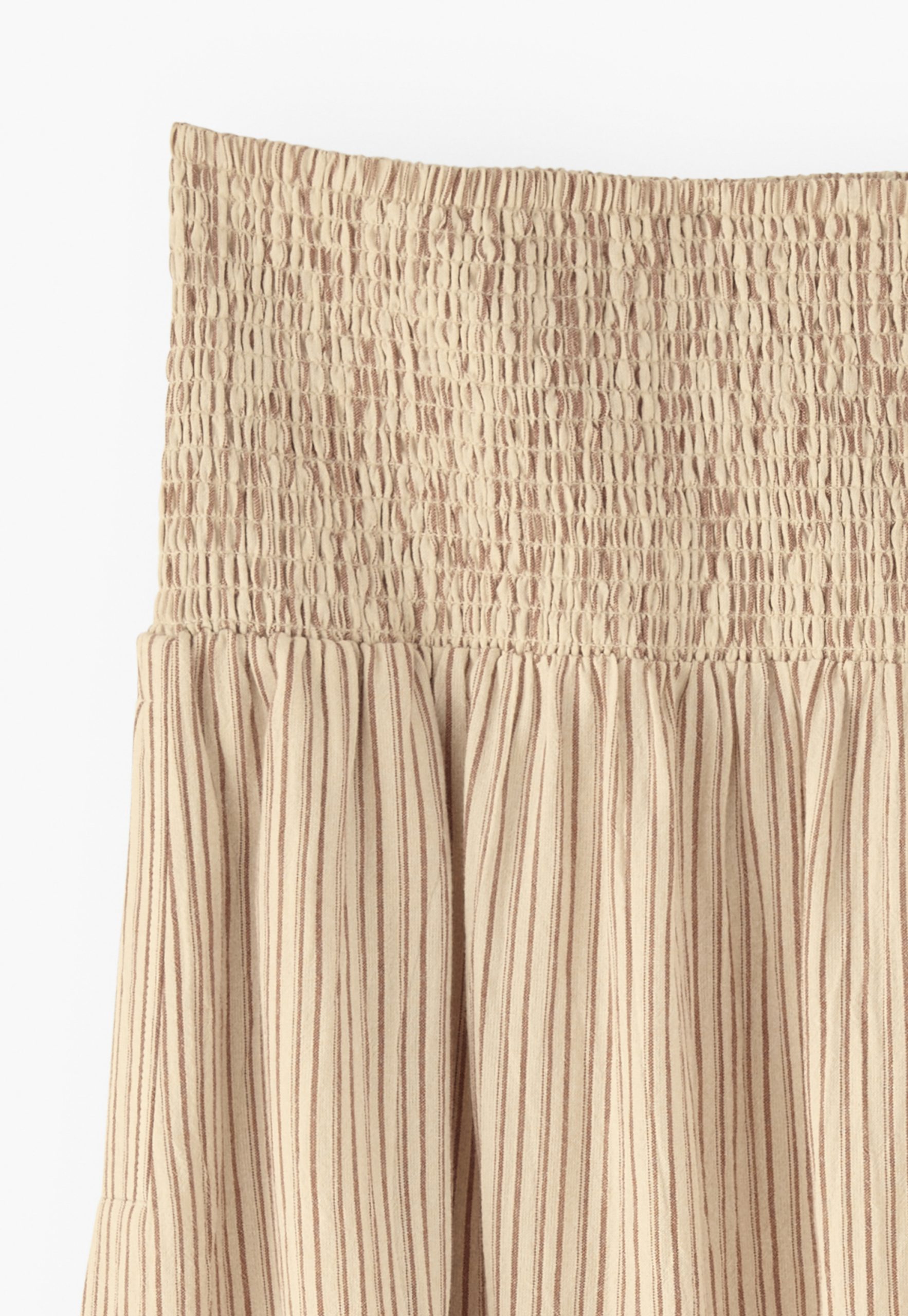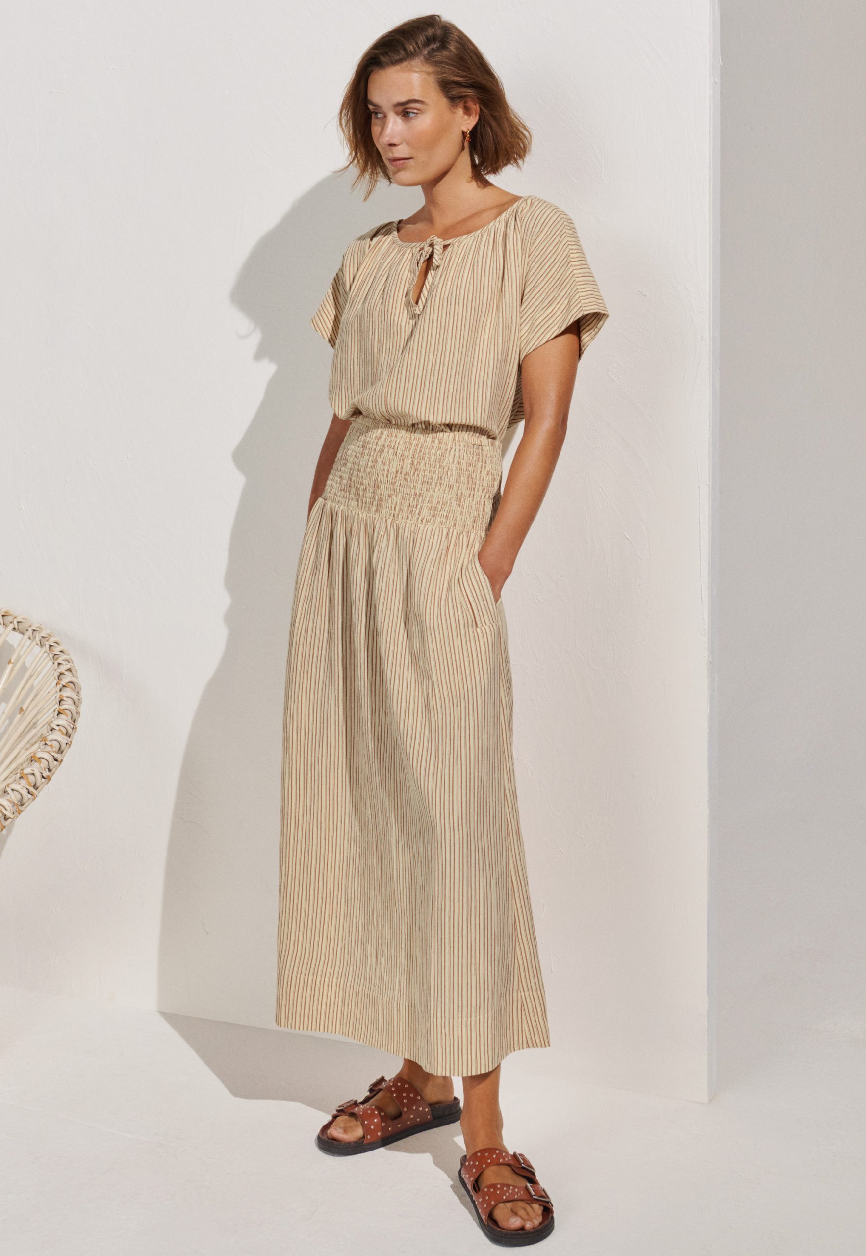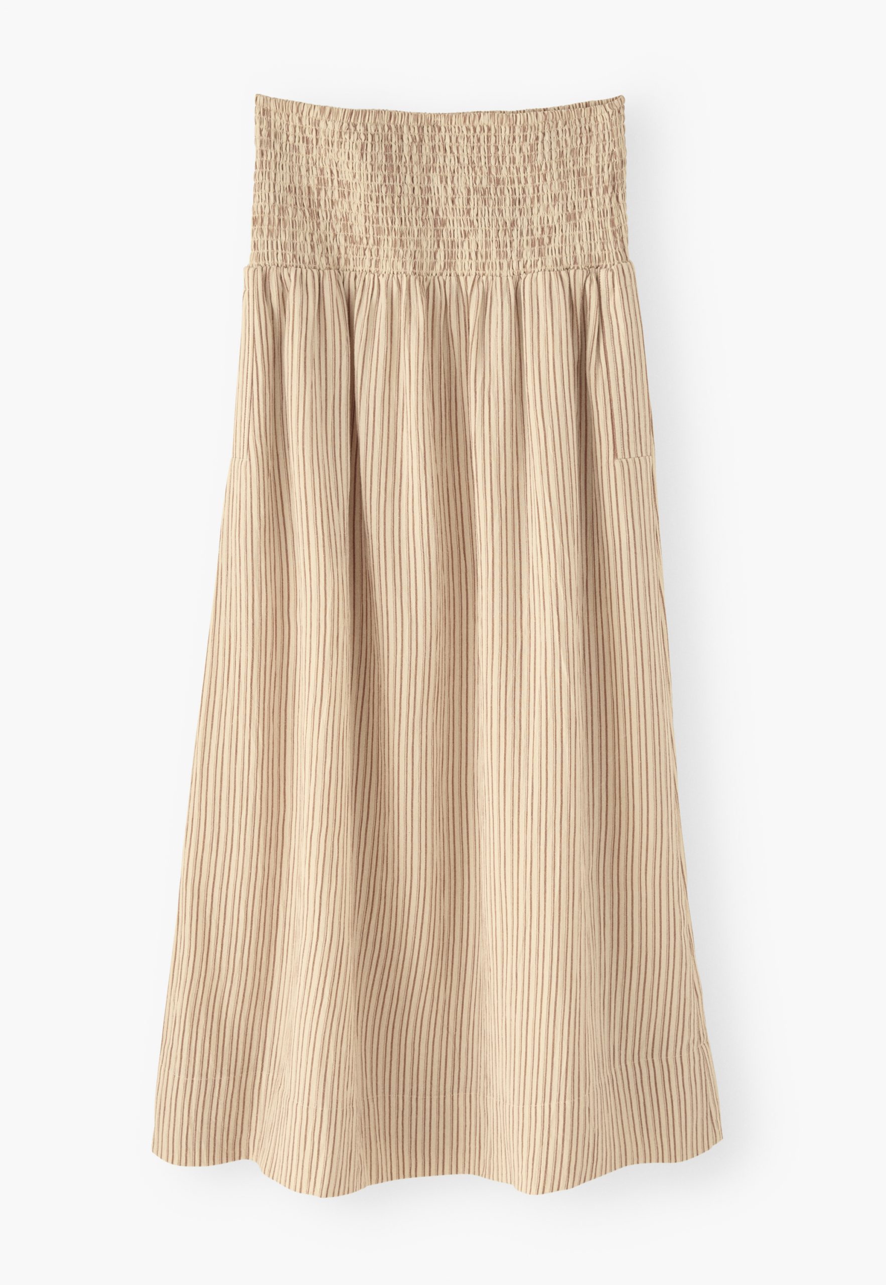 A cool and comfortable softly crinkled textured maxi-skirt with a deep elasticated waistband. Pair with the matching stripy blouse or mix it up with a contrasting vest or T-shirt.