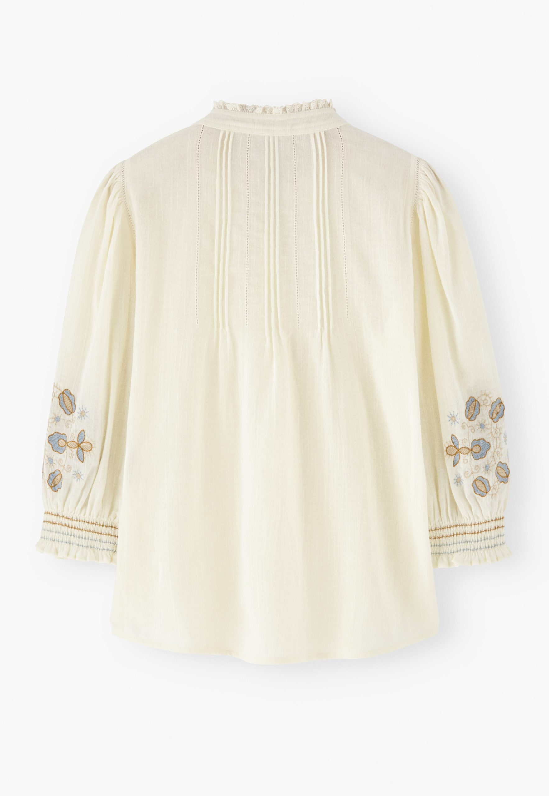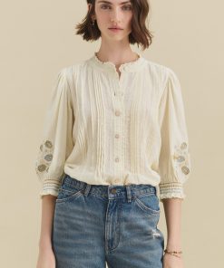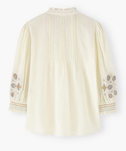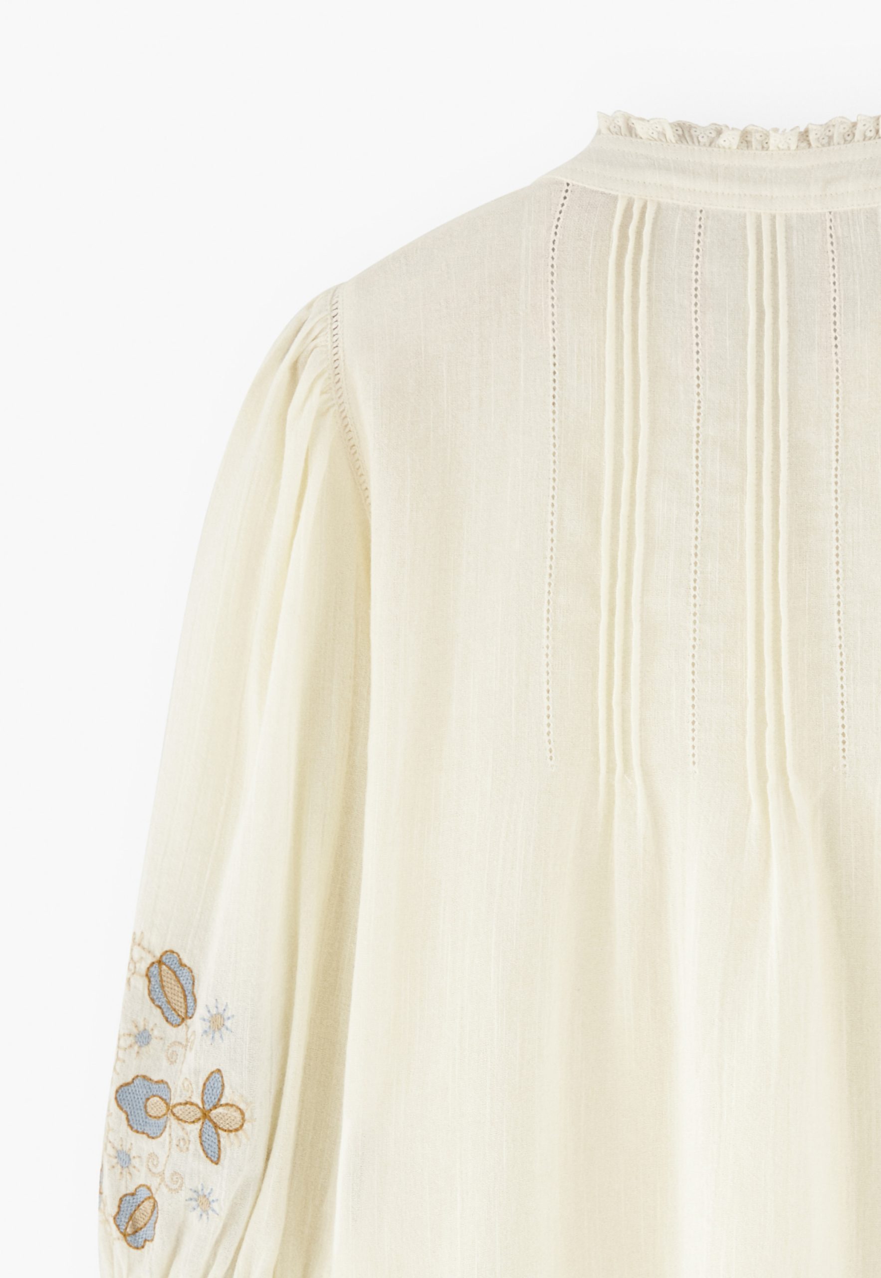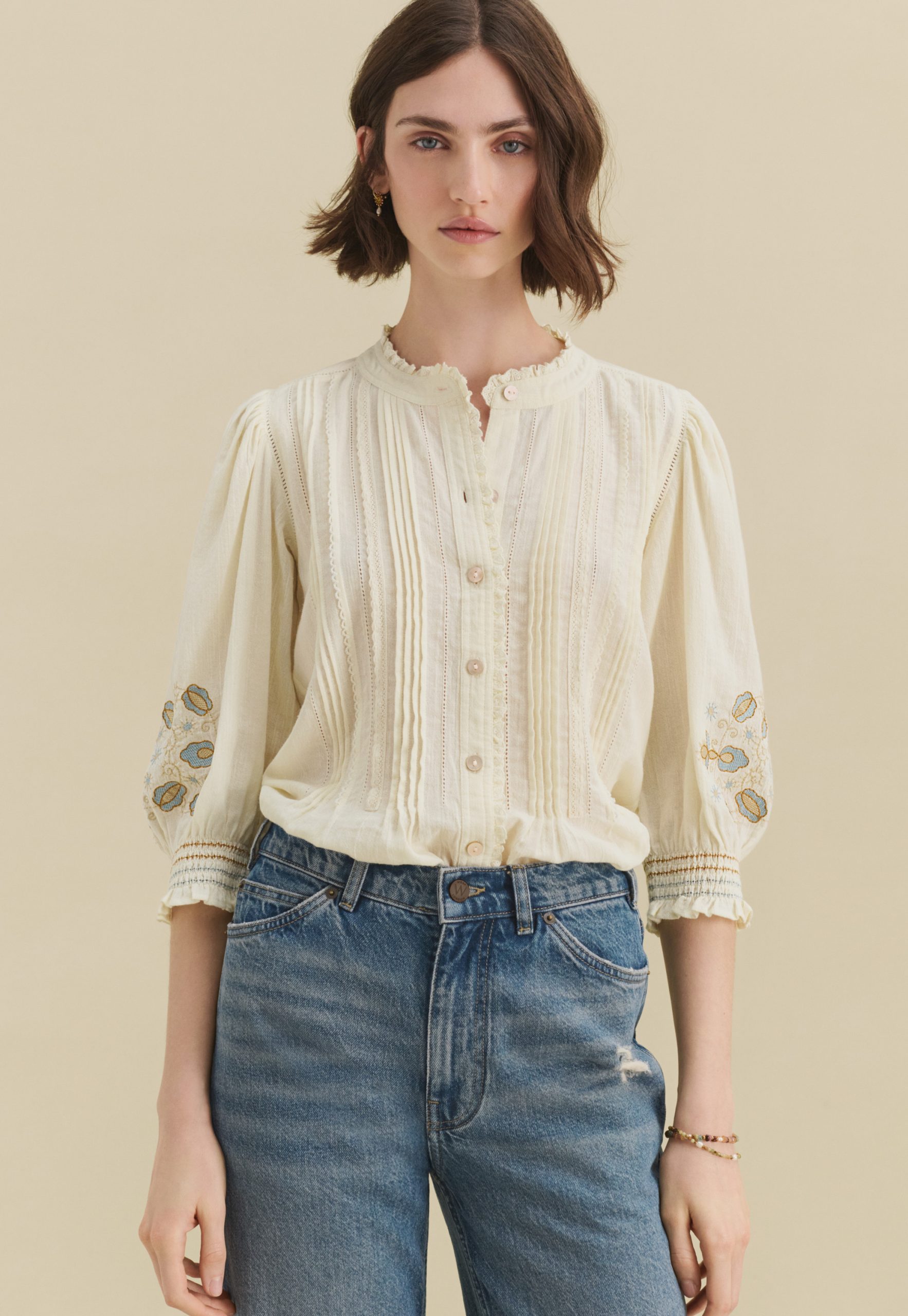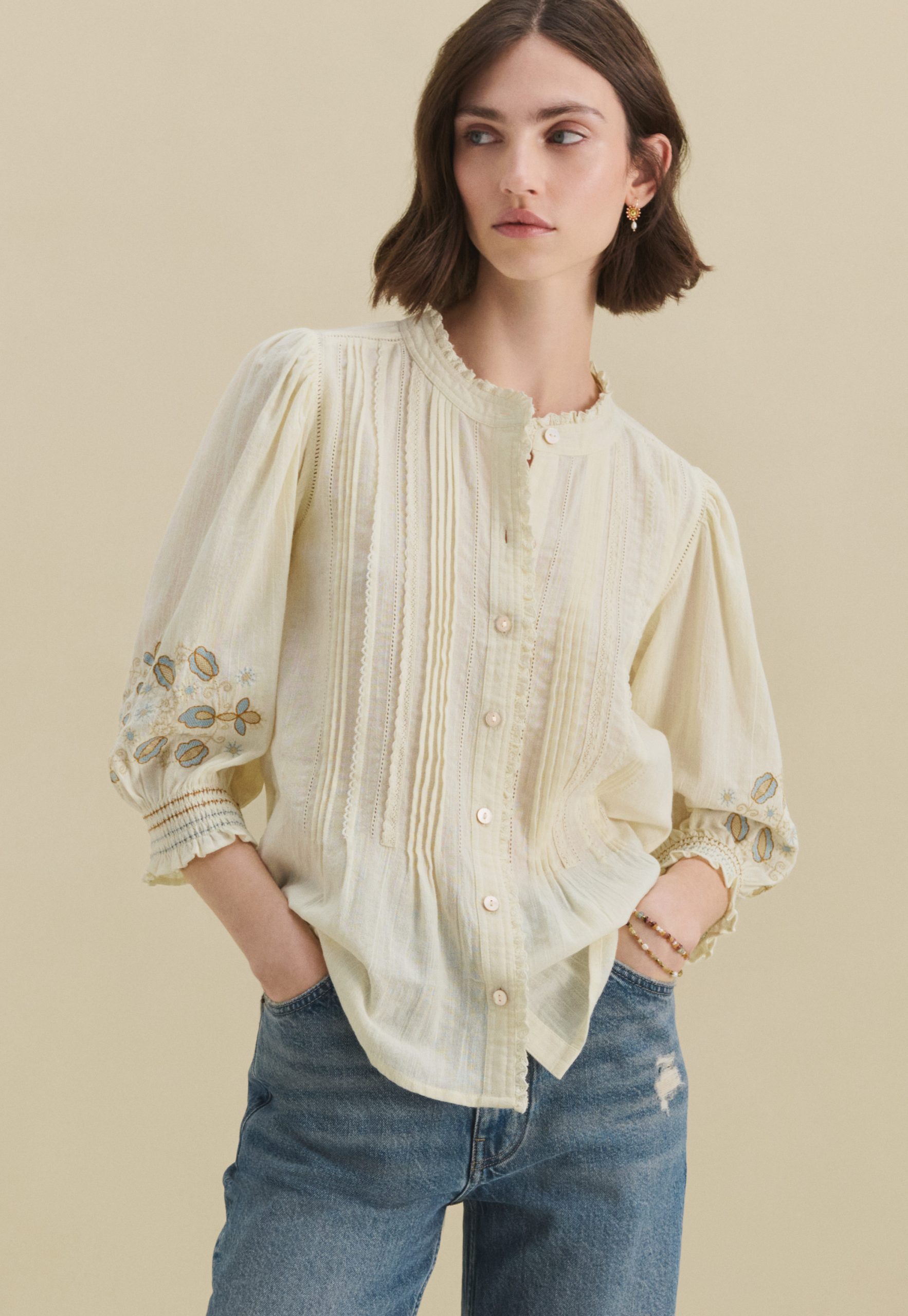 A breezy cotton blouse with intricate abstract floral embroidery on the blouson sleeves. In a relaxed fit with lace and pintuck details front and back, it’s perfect weekend brunch wear.