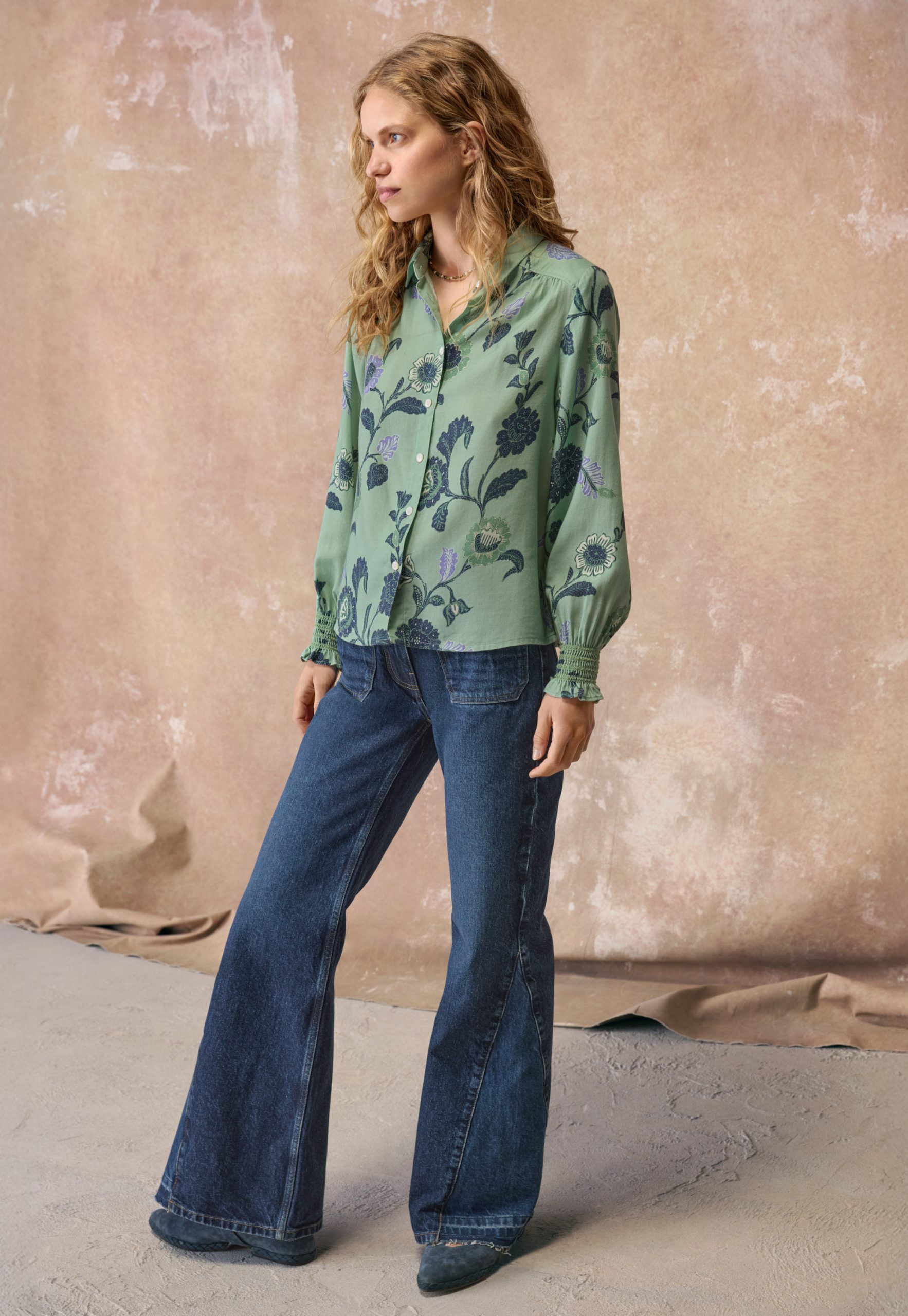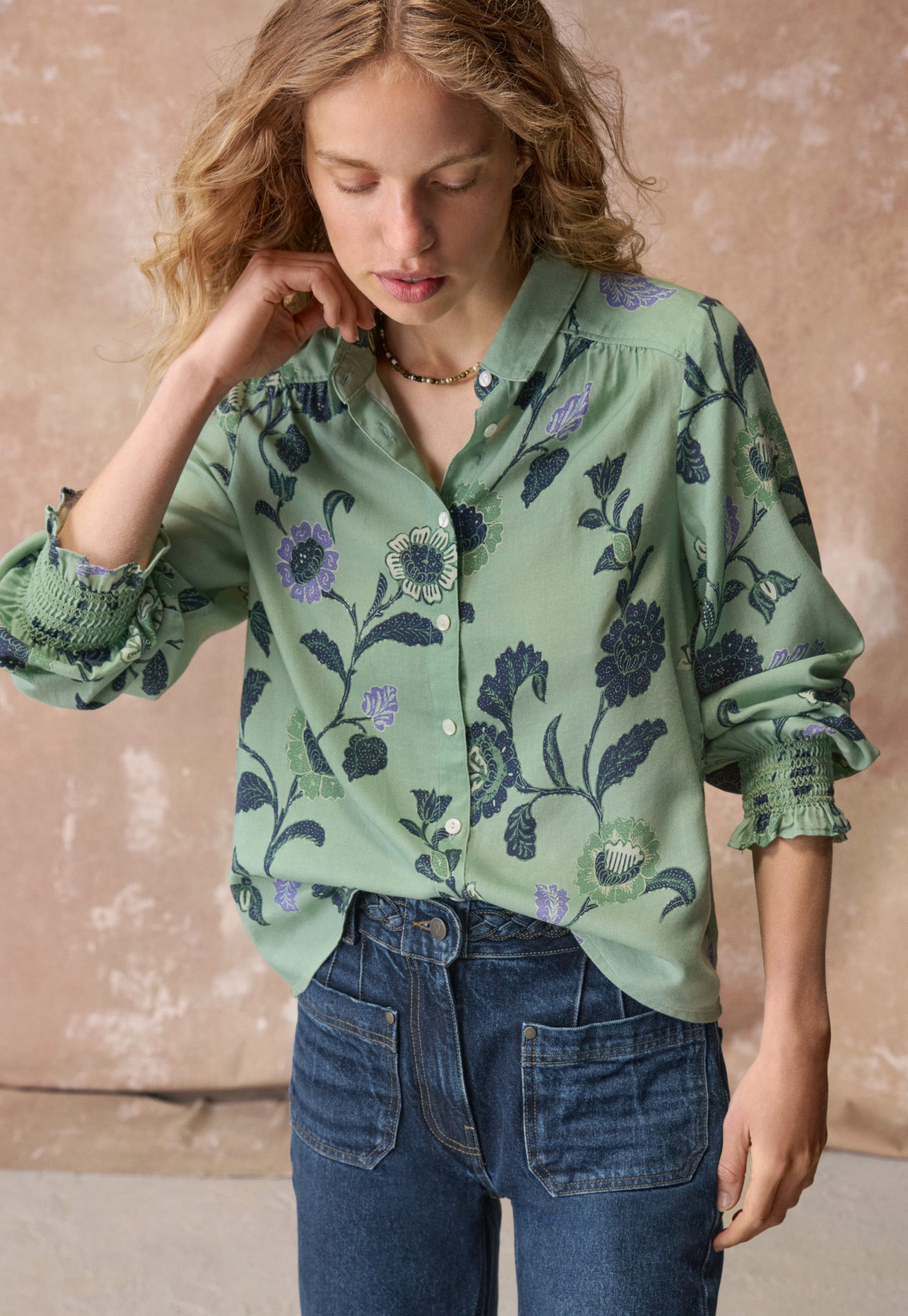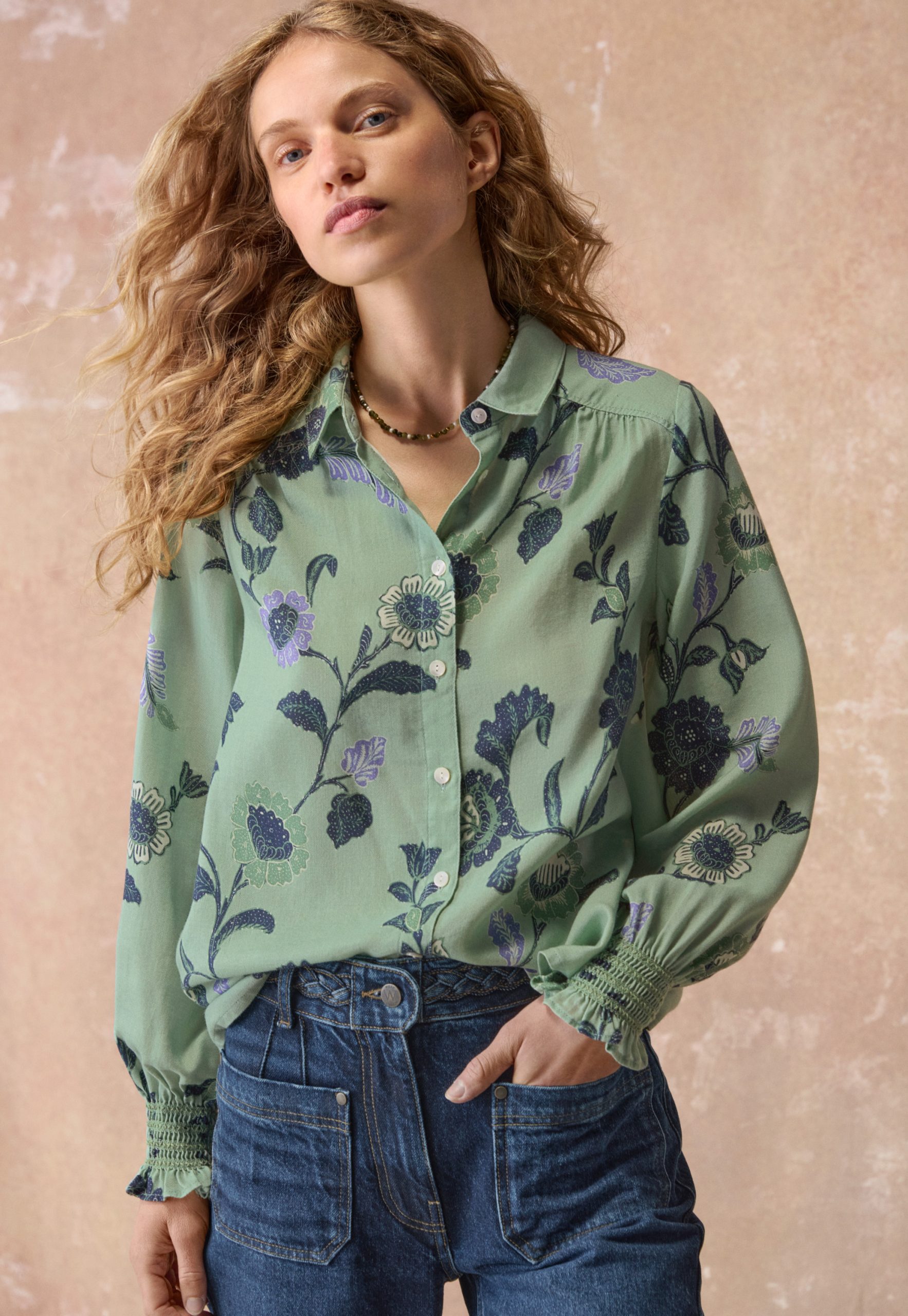 A bold, botanical exclusive Wrap London print flows over this soft blouse in lyocell cotton and wool. Light and warm, it’s beautifully detailed with shirring at the cuffs and gathers at the shoulders. Something special to wear with denim.