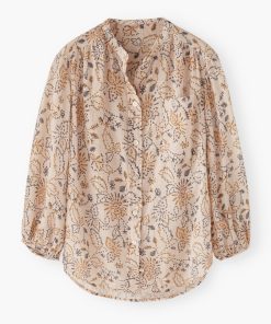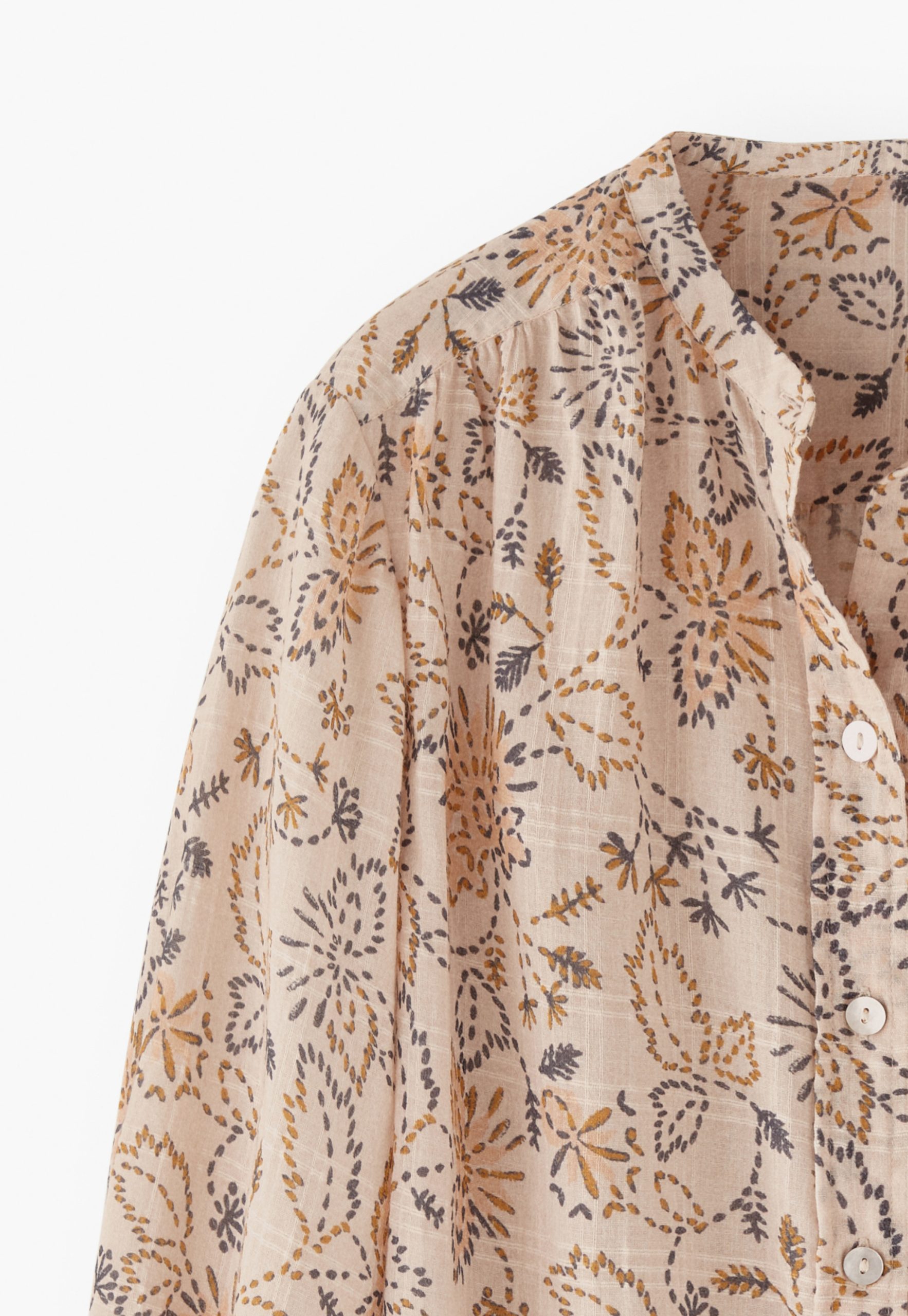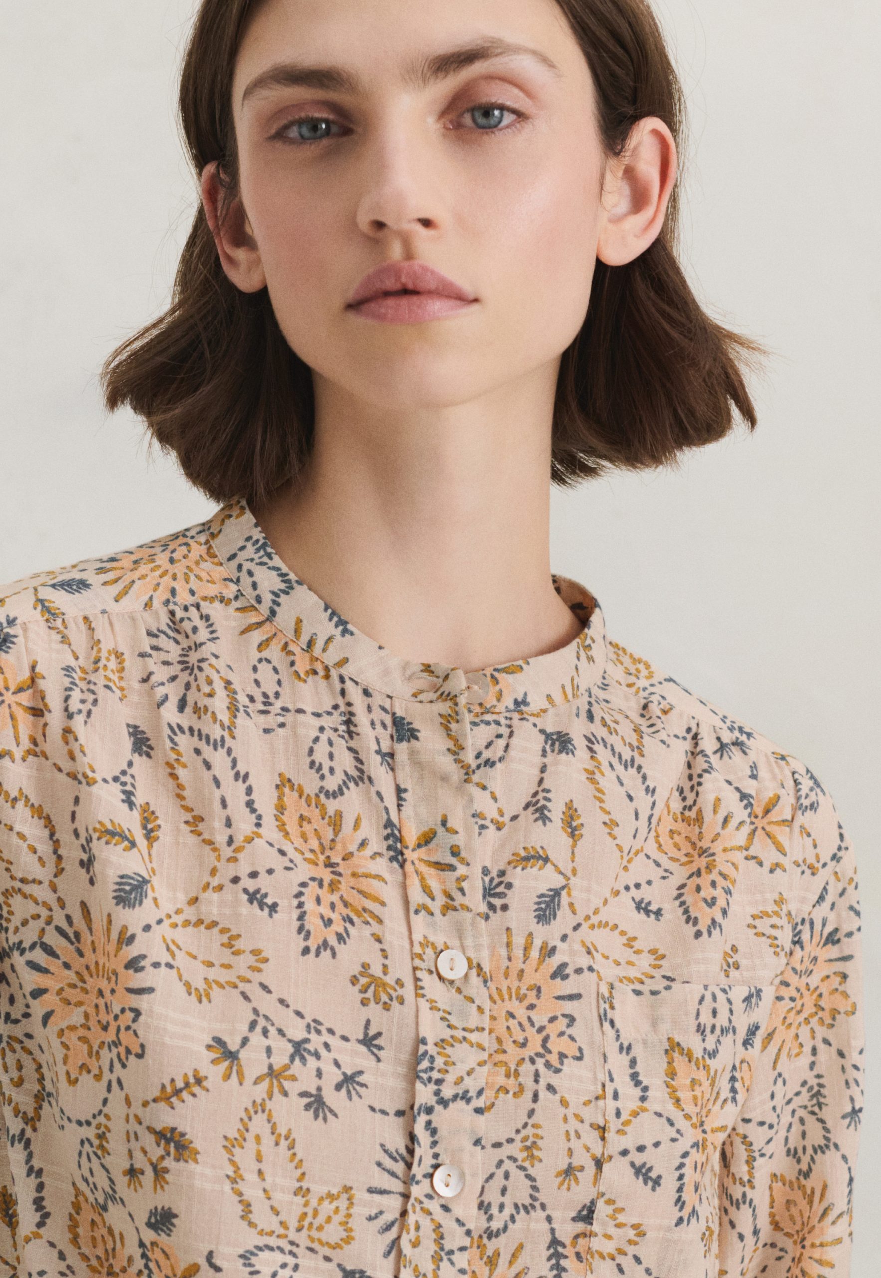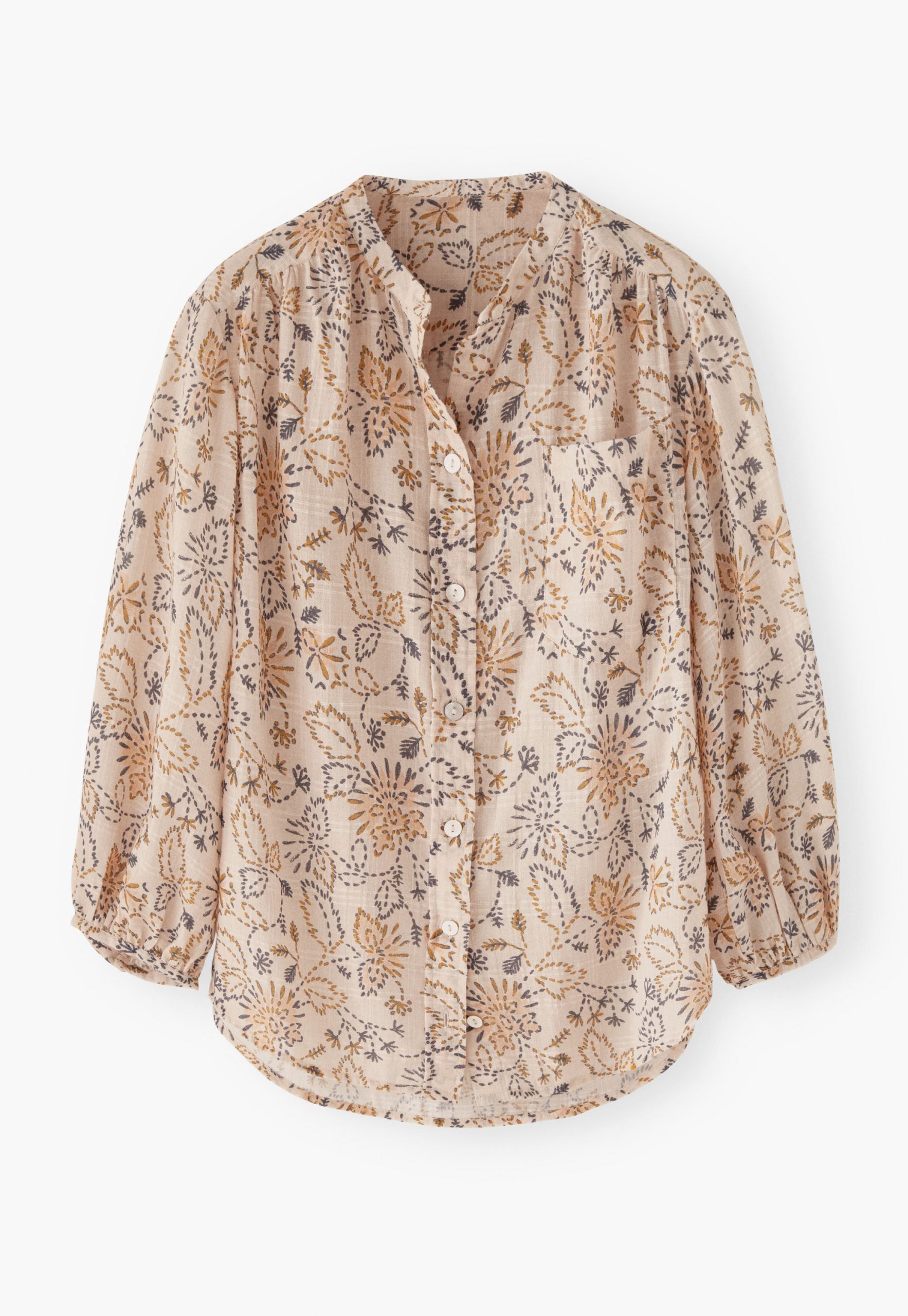 A cheering printed shirt in lightweight cotton in a relaxed fit with a neat round neckline and breezy three-quarter length blouson sleeves. A great pairing with denim or worn undone over a T-shirt or vest.