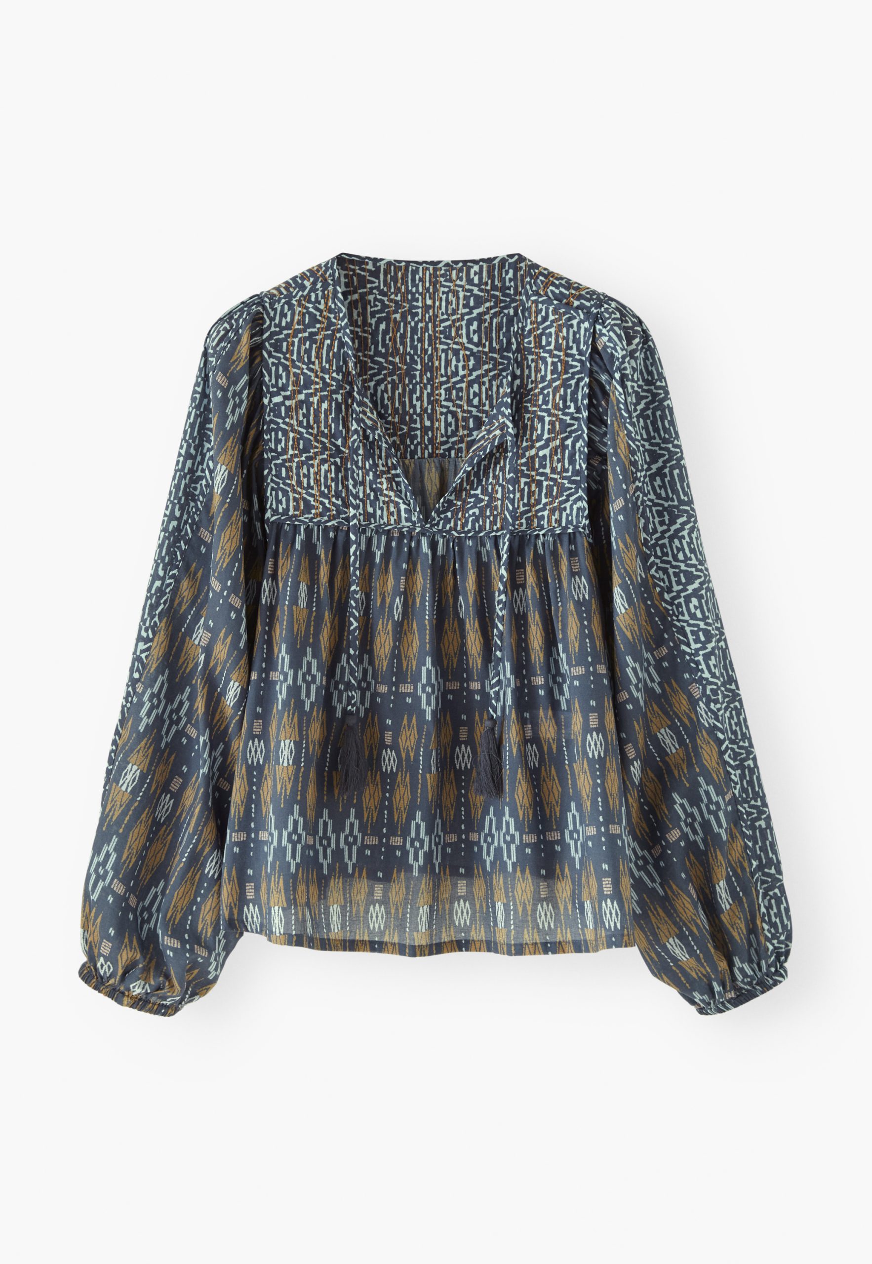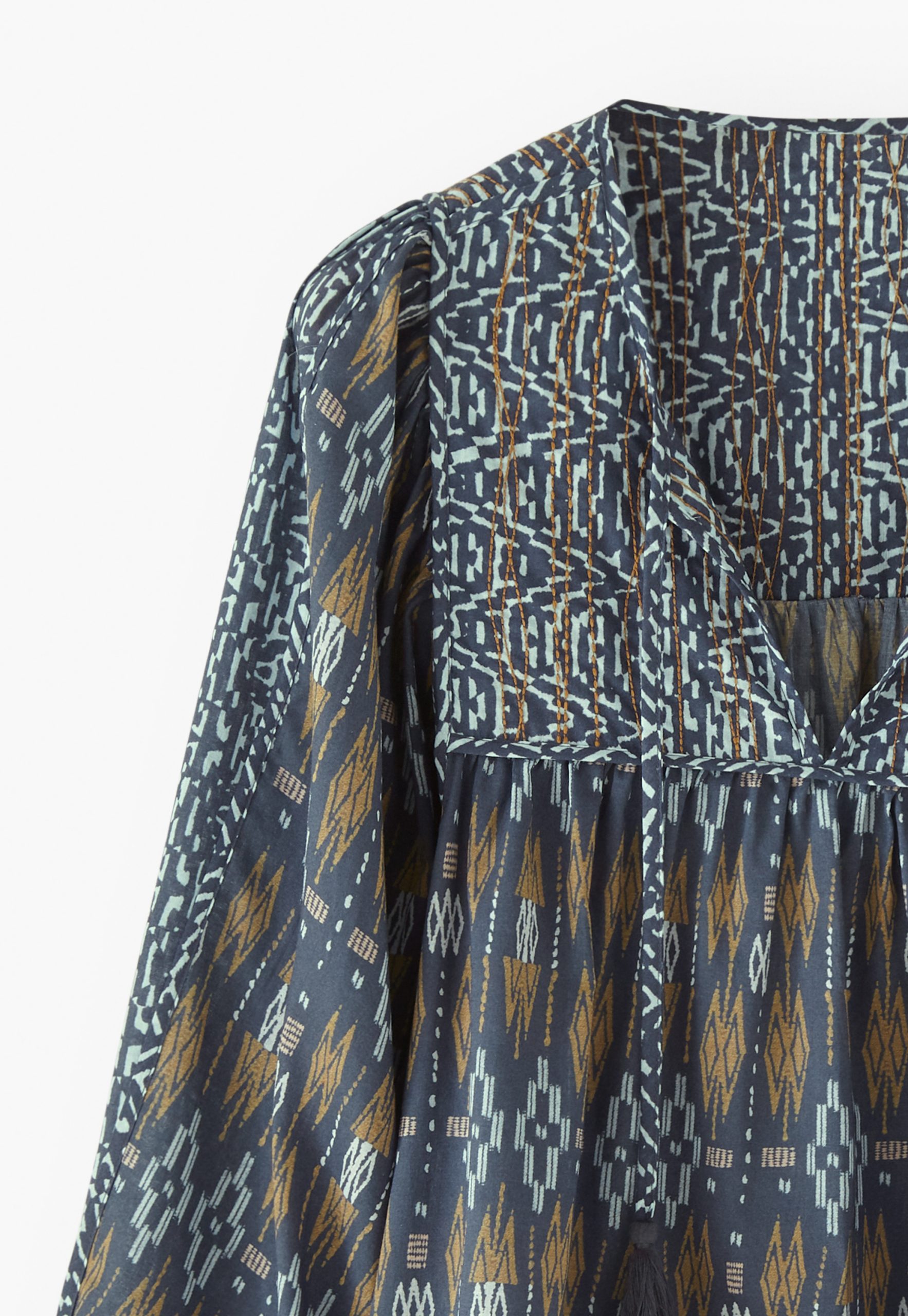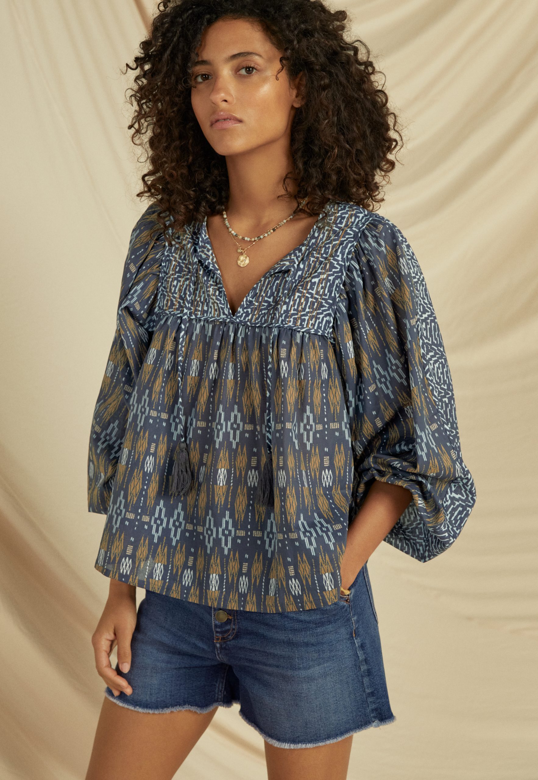 A soft and lightweight cotton blouse featuring an exclusive Wrap London print. We love the notch-neckline with its embroidery detail and playful tassel tie detail.