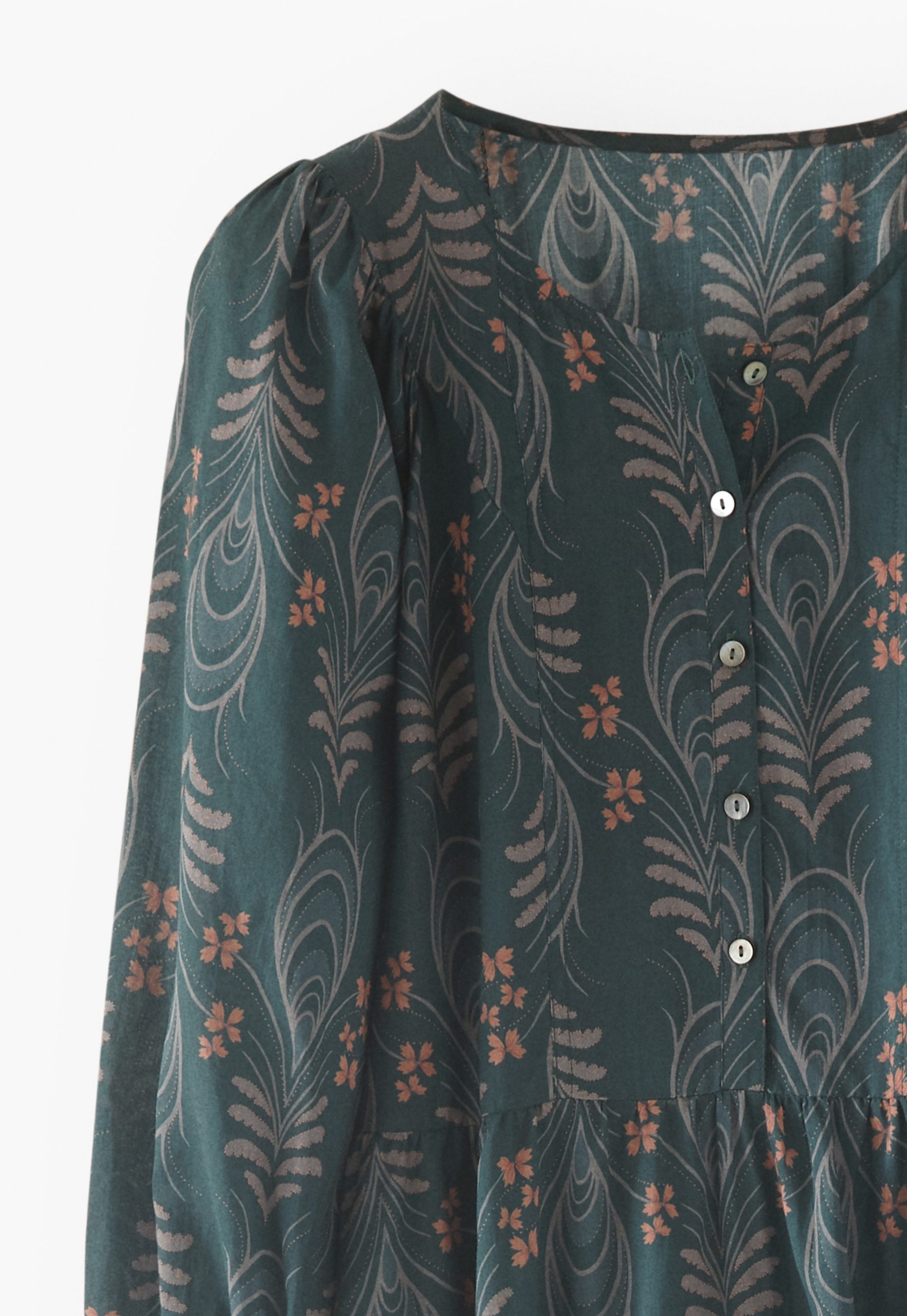 - Gathers at shoulders and cuffs