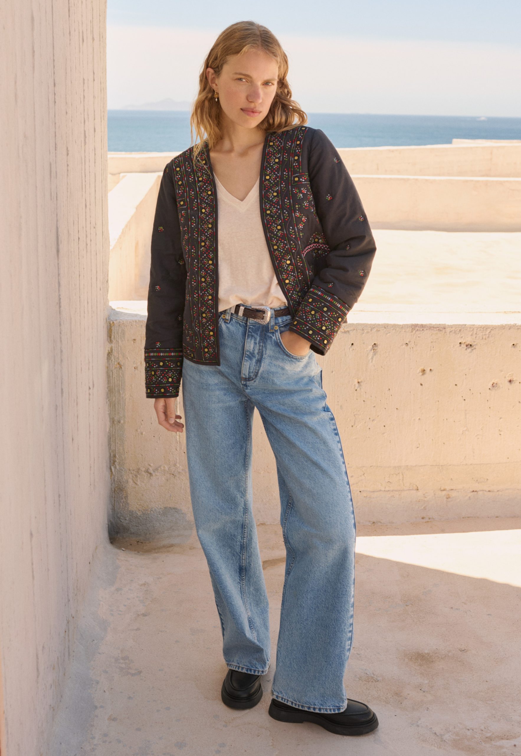A fabulous finishing touch to your outfit, this softly quilted jacket is incredibly detailed with all-over embroidery to catch the eye and metal sequins to catch the light. In a regular fit with edge-to-edge styling, it even has hidden pockets at the front. Fully lined.