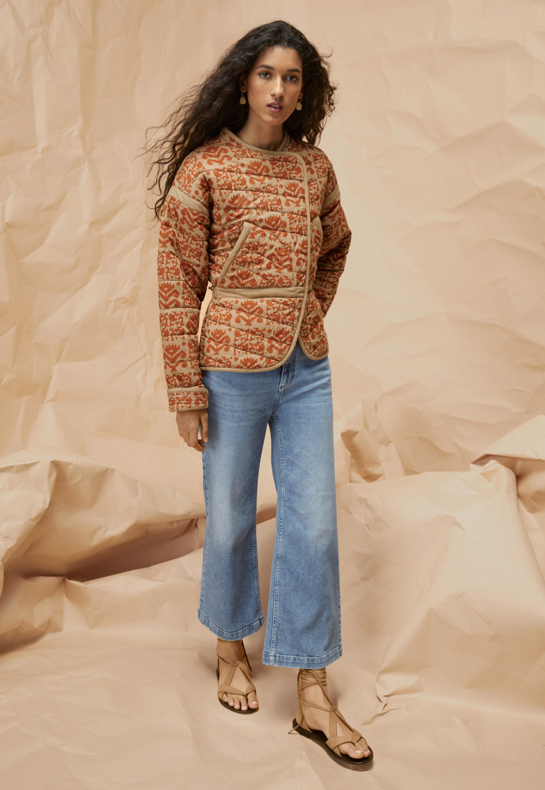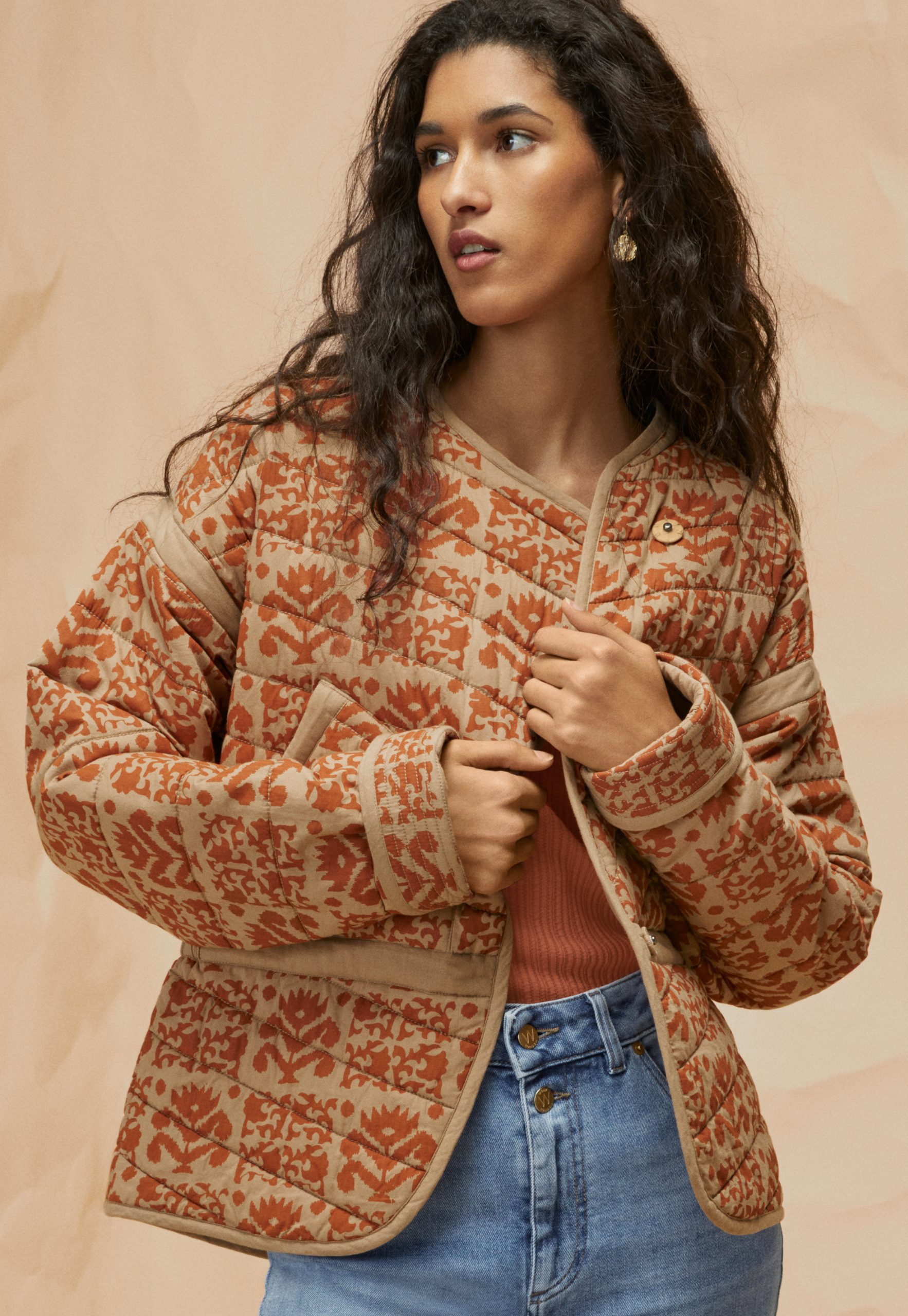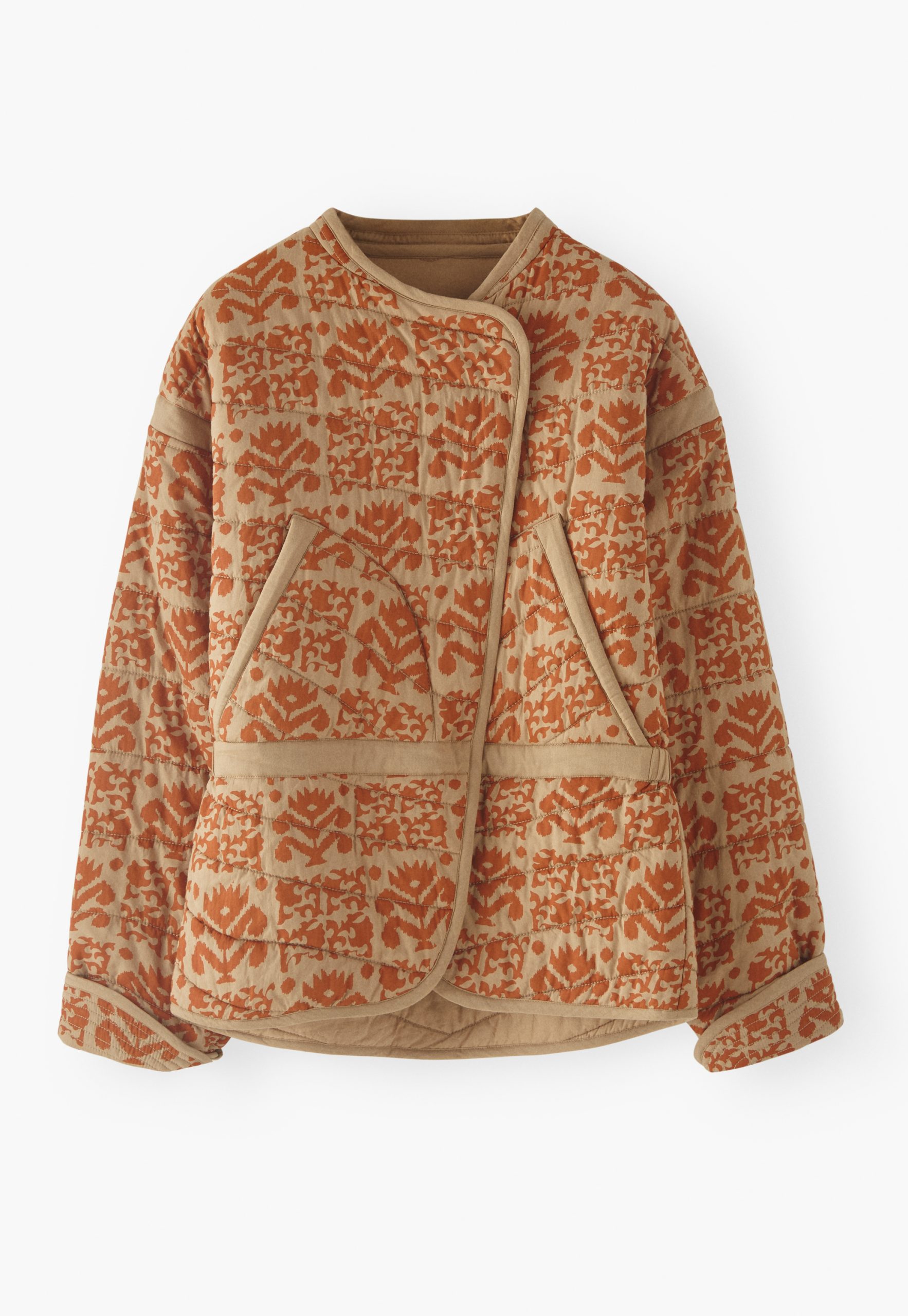 A neat-fit quilted jacket with a distinctive cross-front opening that fastens with hidden poppers. In an exclusive Wrap London block print, this is a statement jacket that will turn heads from every angle.