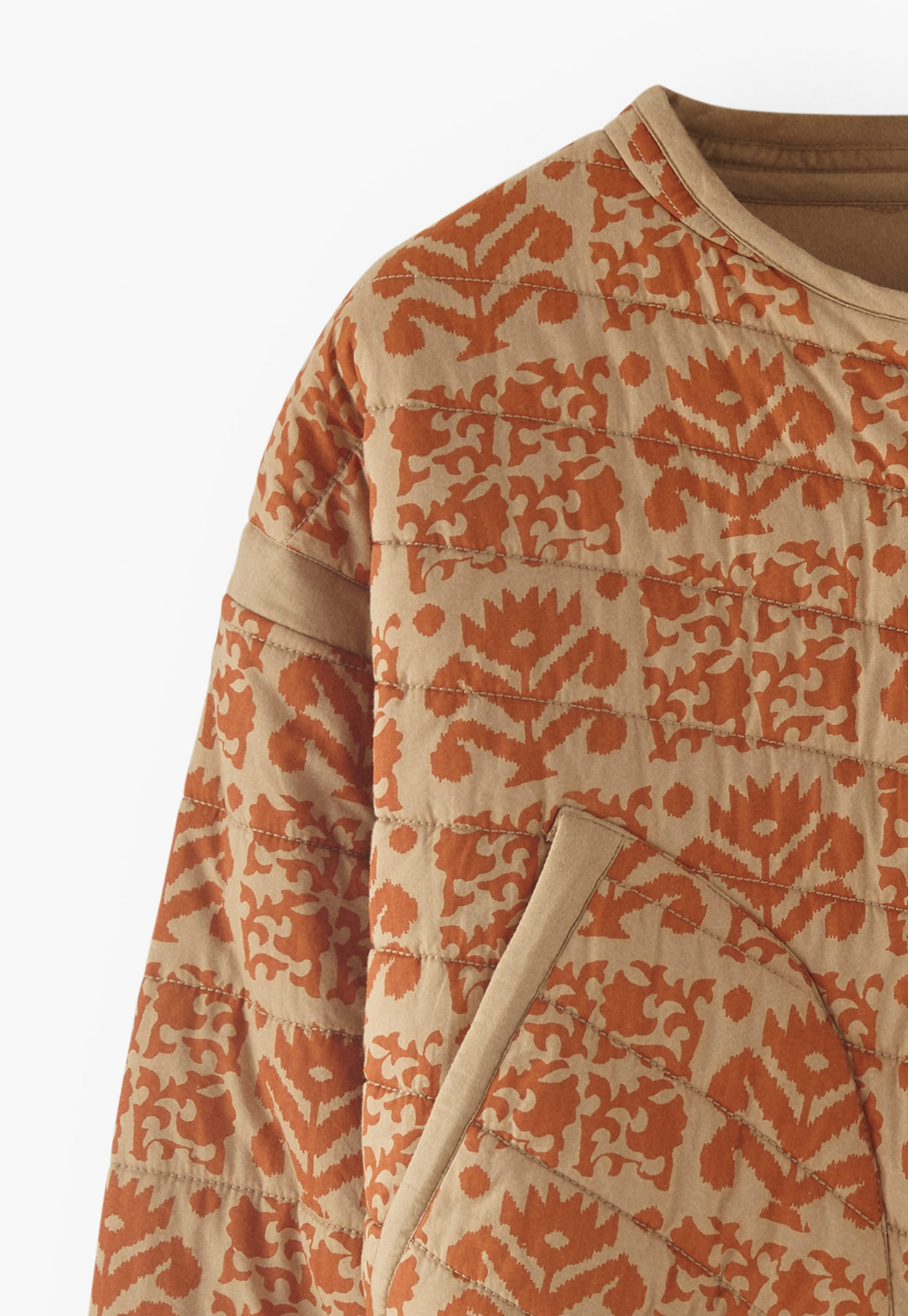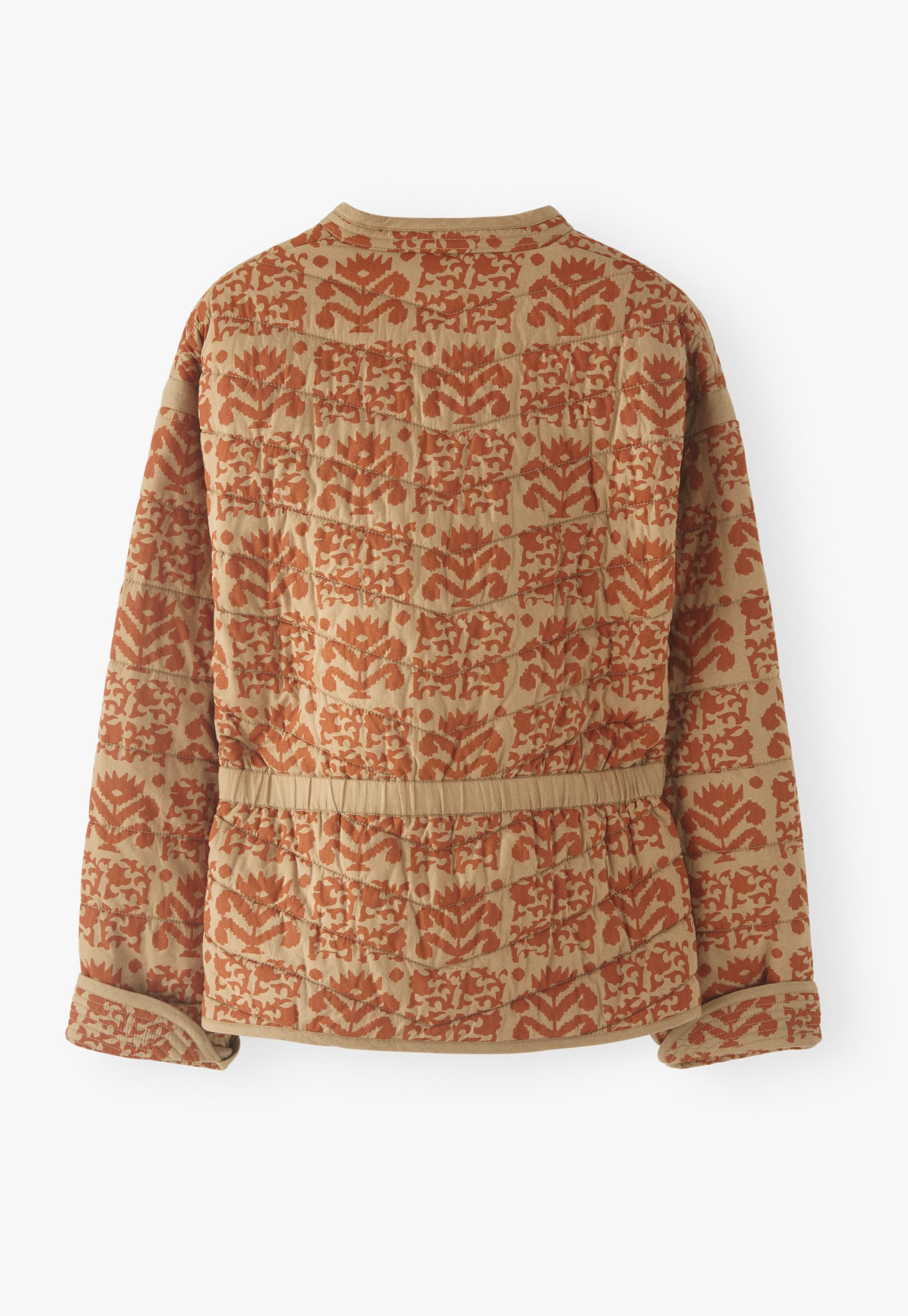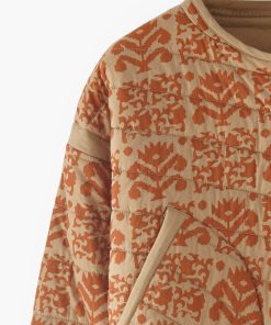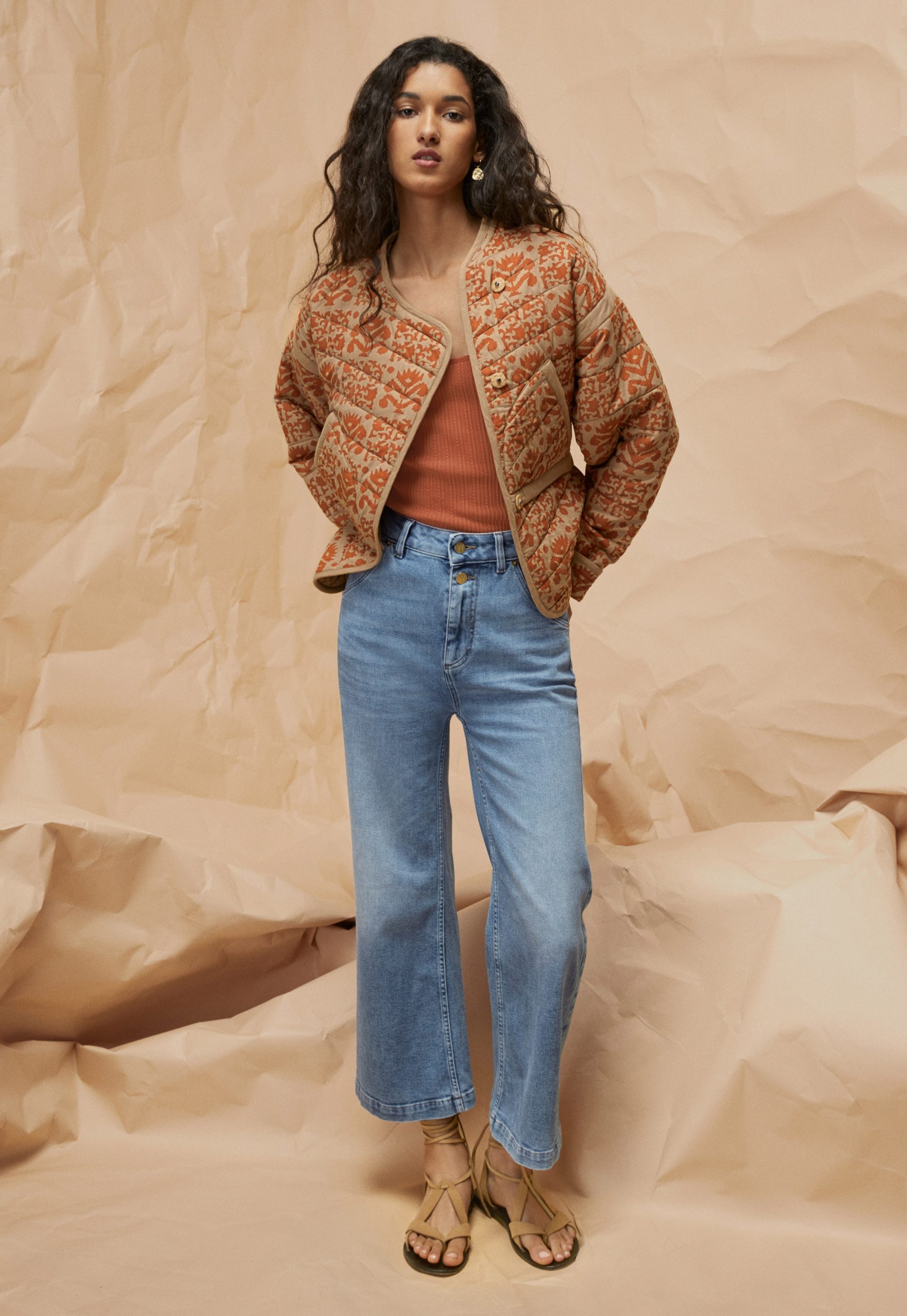 A neat-fit quilted jacket with a distinctive cross-front opening that fastens with hidden poppers. In an exclusive Wrap London block print, this is a statement jacket that will turn heads from every angle.