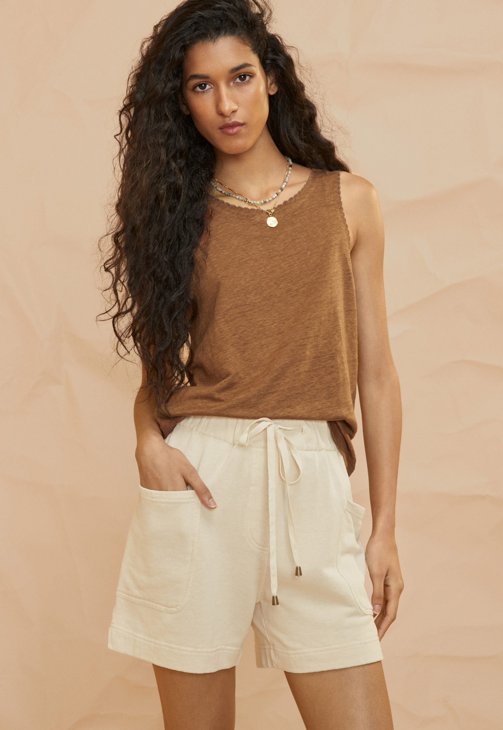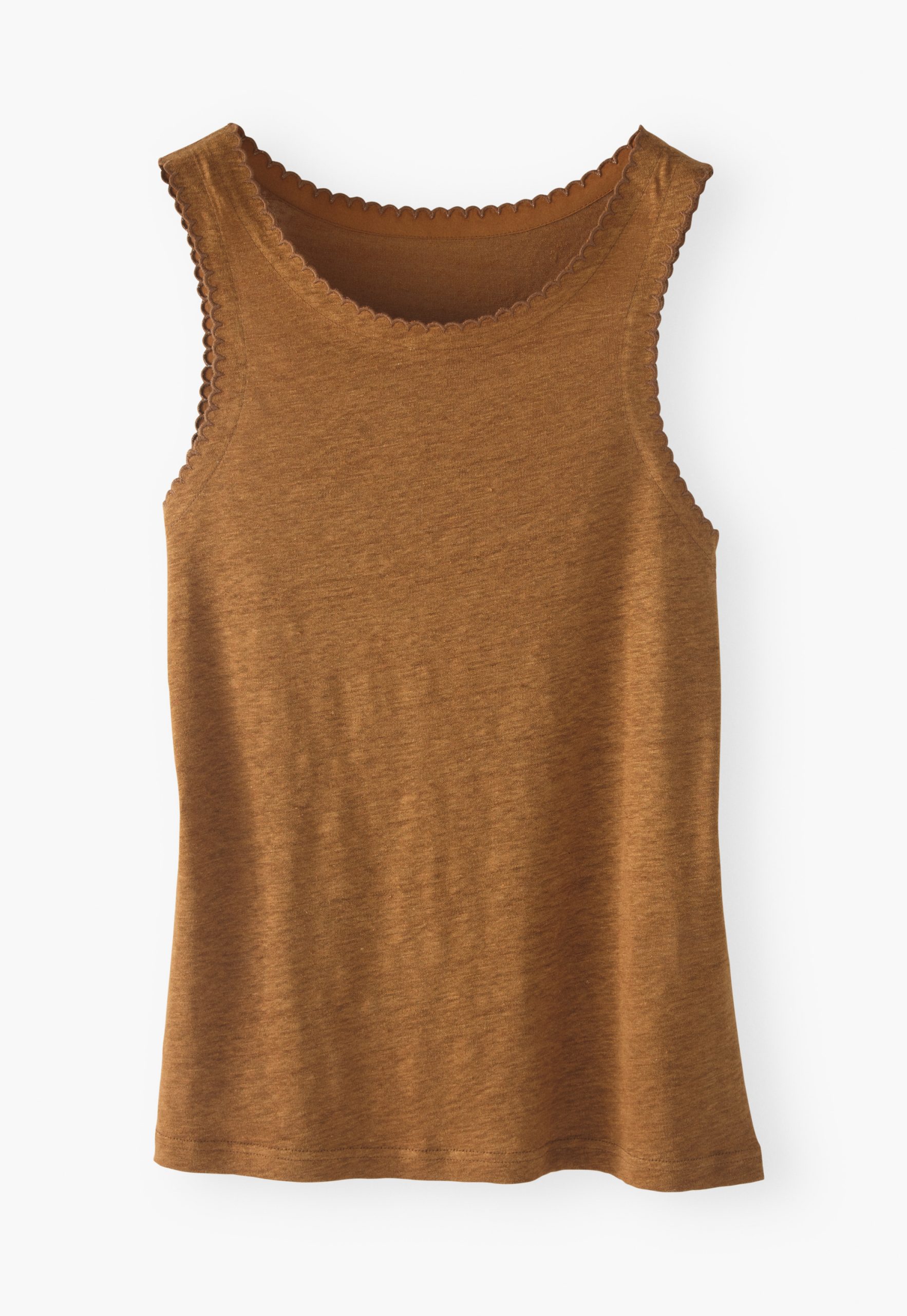 The classic summer vest top with added edge. Subtle scallop shapes around the neck and sleeve are finished with contrast stitching. In soft shades that work across the collection.