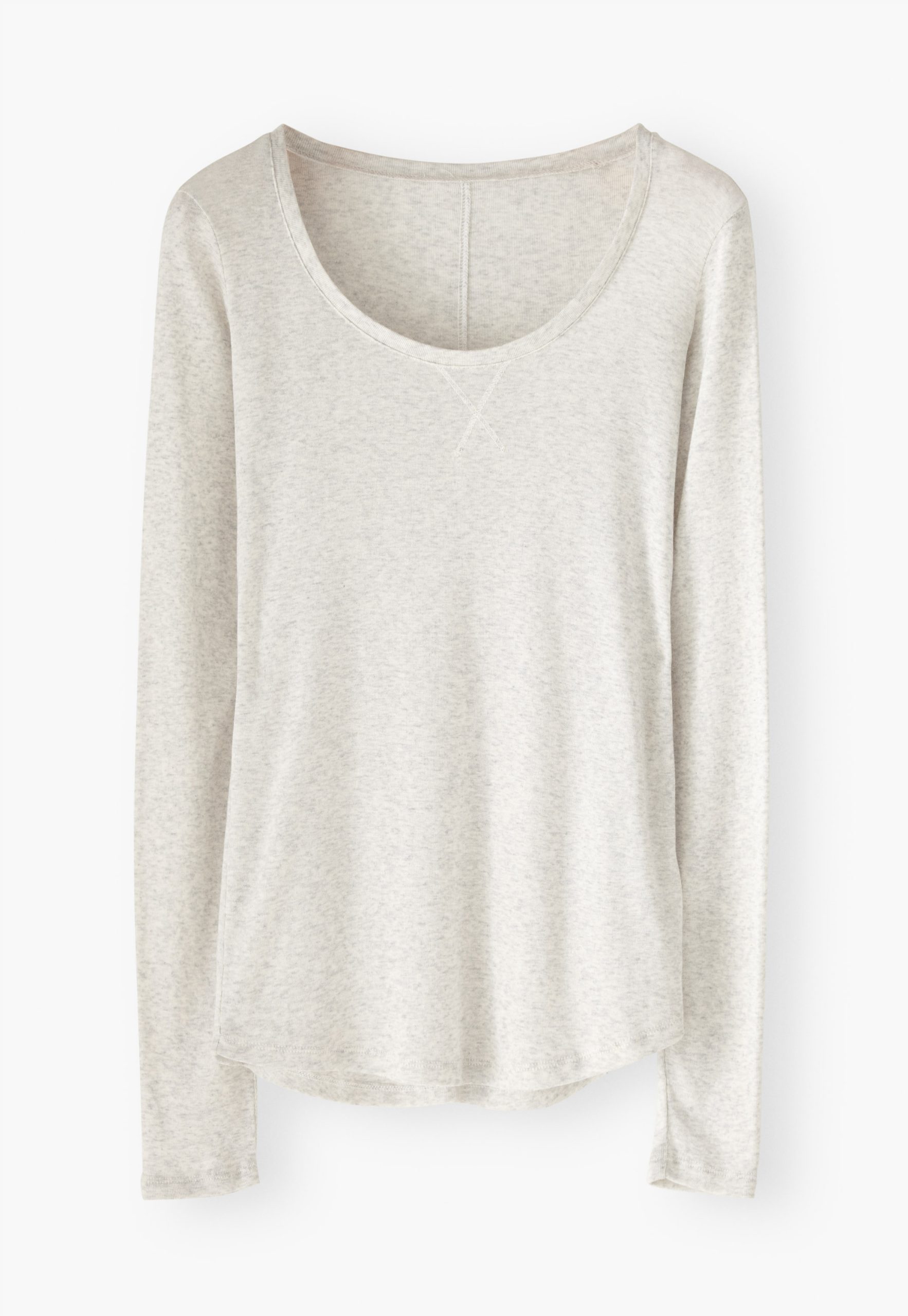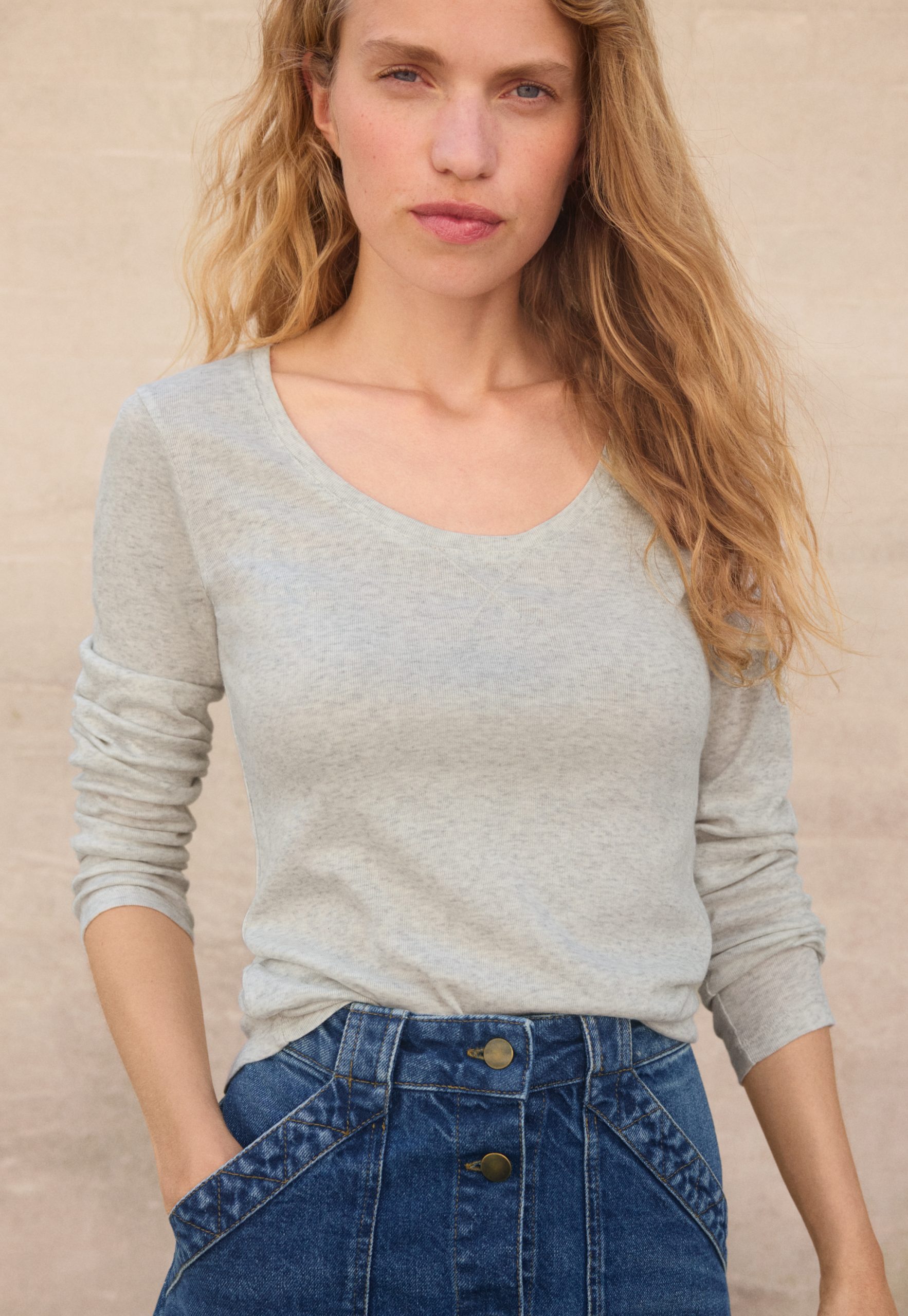 Neat-fitting, skinny knit with a lower neckline so it can be hidden under sweaters, or wear half-tuck with jeans and the curved hem on show.