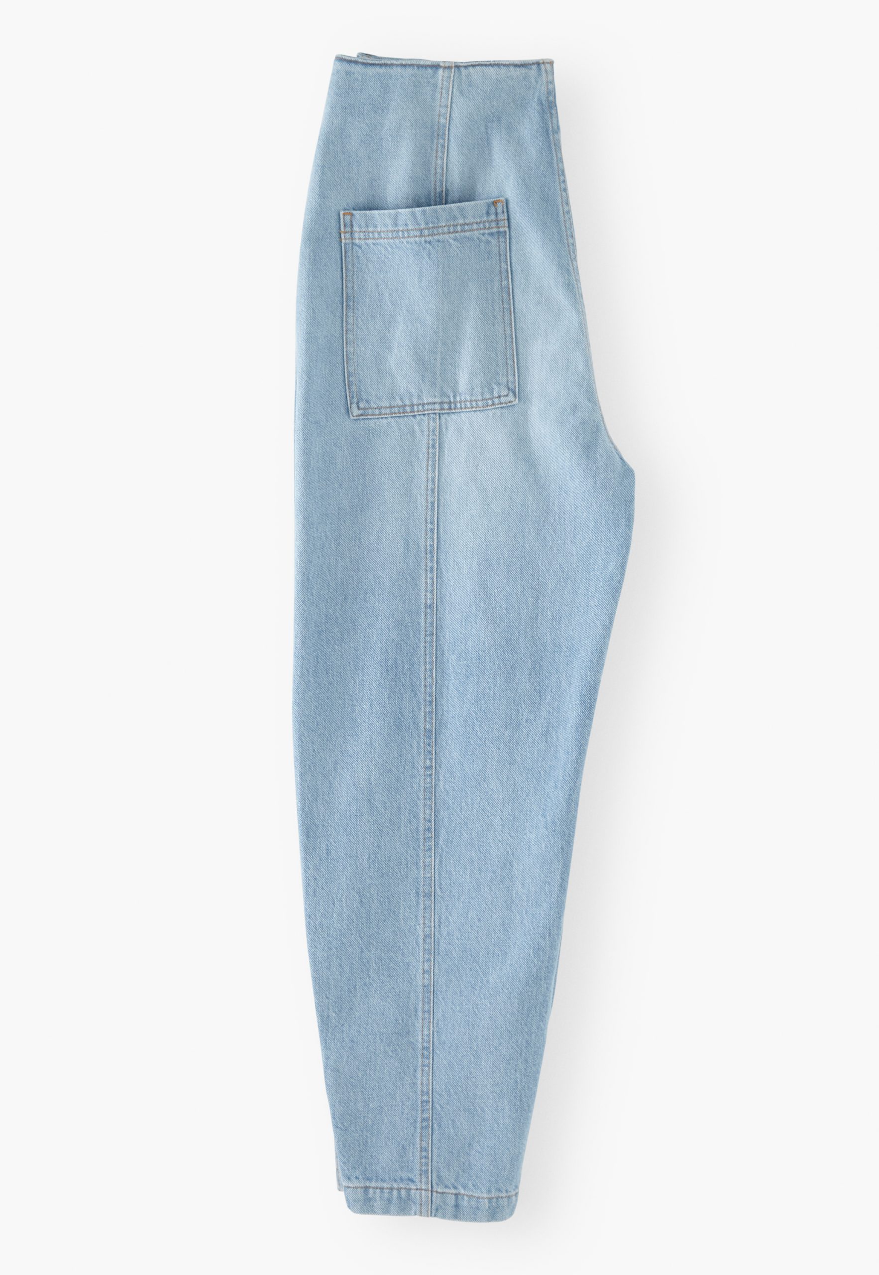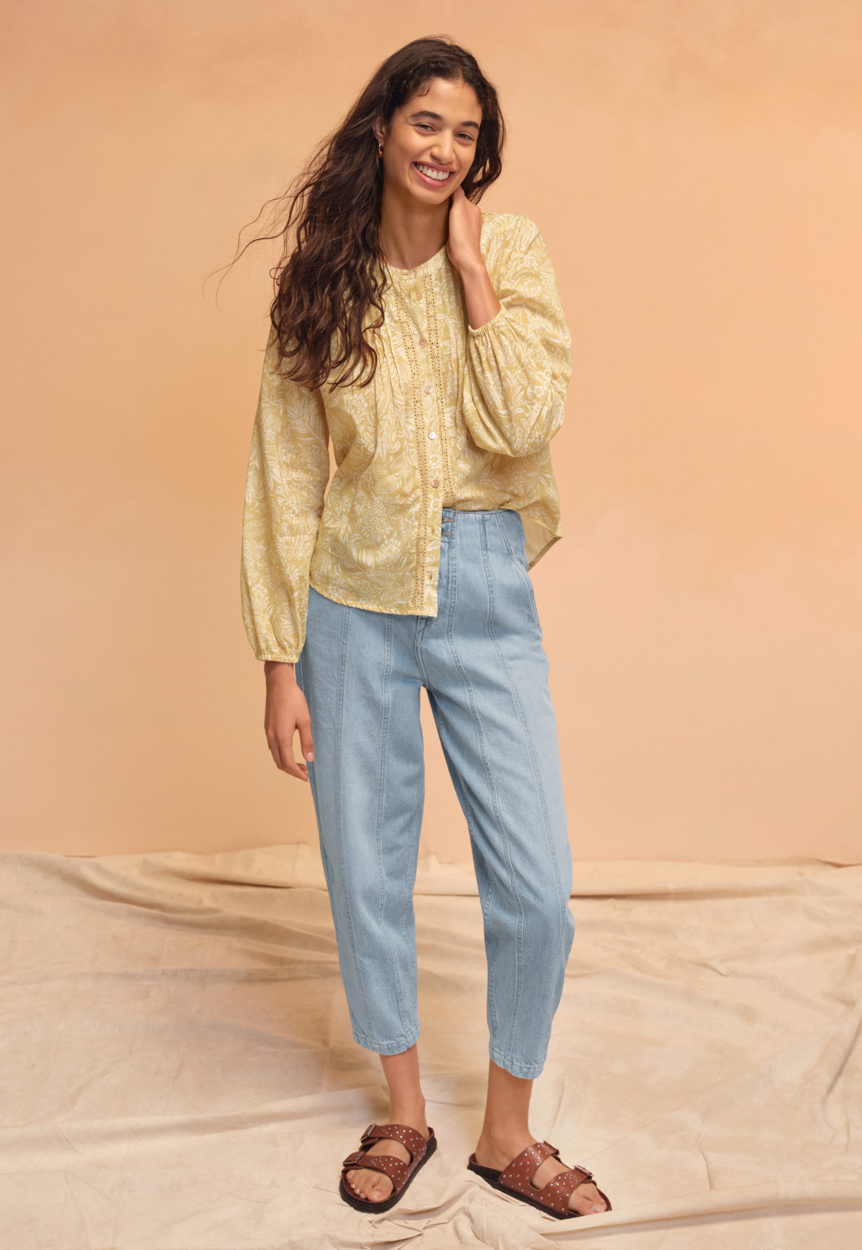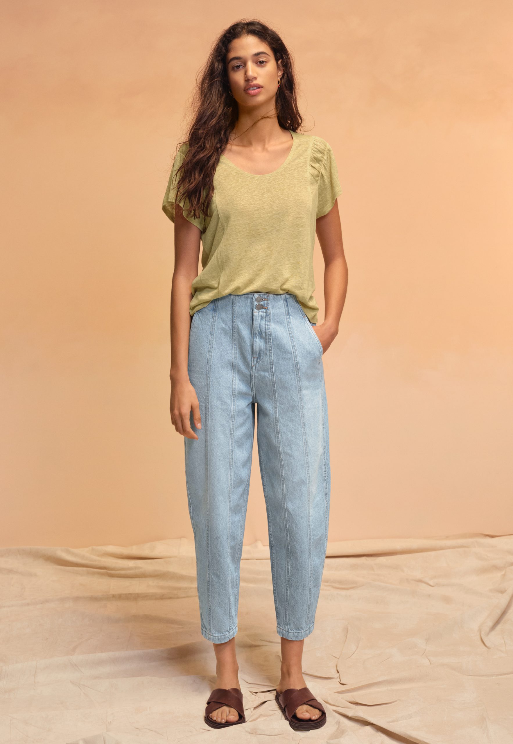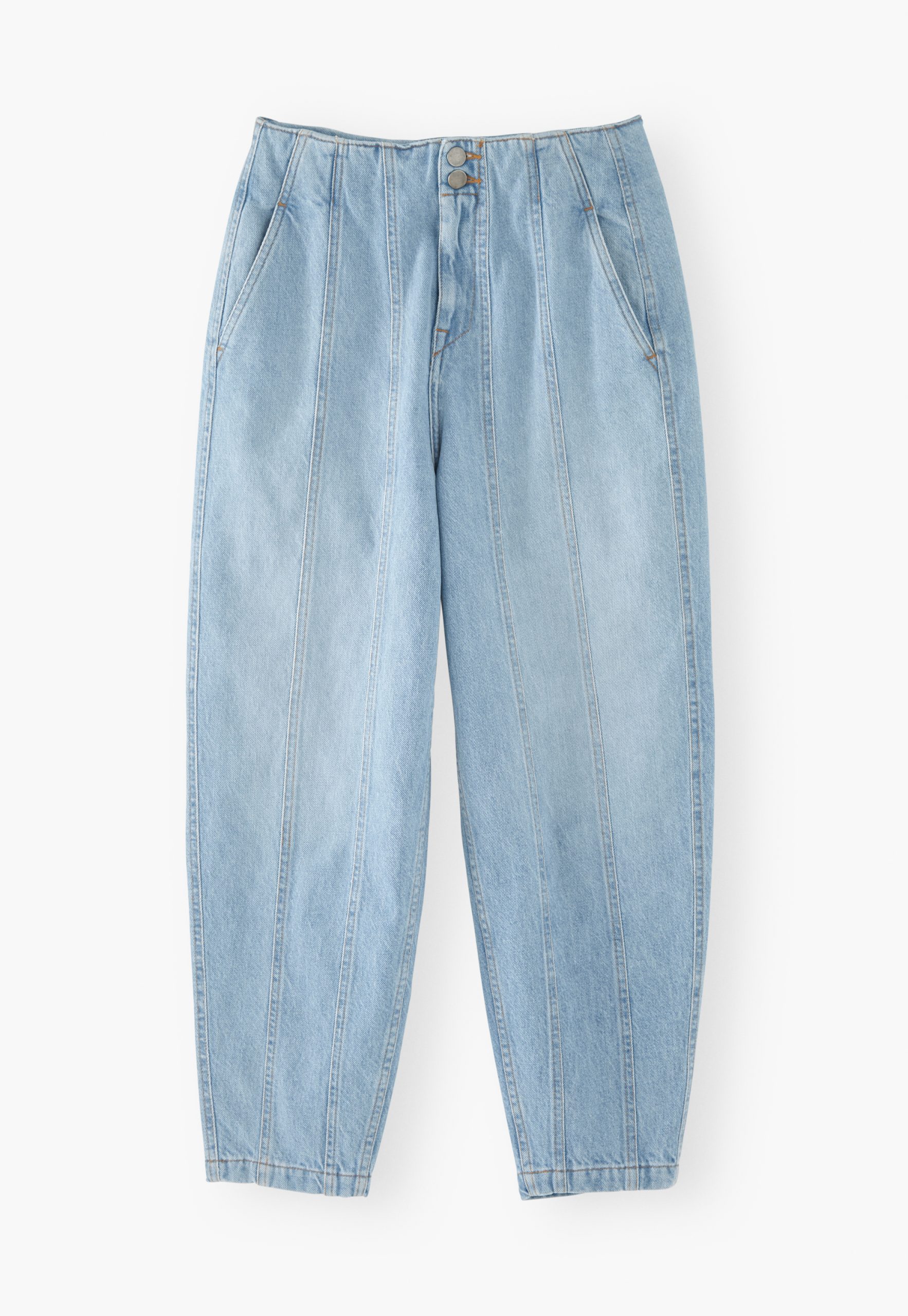 Desirable denim in a light wash with distinctive seam details front and back. High waisted and tapering to the ankle these jeans evoke the spirit of the eighties brought right up to date.