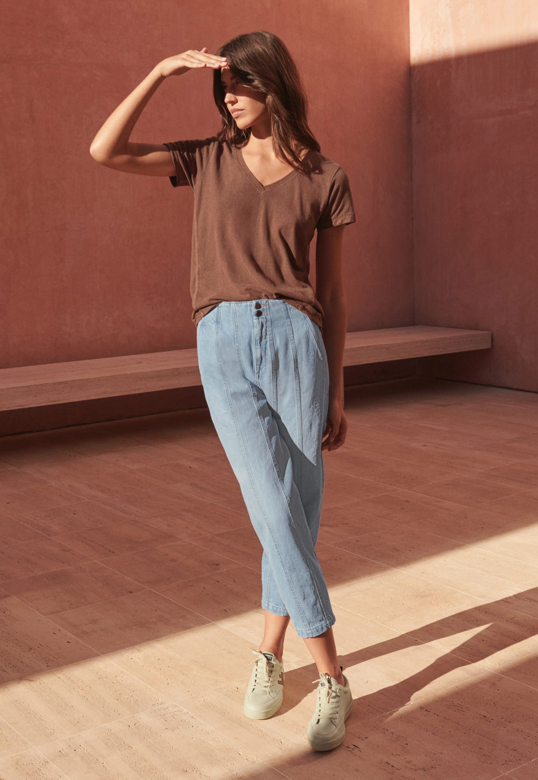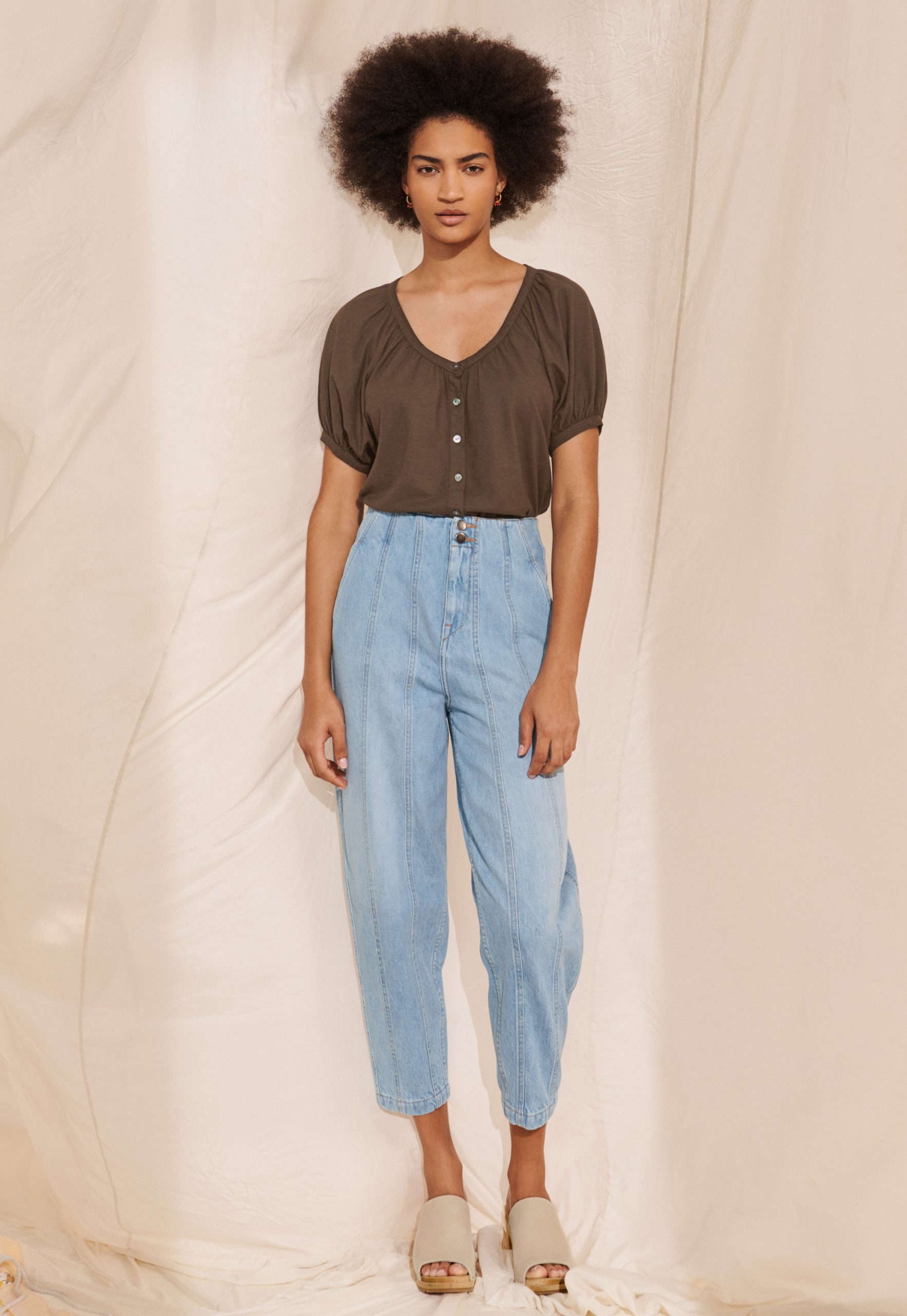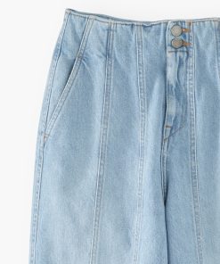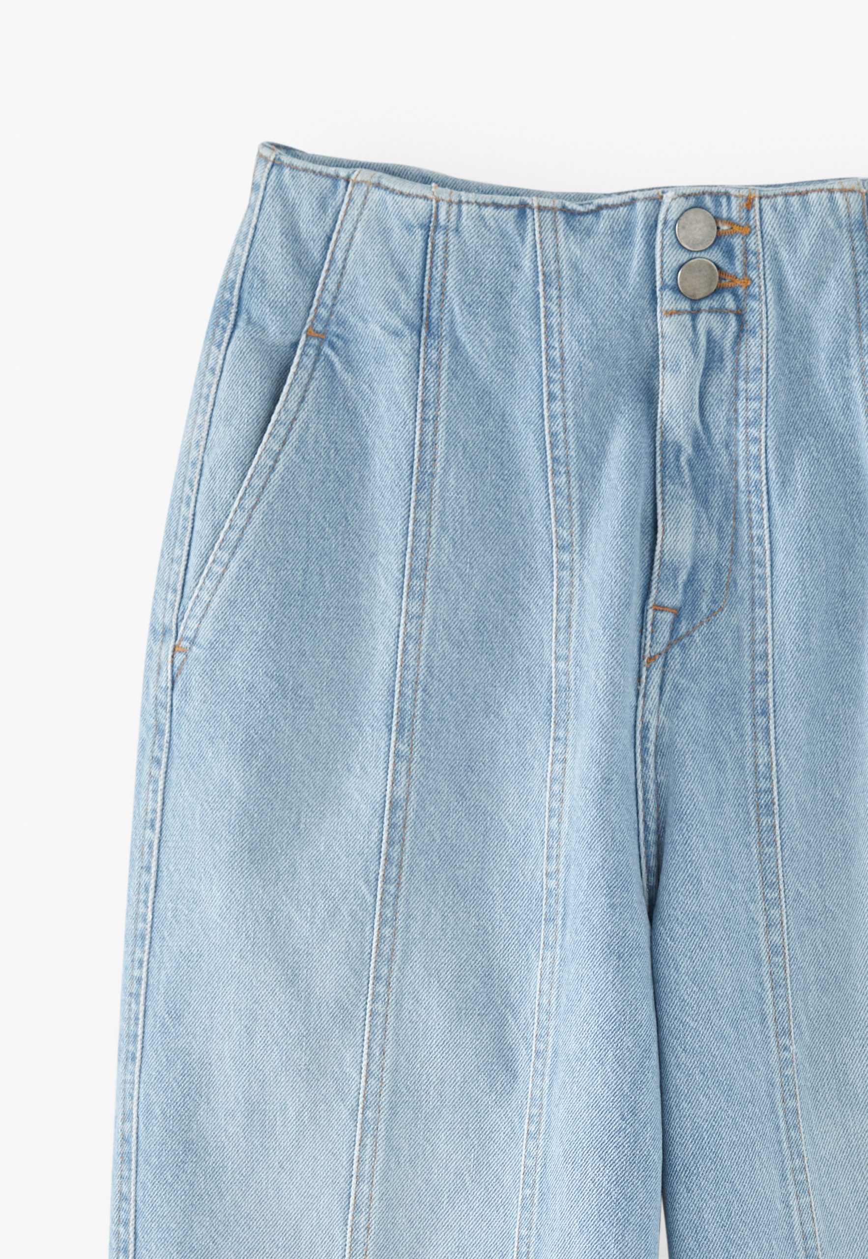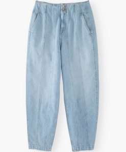 Desirable denim in a light wash with distinctive seam details front and back. High waisted and tapering to the ankle these jeans evoke the spirit of the eighties brought right up to date.