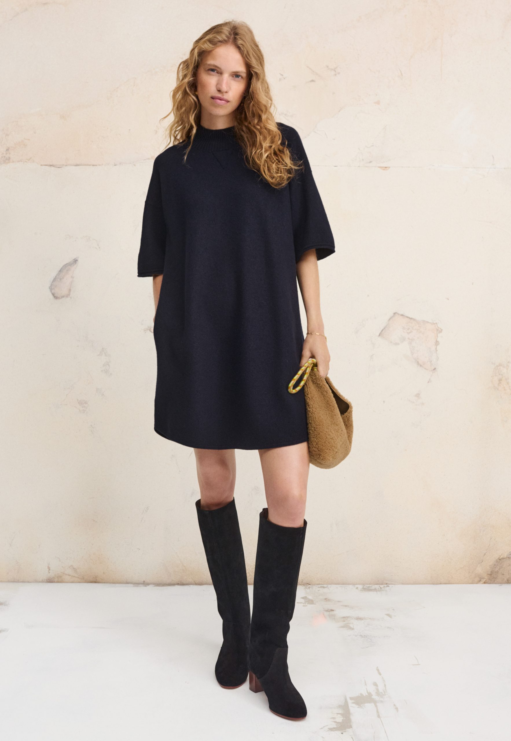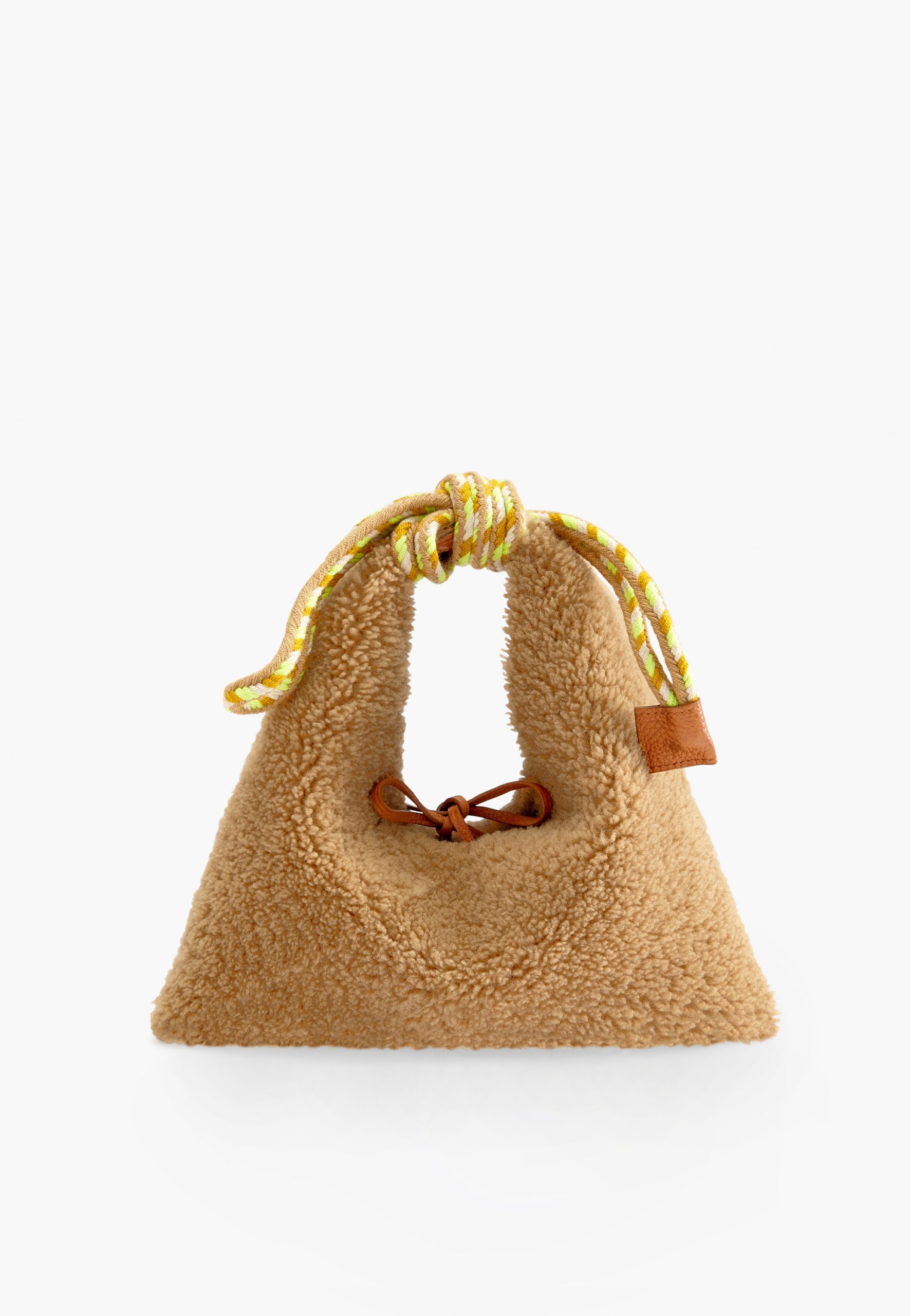 A fun, furry little handbag with a neon-coloured rope handle. Closes with a hidden leather tie.