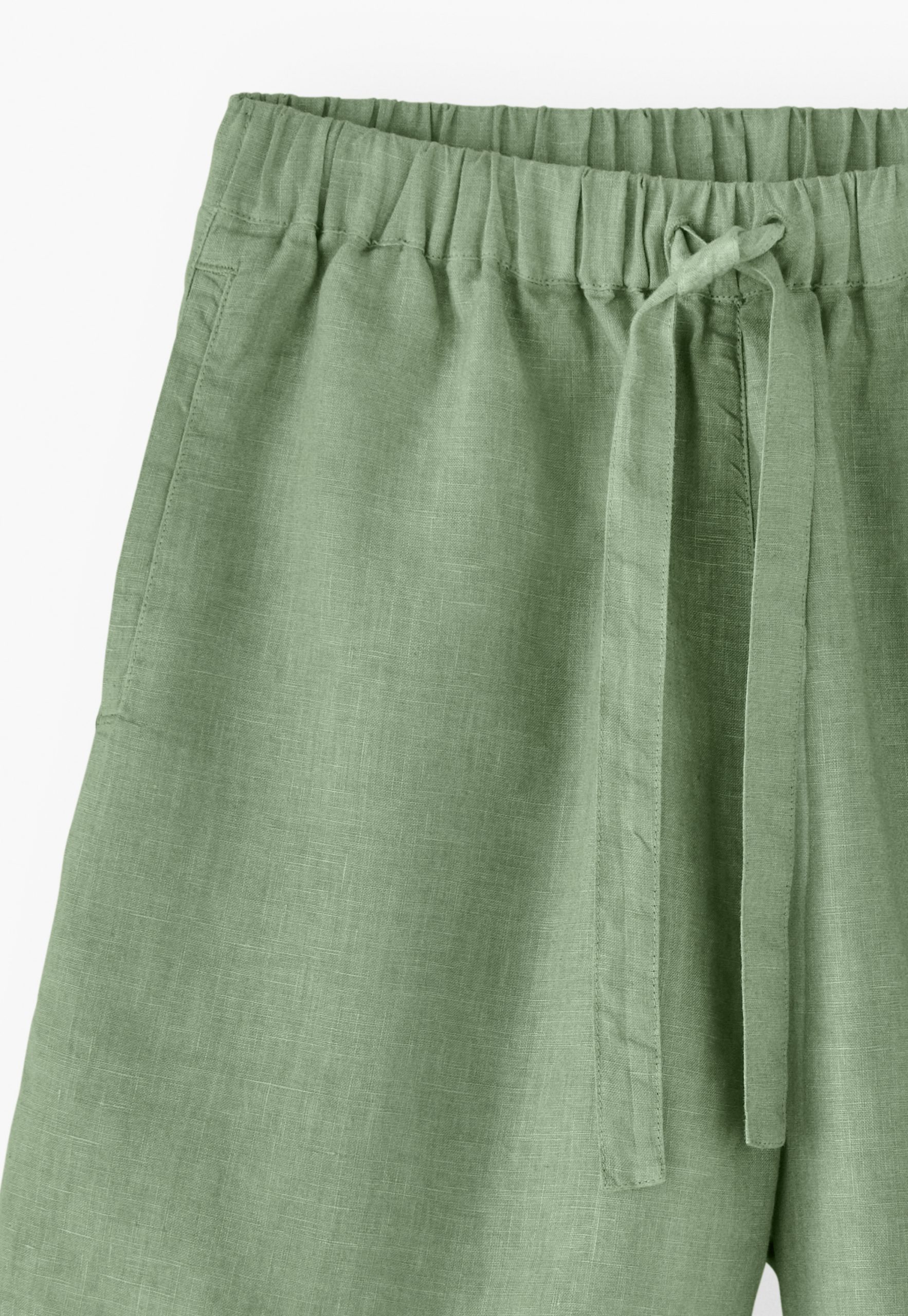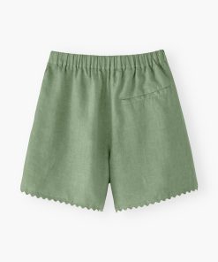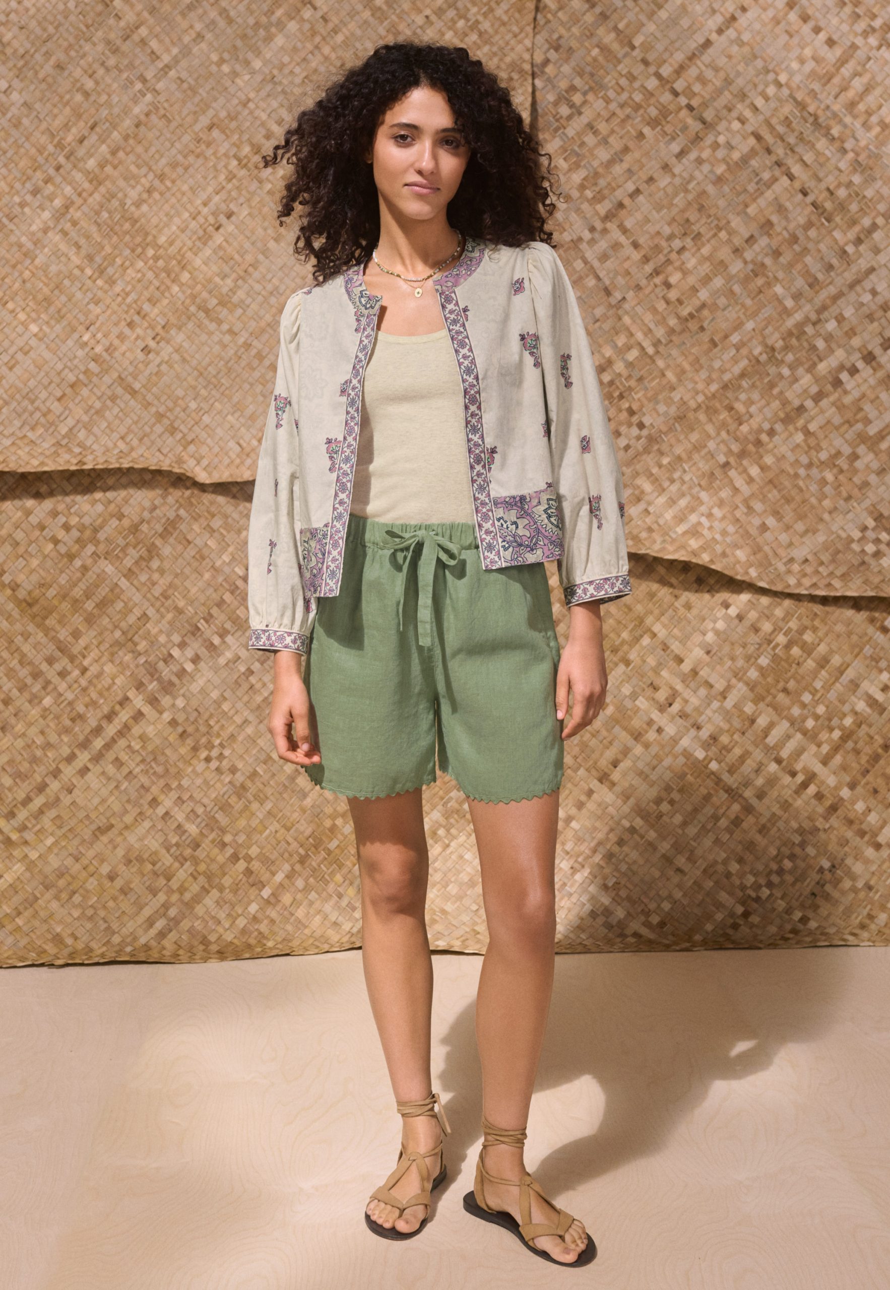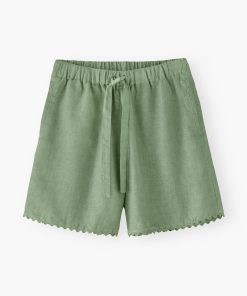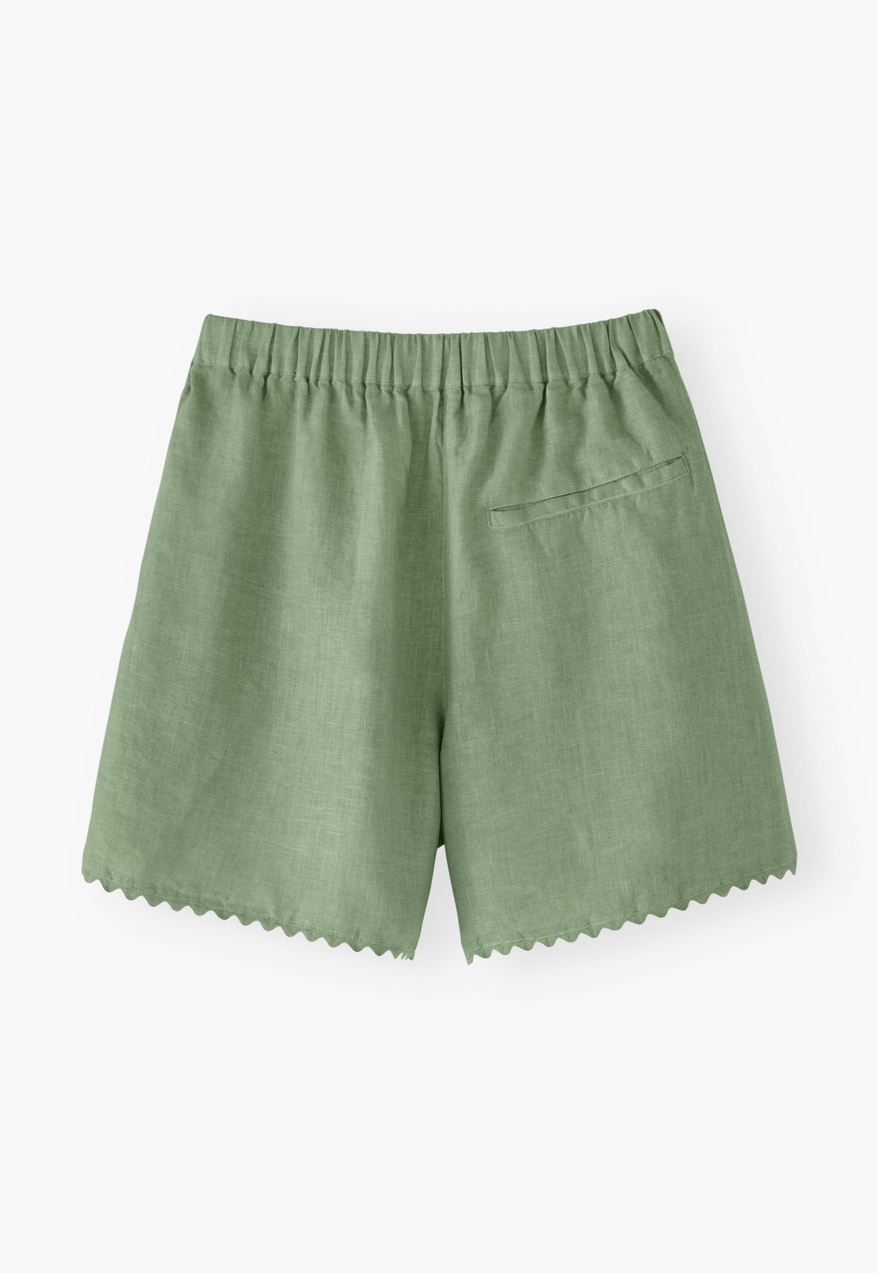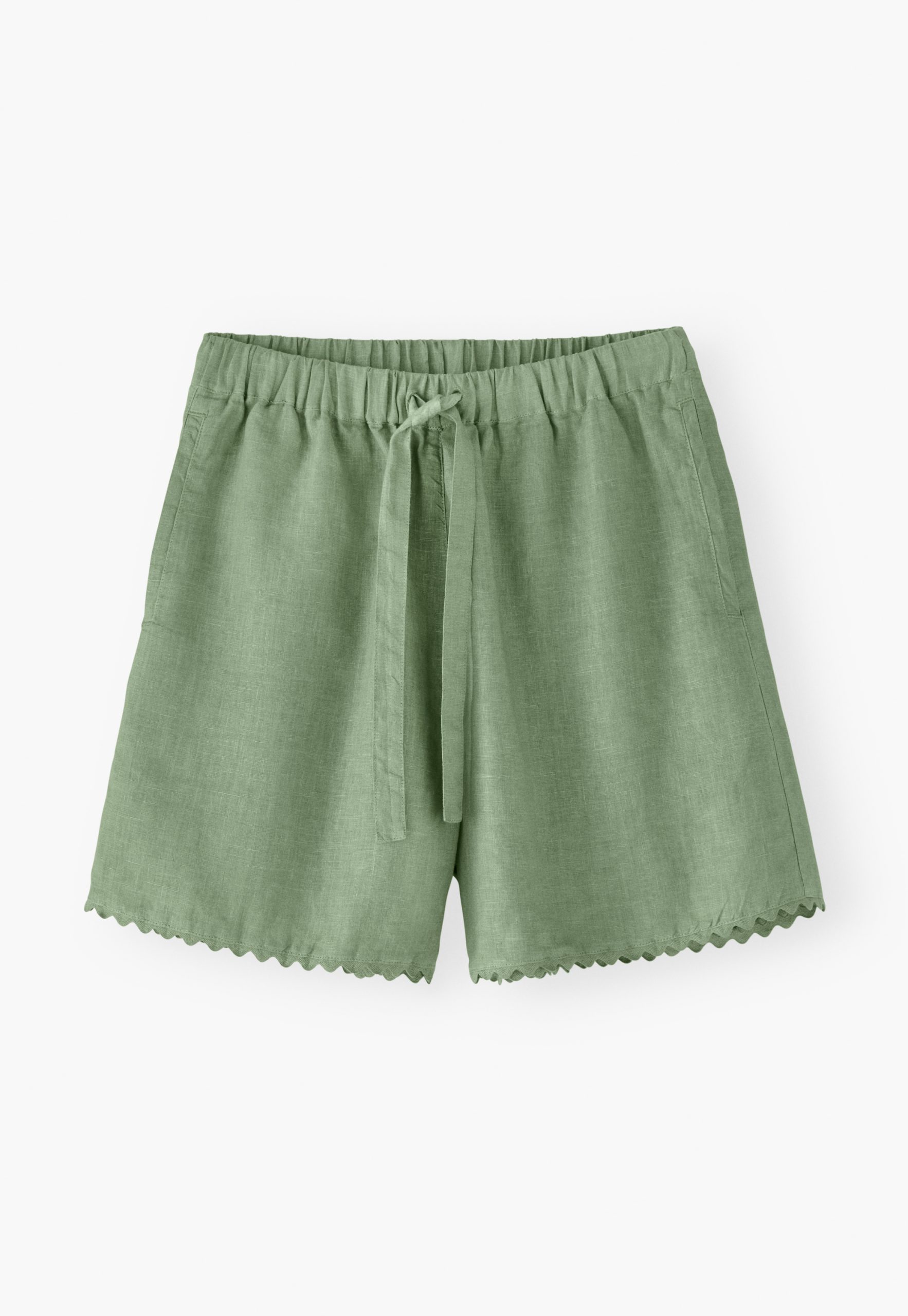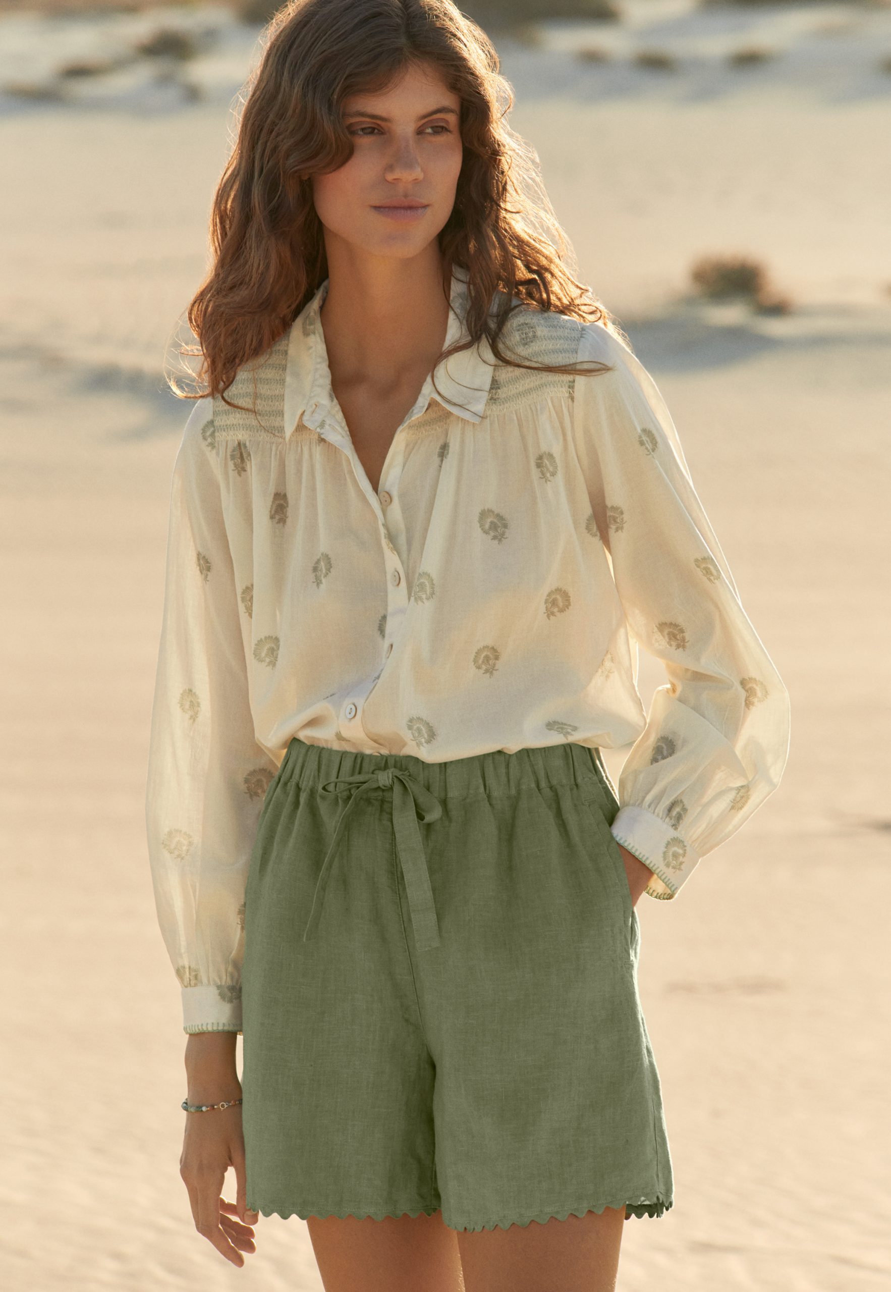 Lovely lightweight linen shorts designed to be as relaxed as a day at the beach. With an easy elasticated waist, wide-legs and pockets for your sunglasses. Ric-rack trim at the hem adds a pleasing detail.
