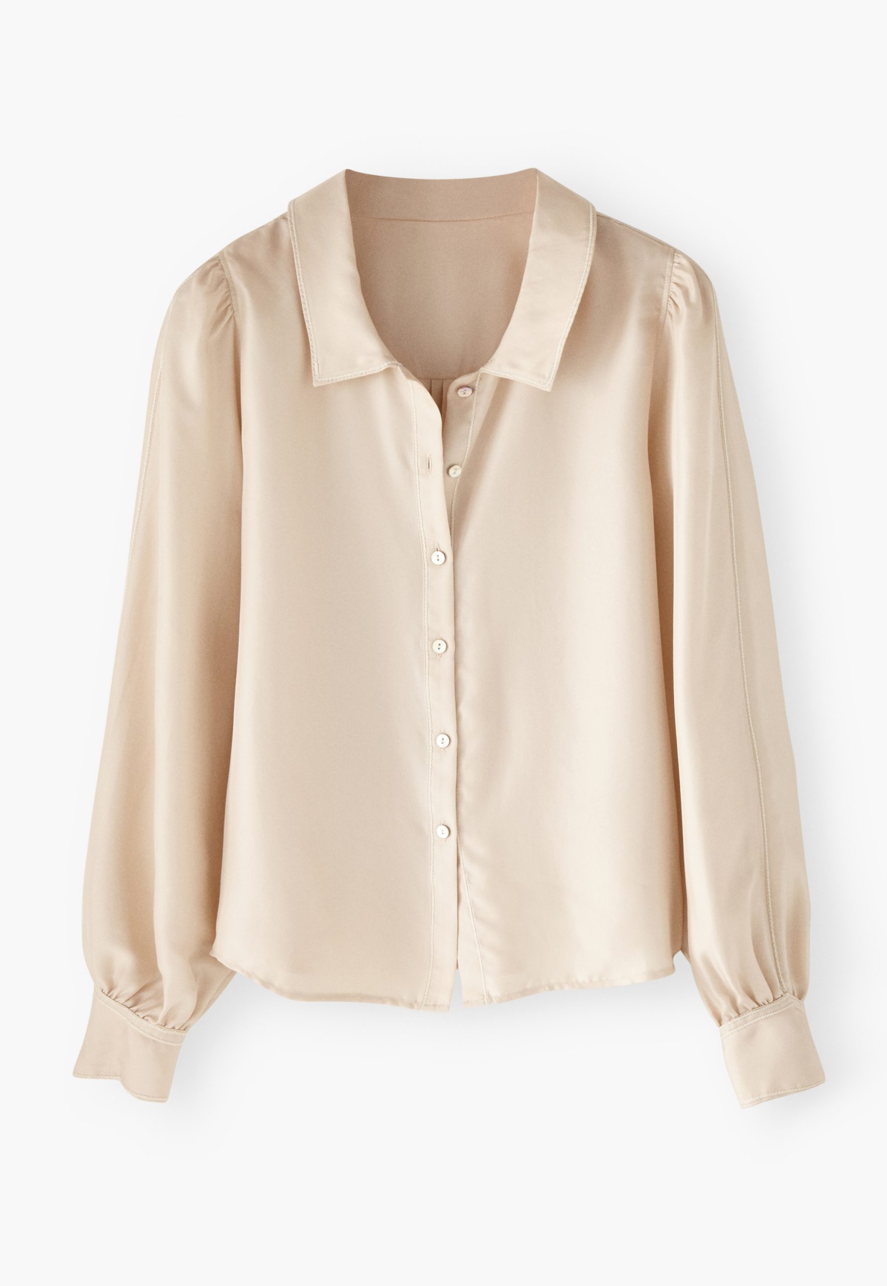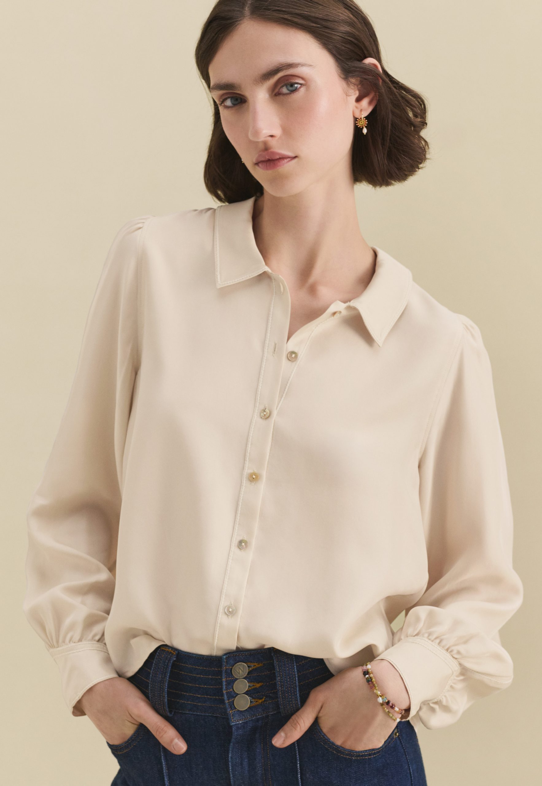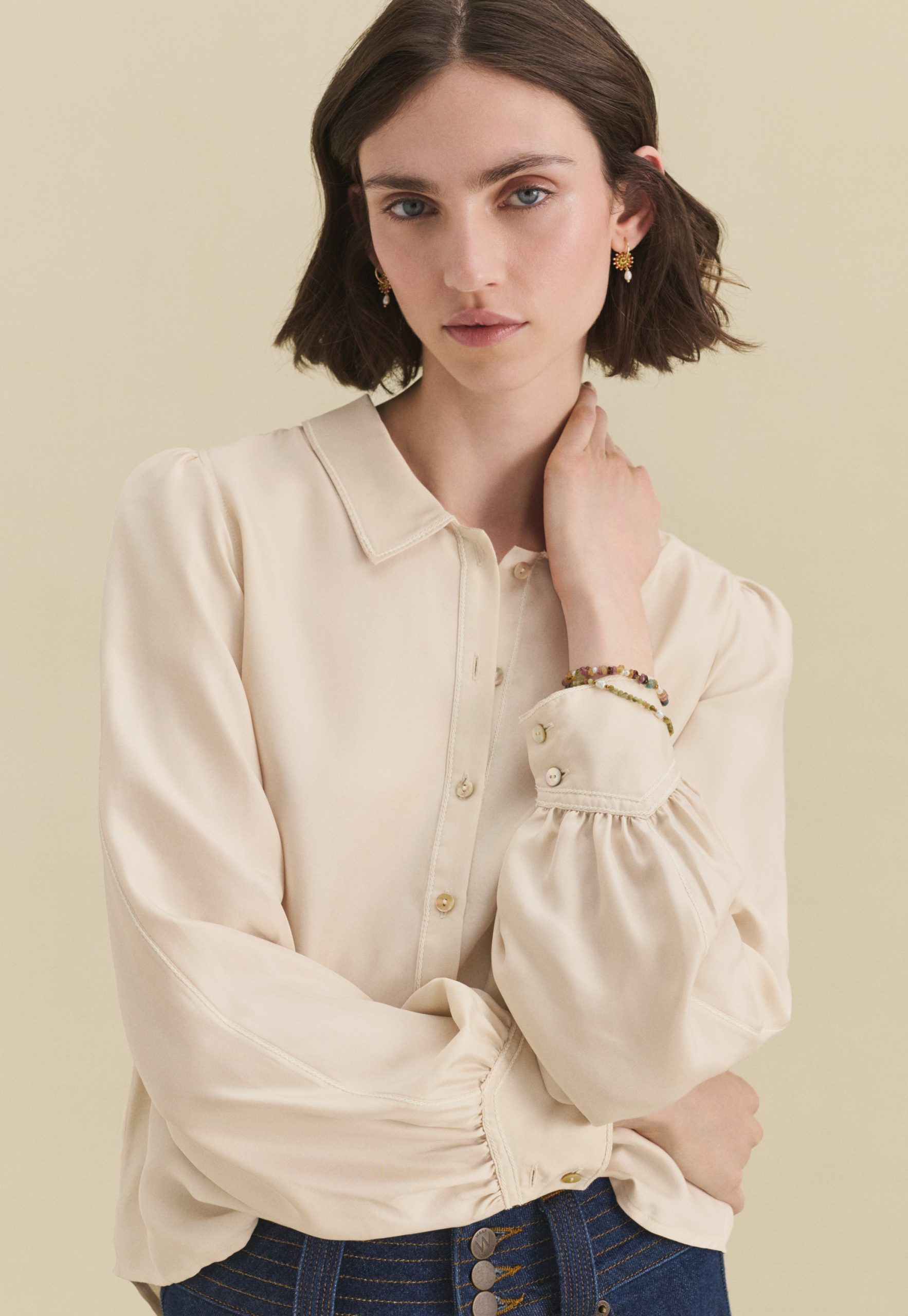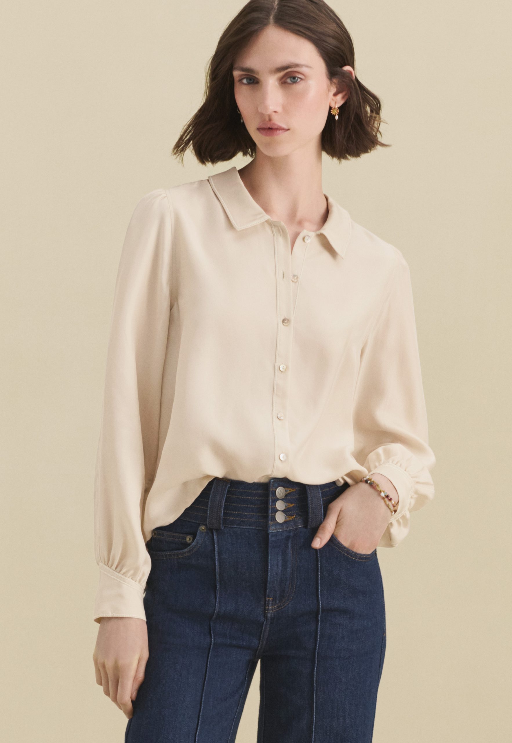 The ultimate in luxe, this sand-wash silk twill shirt is beautifully relaxed with full length blouson sleeves that finish with a shaped cuff. A blouse to wear for evenings out that’s guaranteed to make you feel special.