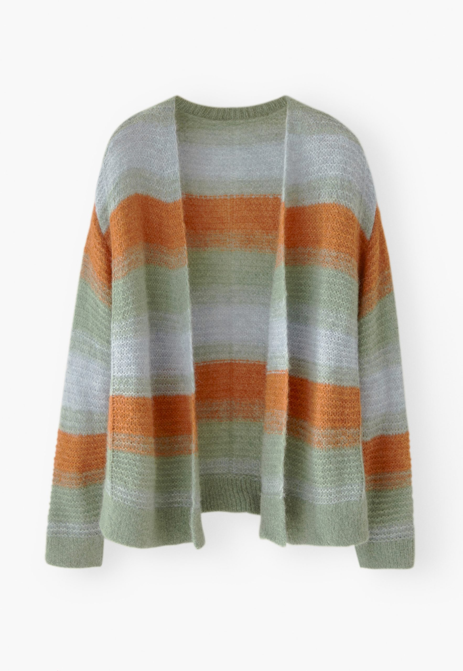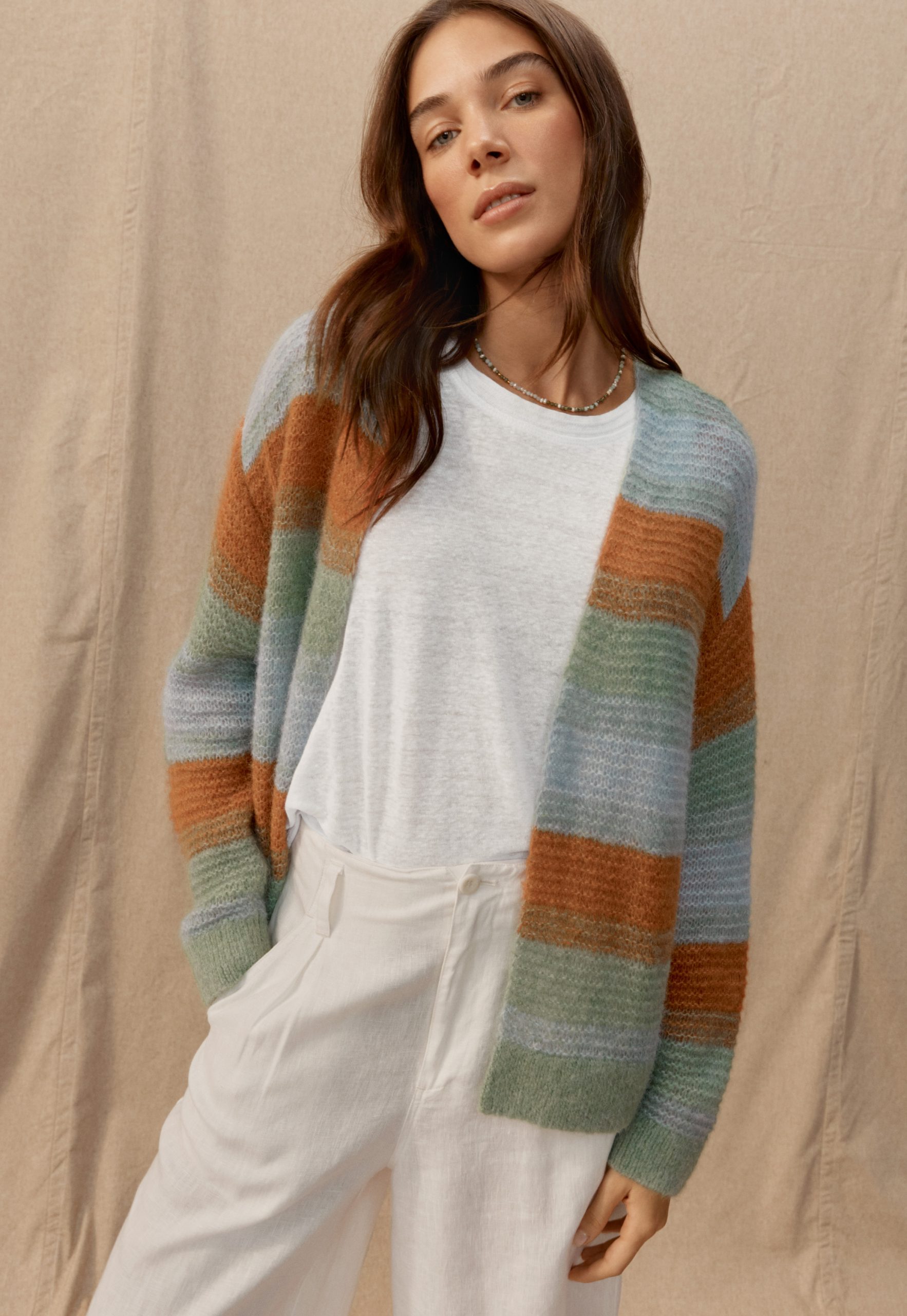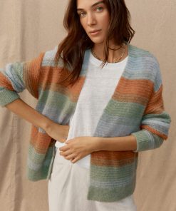 A wonderful way to add colour to any outfit, this super-soft and lightweight alpaca blend cardigan is knitted in a large, open stitch to create irregular stripes. With soft, dropped shoulders and clean edge-to-edge closing, this is a great throw-on layering piece.
