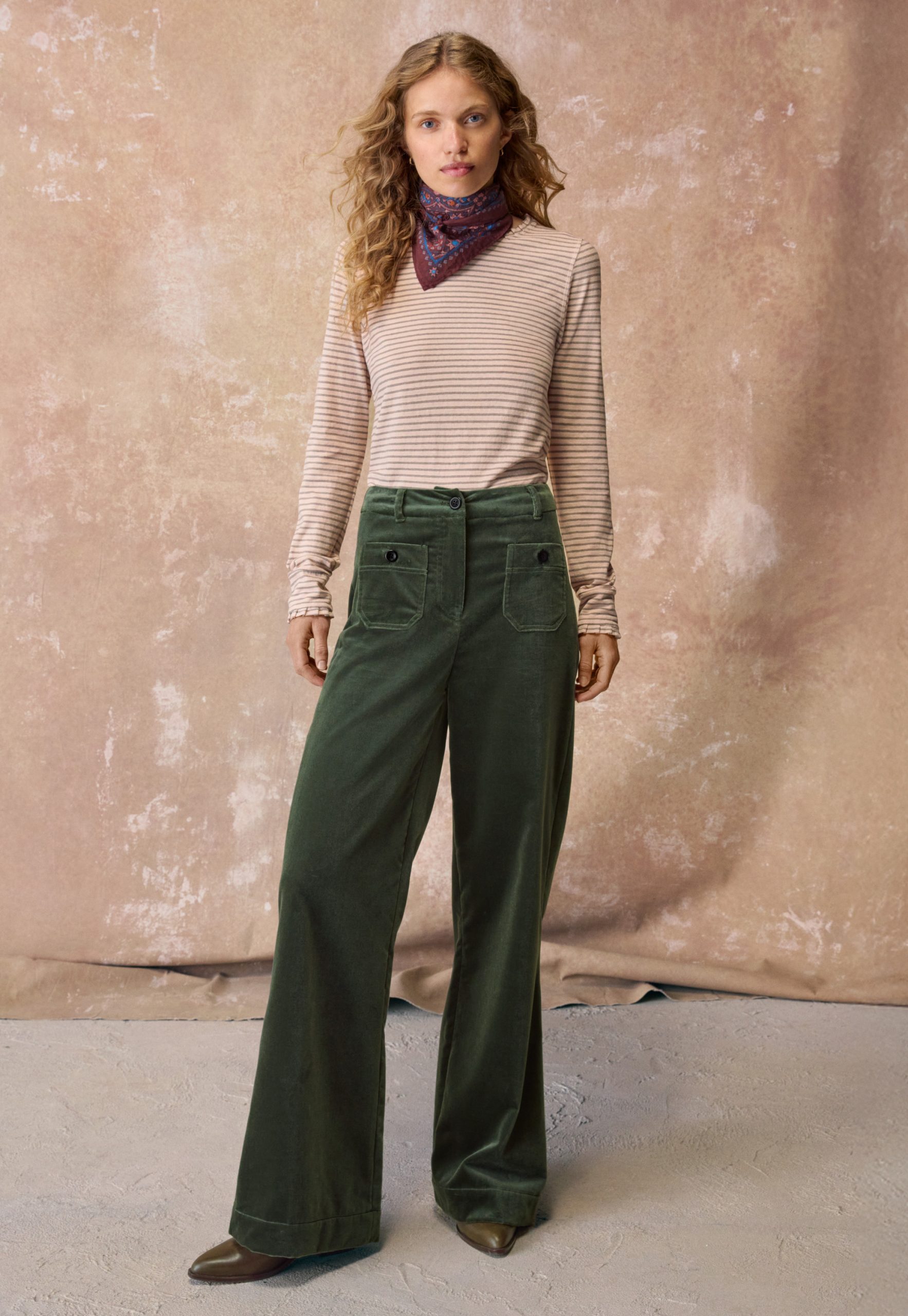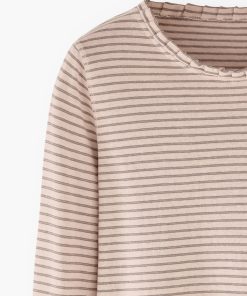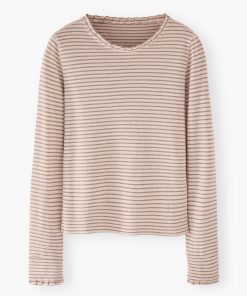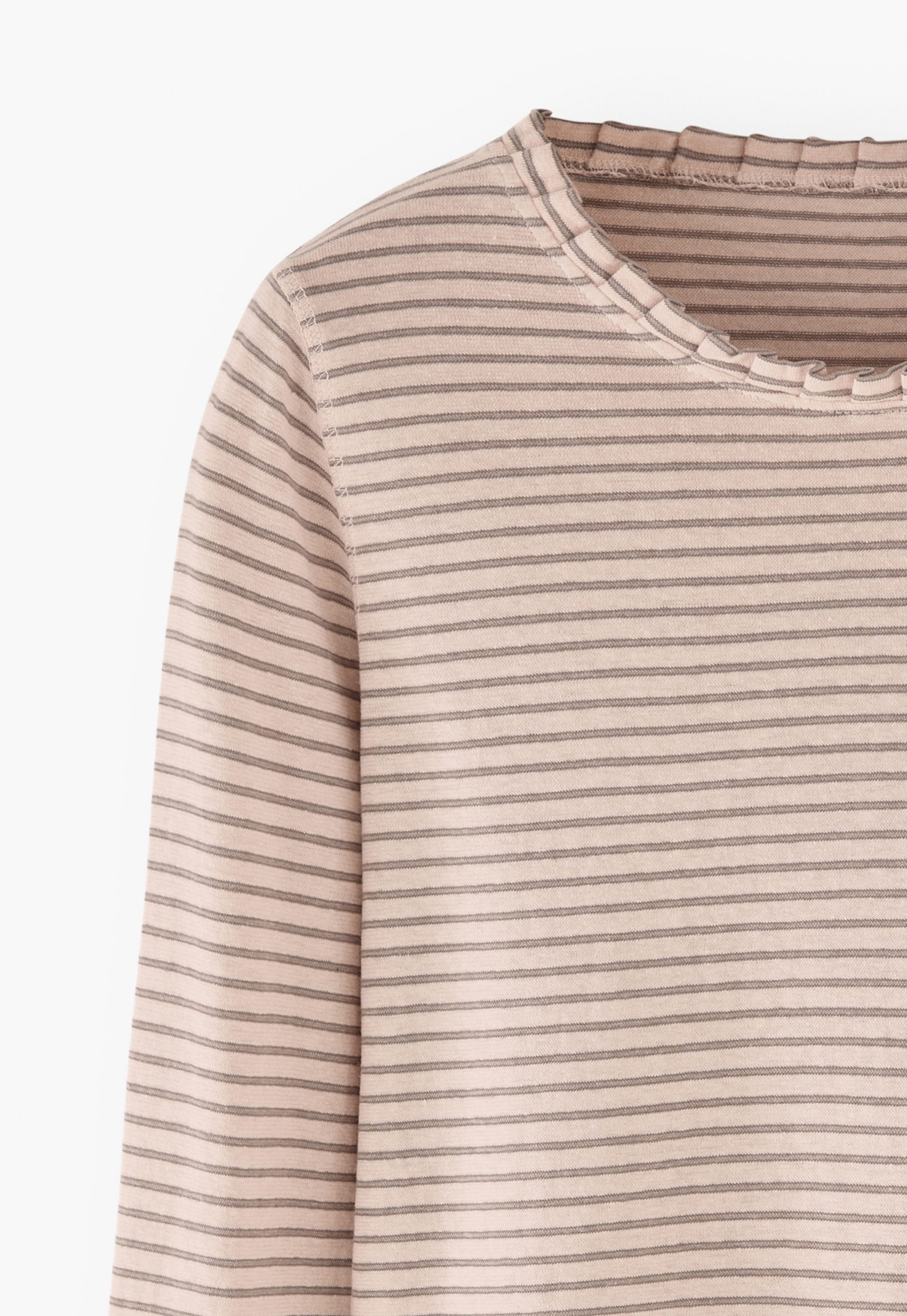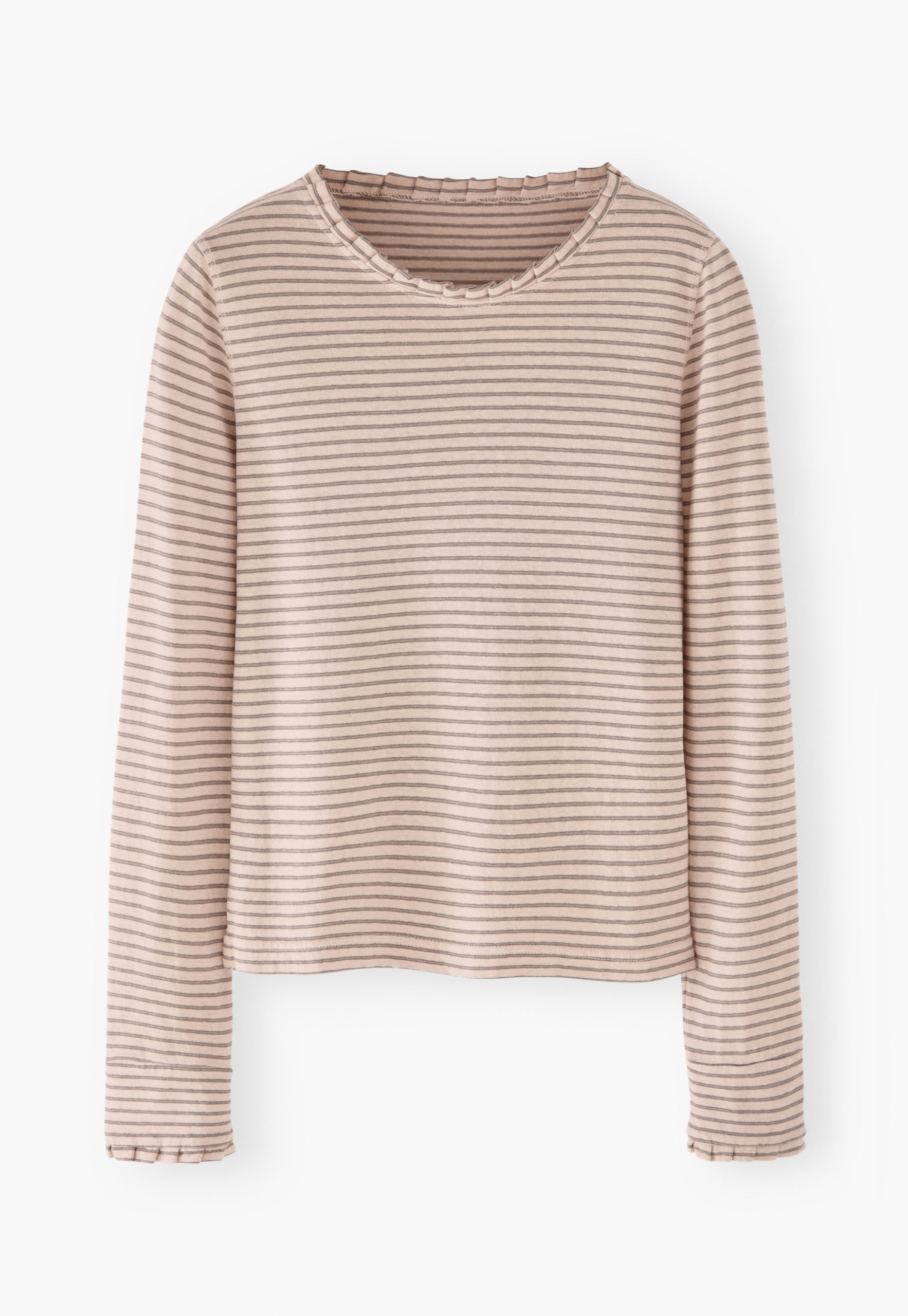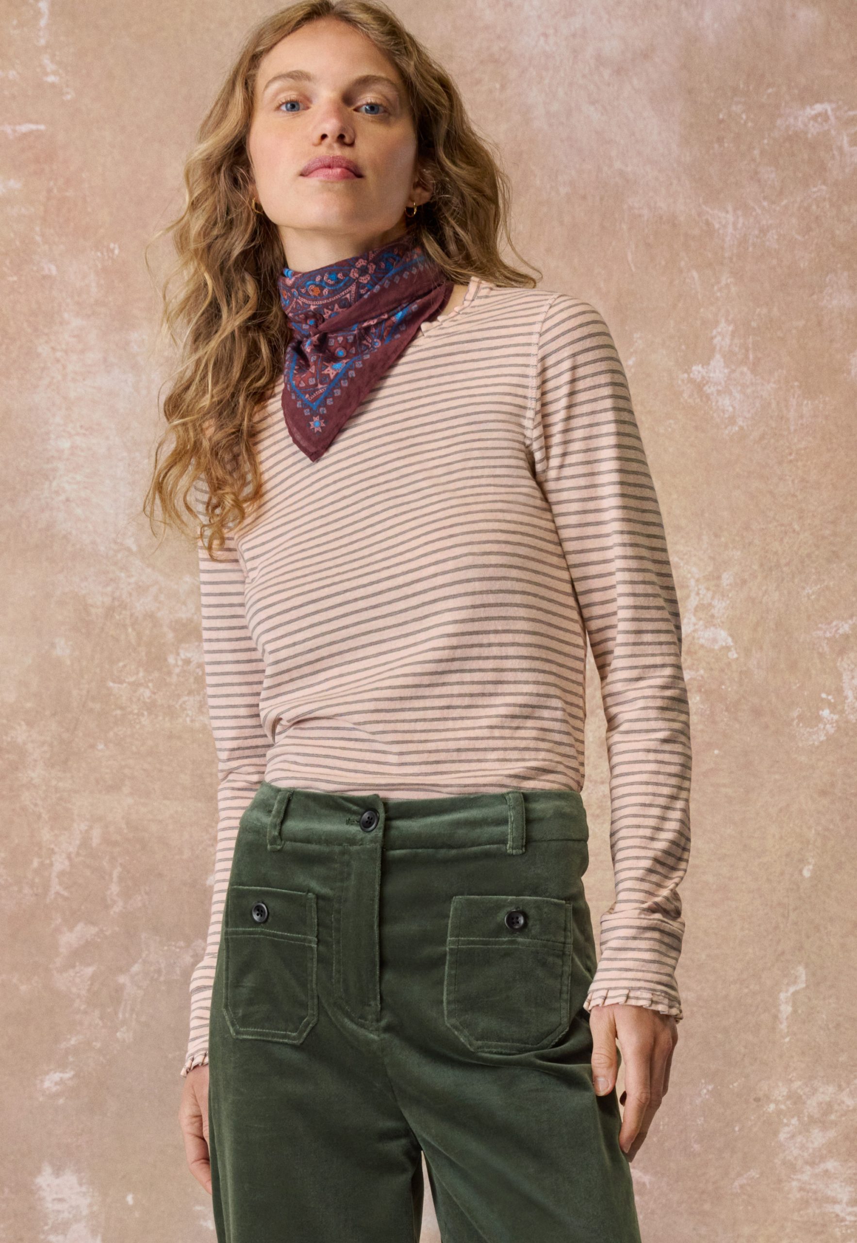 A slim-fit striped top in hemp and organic cotton jersey. Very versatile, it looks fab under a jacket revealing the frill detail at the neckline and cuffs