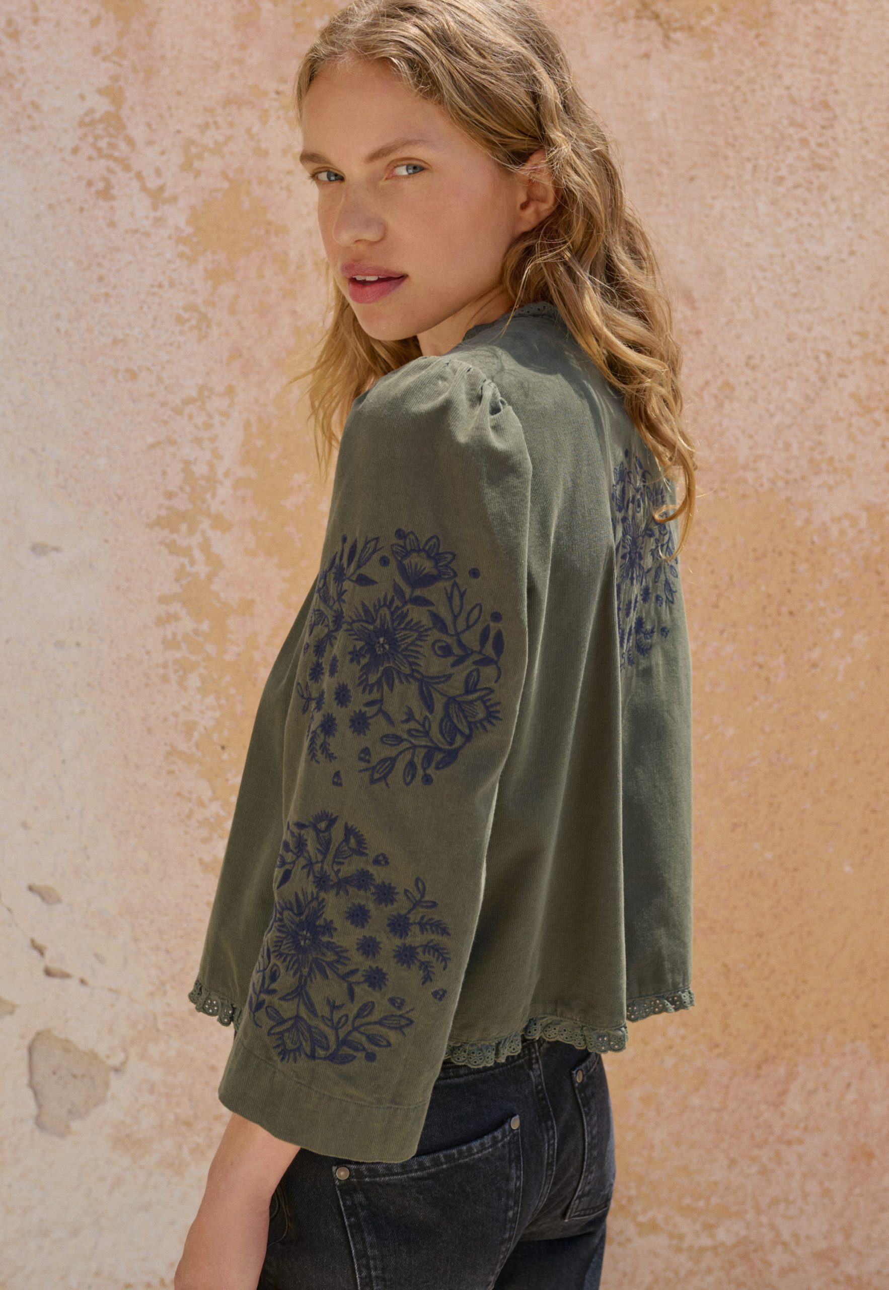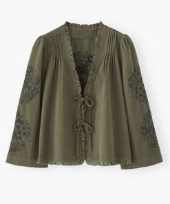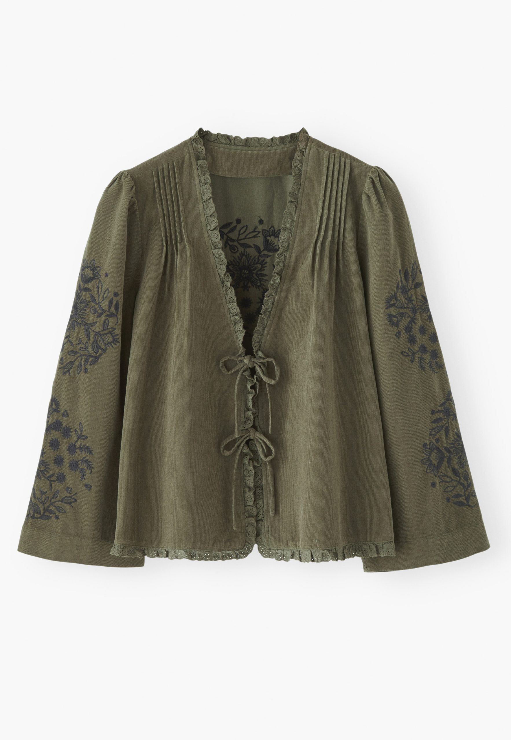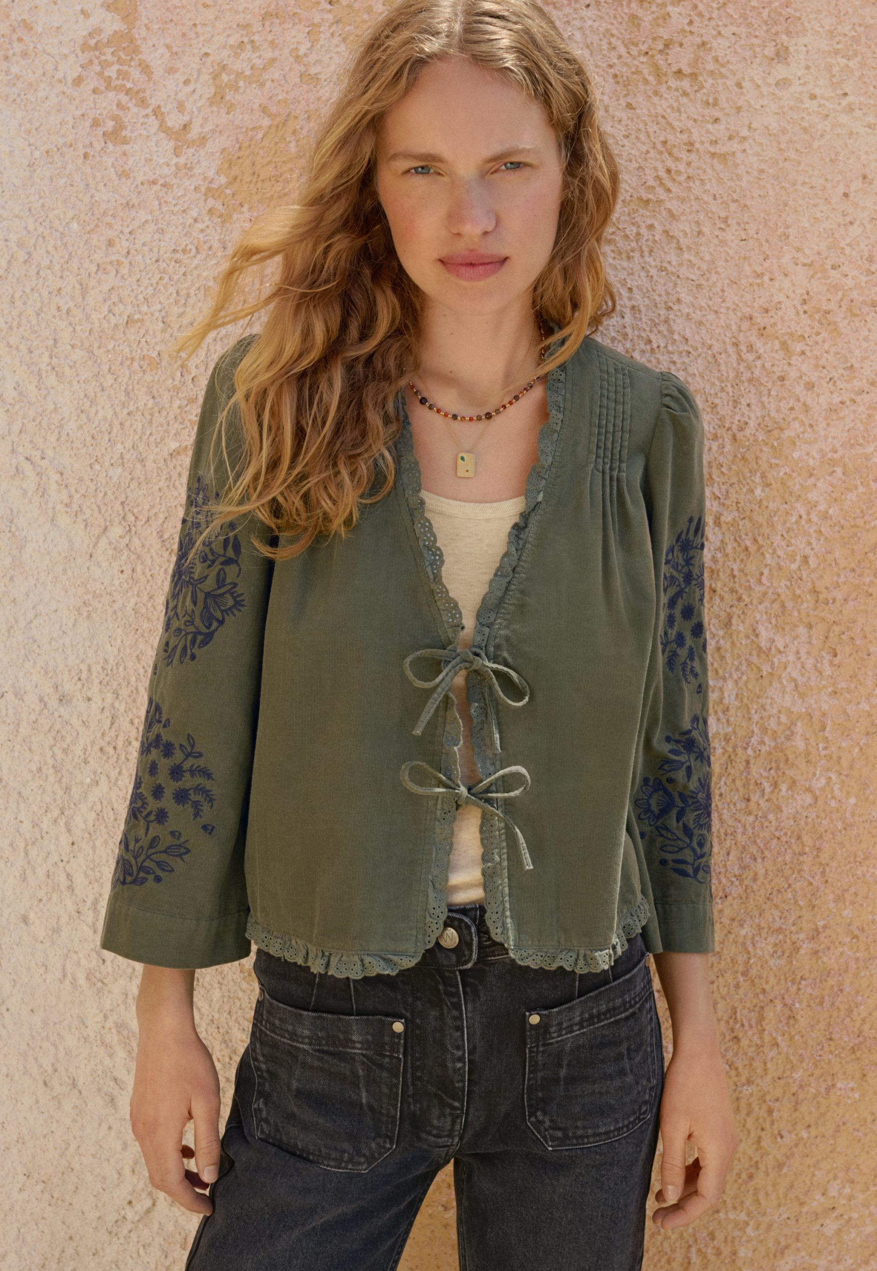 A great layer to add some ‘extra’ to your outfit, in velvety soft fine wale cotton cord. In a short boxy fit, it has wide, three-quarter length sleeves with circular floral embroidery motifs and more on the back. Beautifully detailed with lace edging, pintucks and a double-tie fastening.