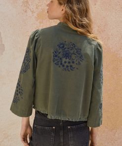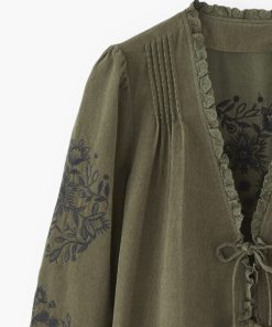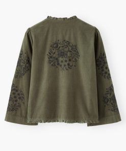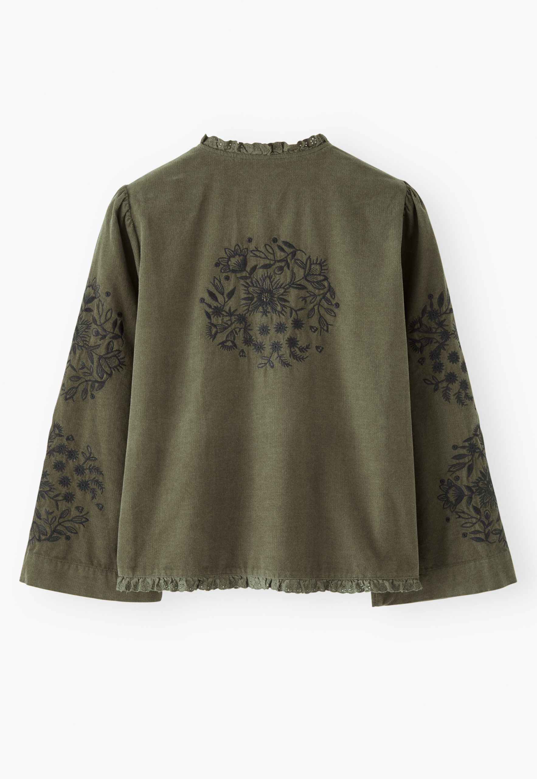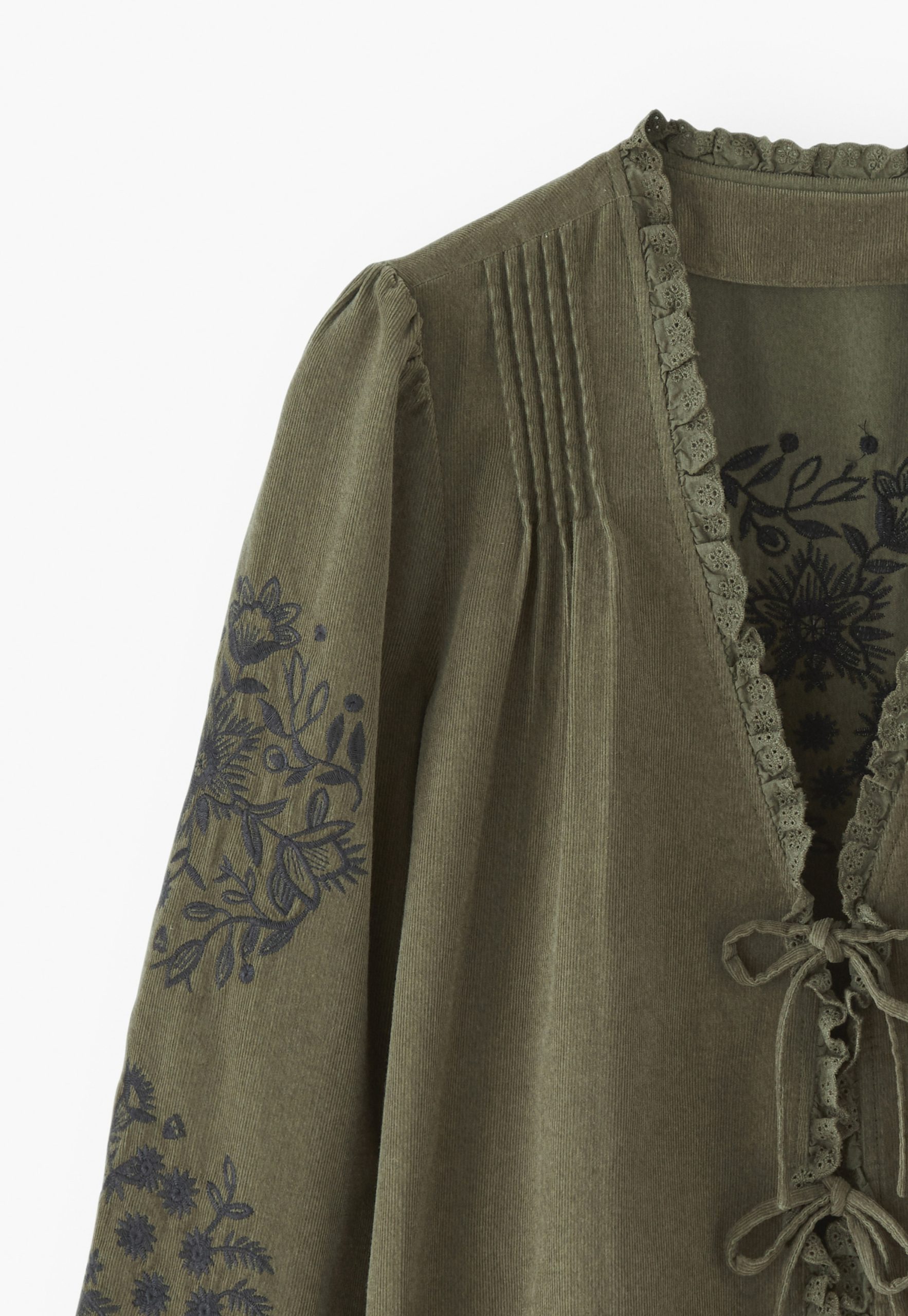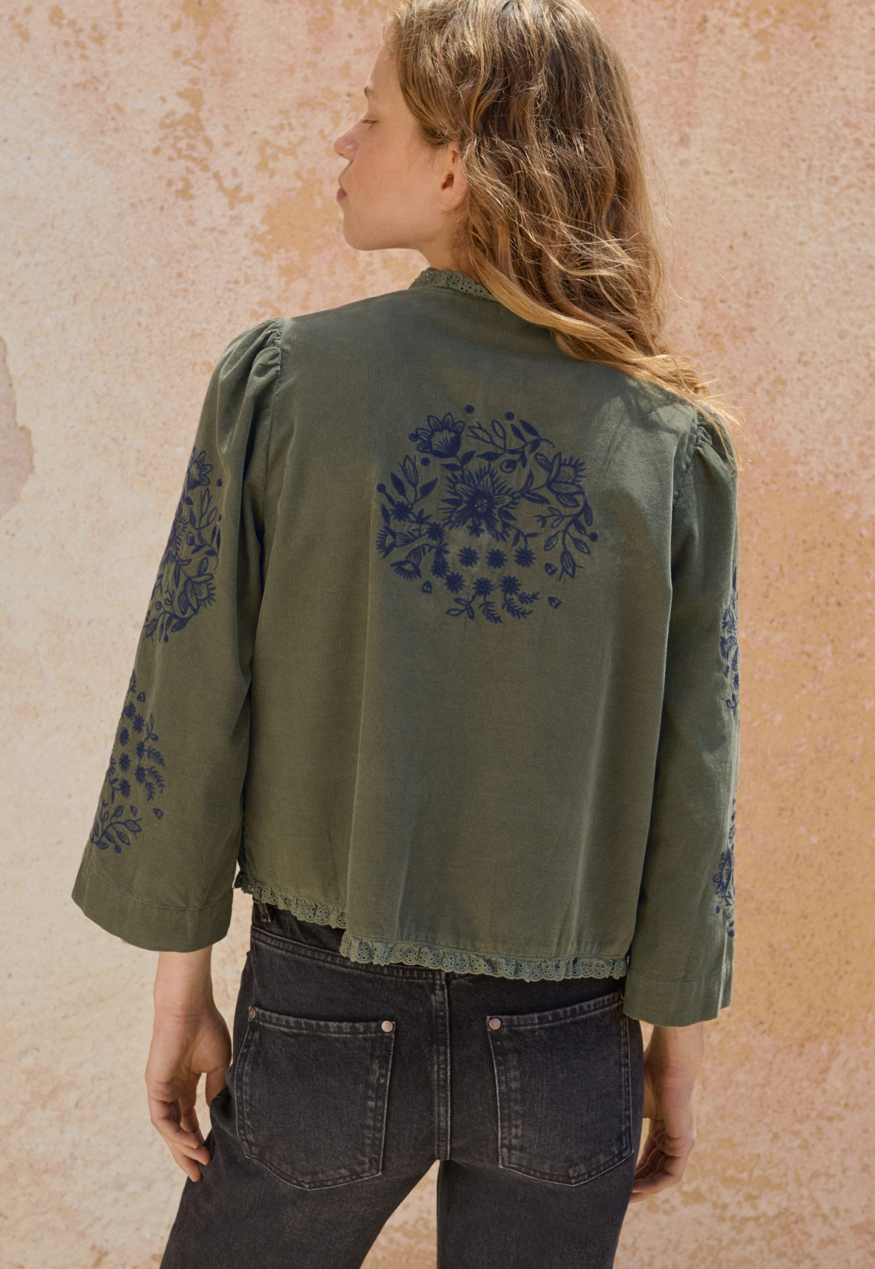 A great layer to add some ‘extra’ to your outfit, in velvety soft fine wale cotton cord. In a short boxy fit, it has wide, three-quarter length sleeves with circular floral embroidery motifs and more on the back. Beautifully detailed with lace edging, pintucks and a double-tie fastening.