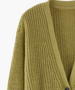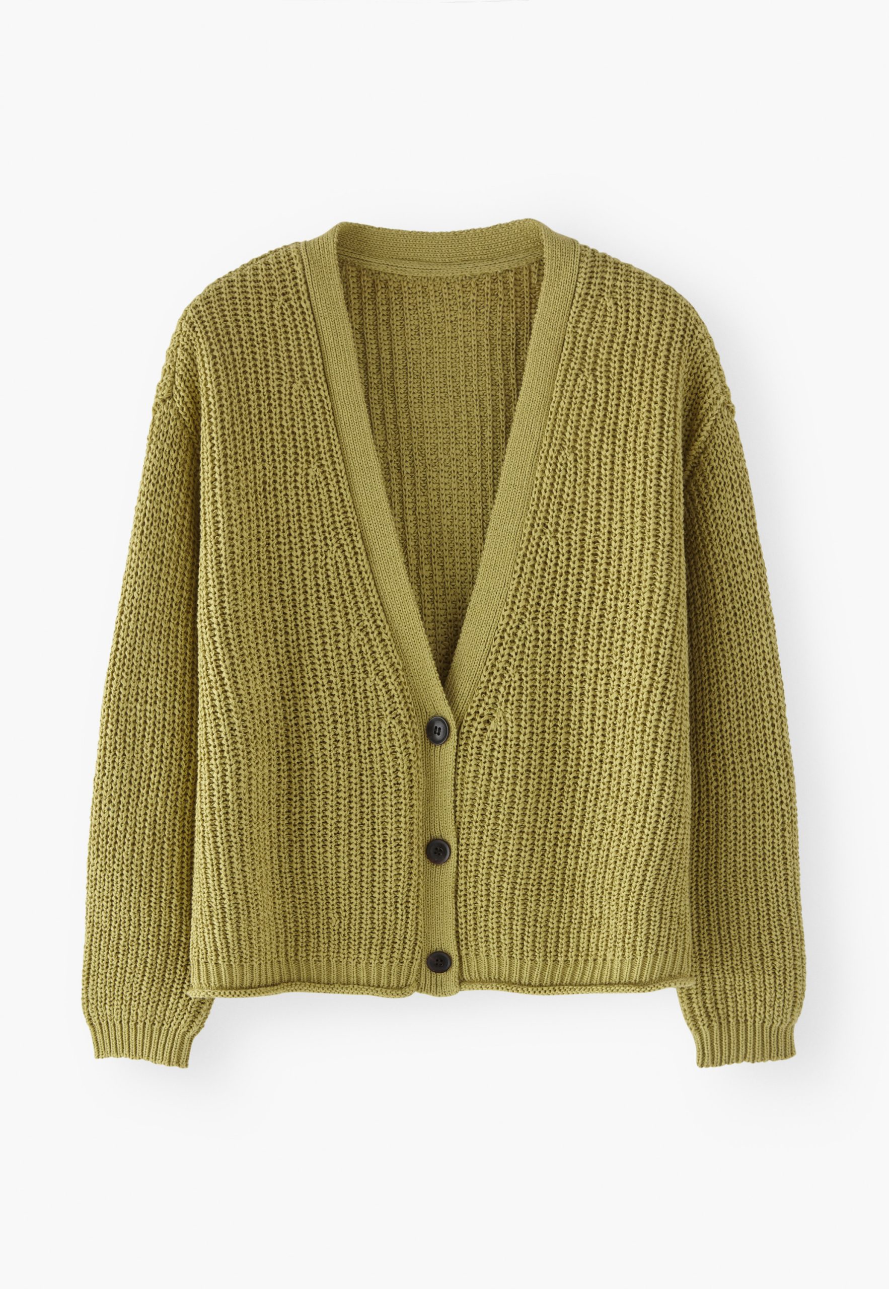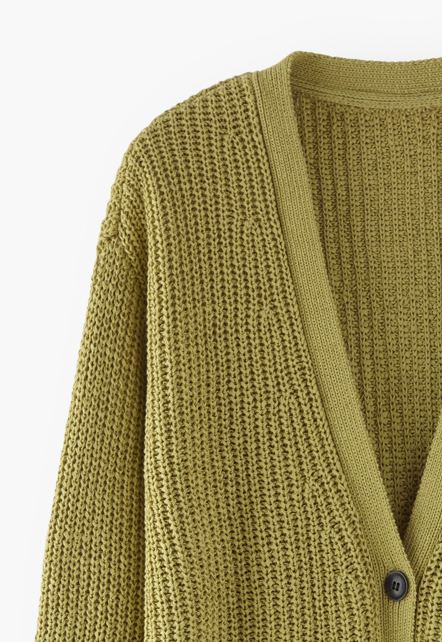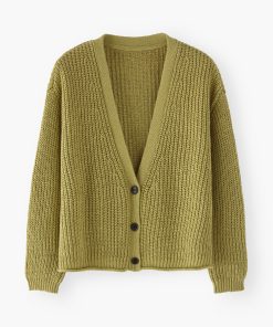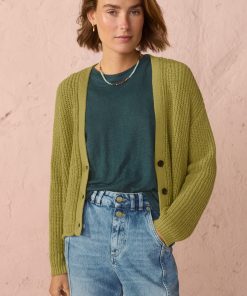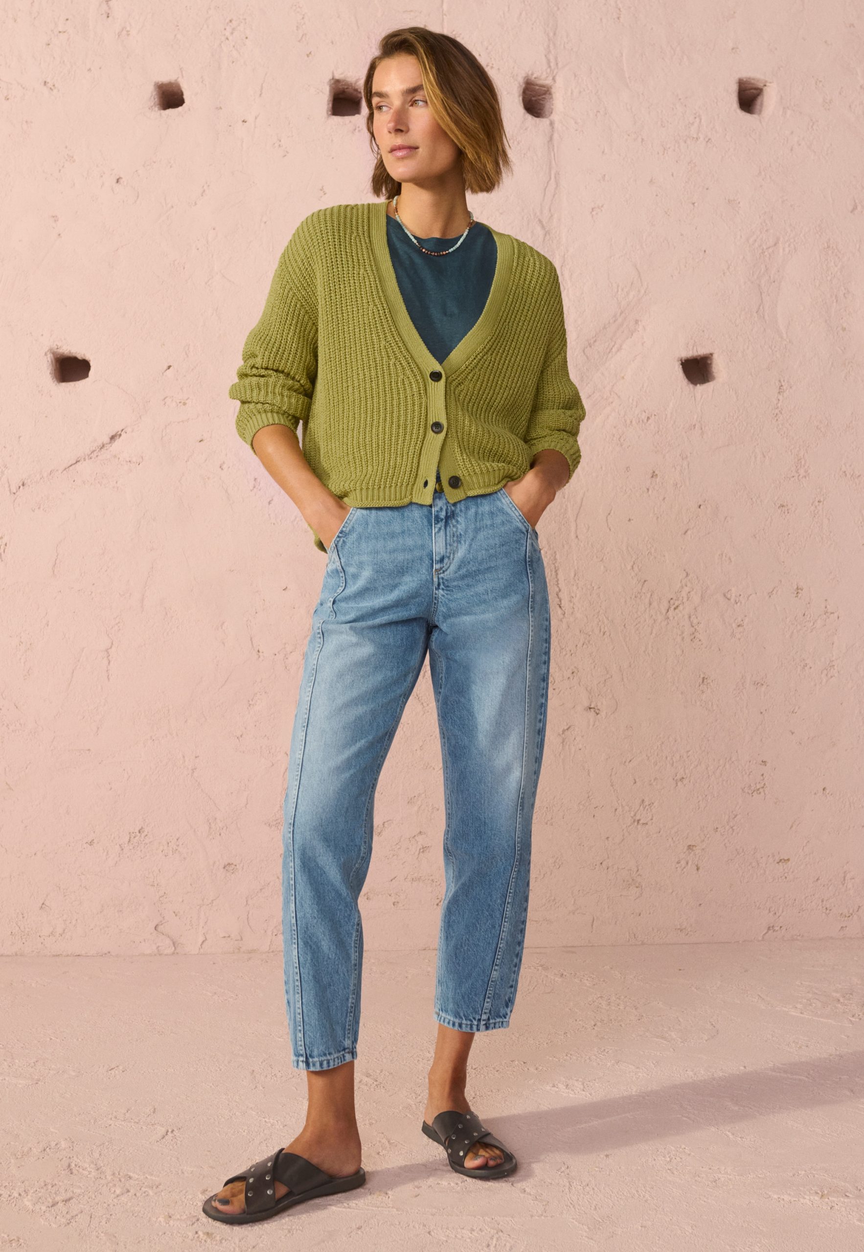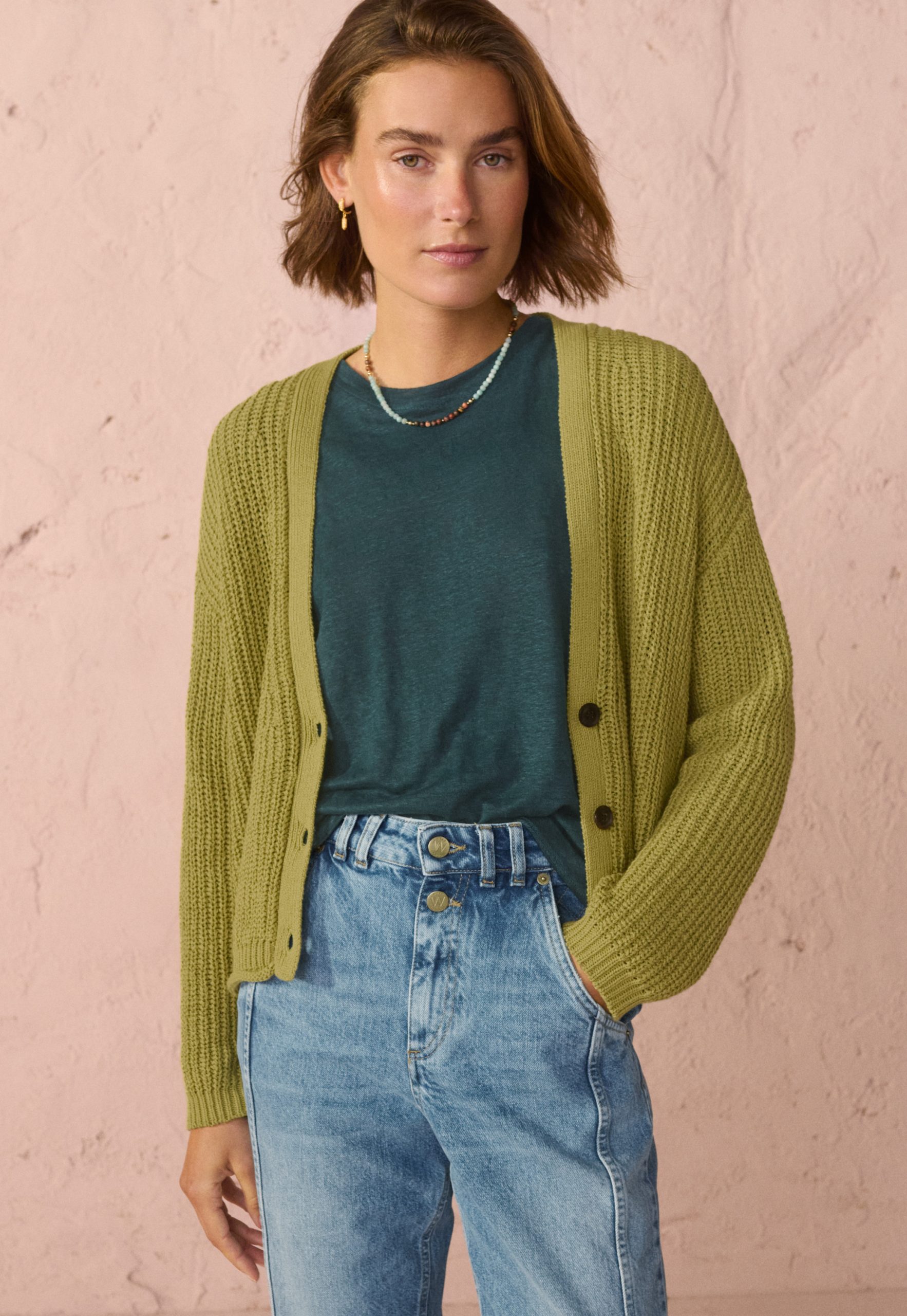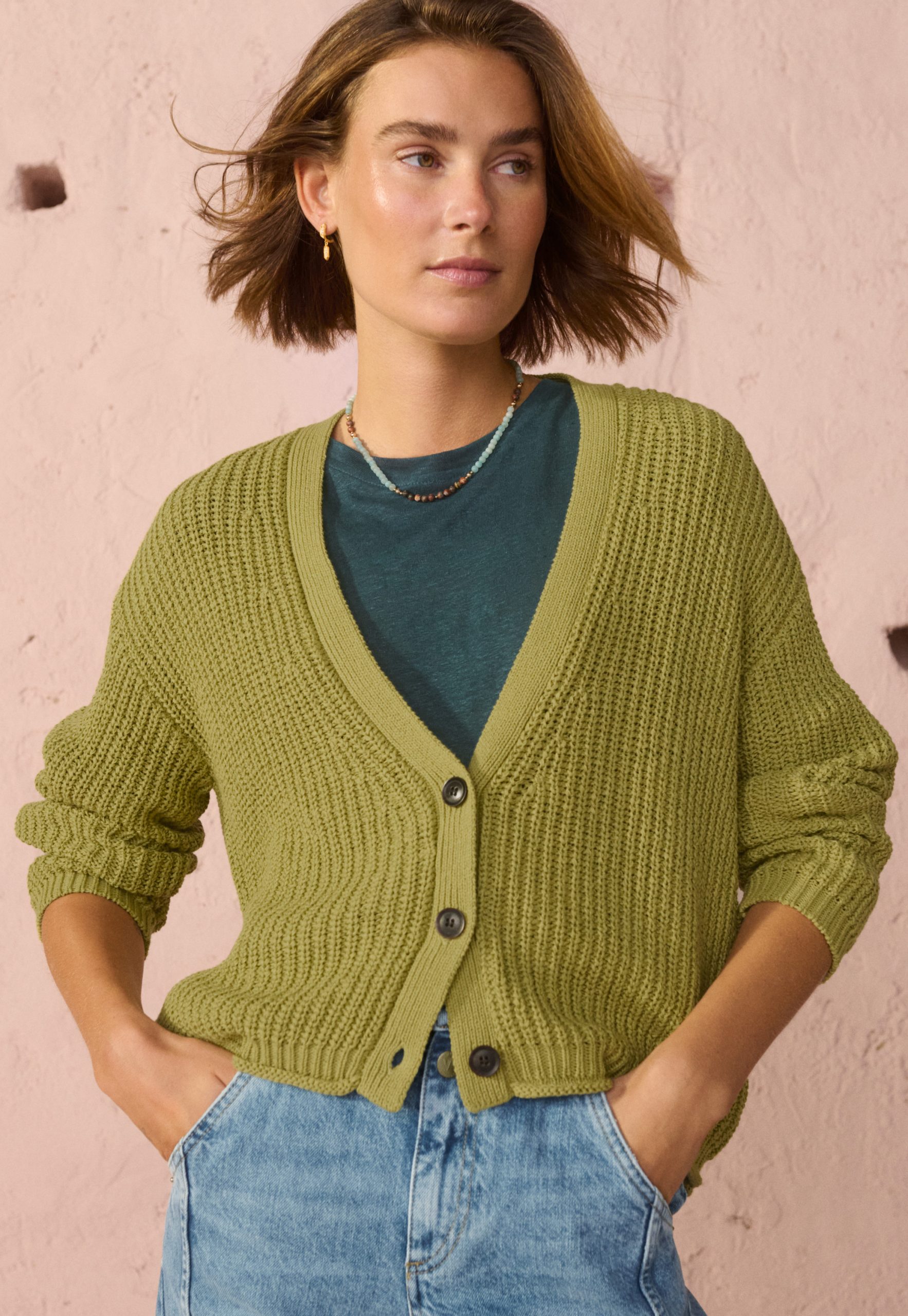 A go-to extra layer, this chunky-stitch cardigan has a deep v-neckline with three buttons to close. Short, boxy fit with soft dropped shoulders and full-length sleeves finished with little ribbed cuffs.