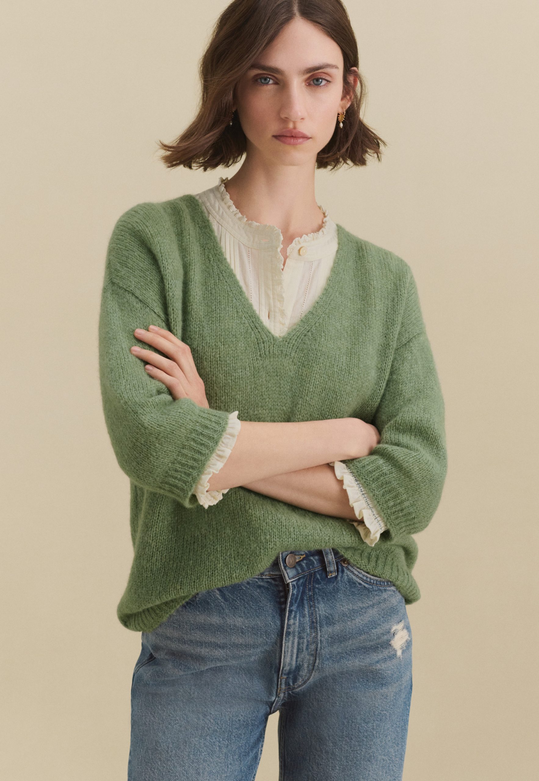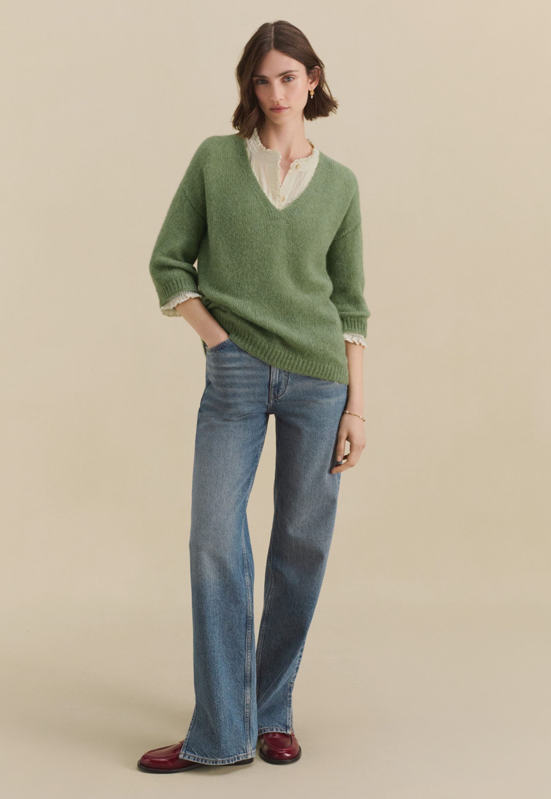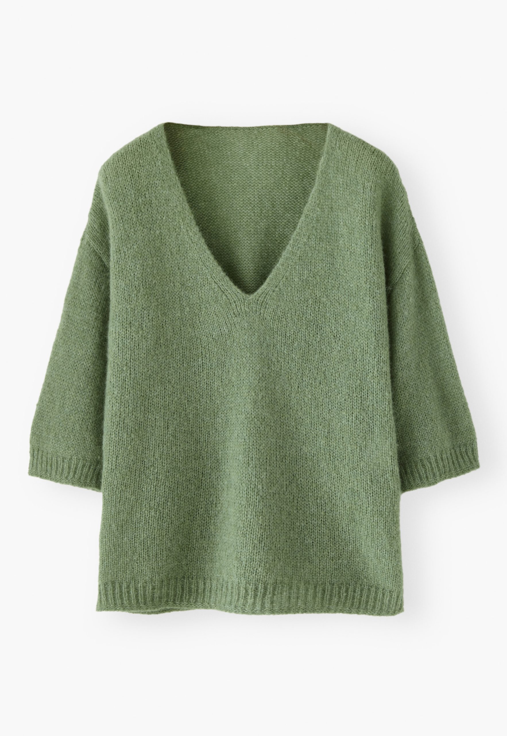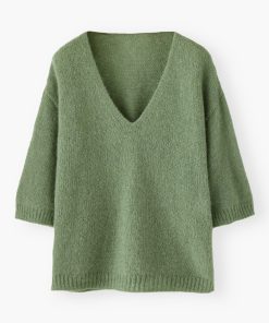 Soft alpaca wool is knitted on a loose gauge to create a light and airy v-neck sweater with a boxy fit. Three-quarter length sleeves make it easy to show off your bracelets.