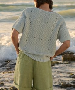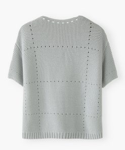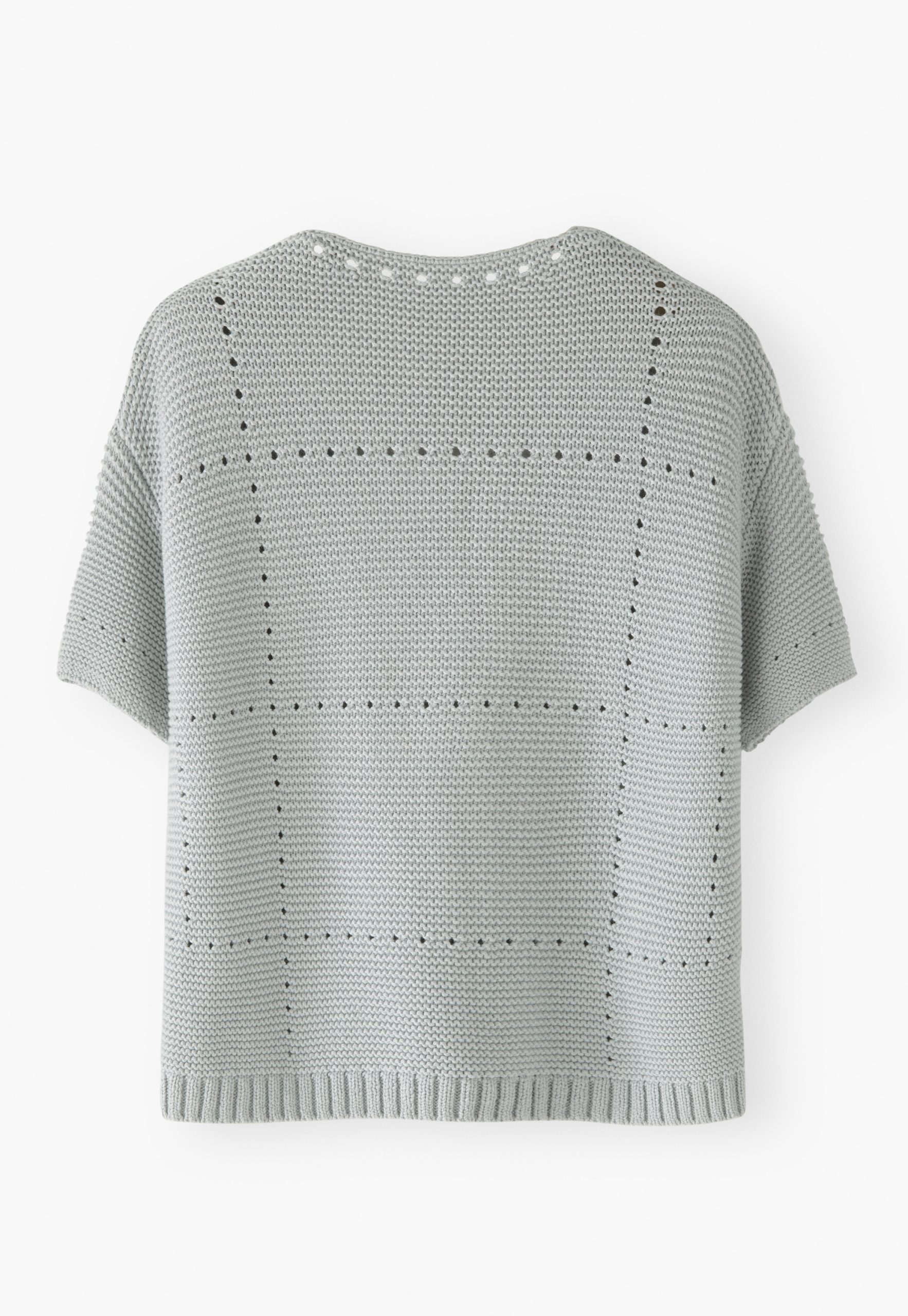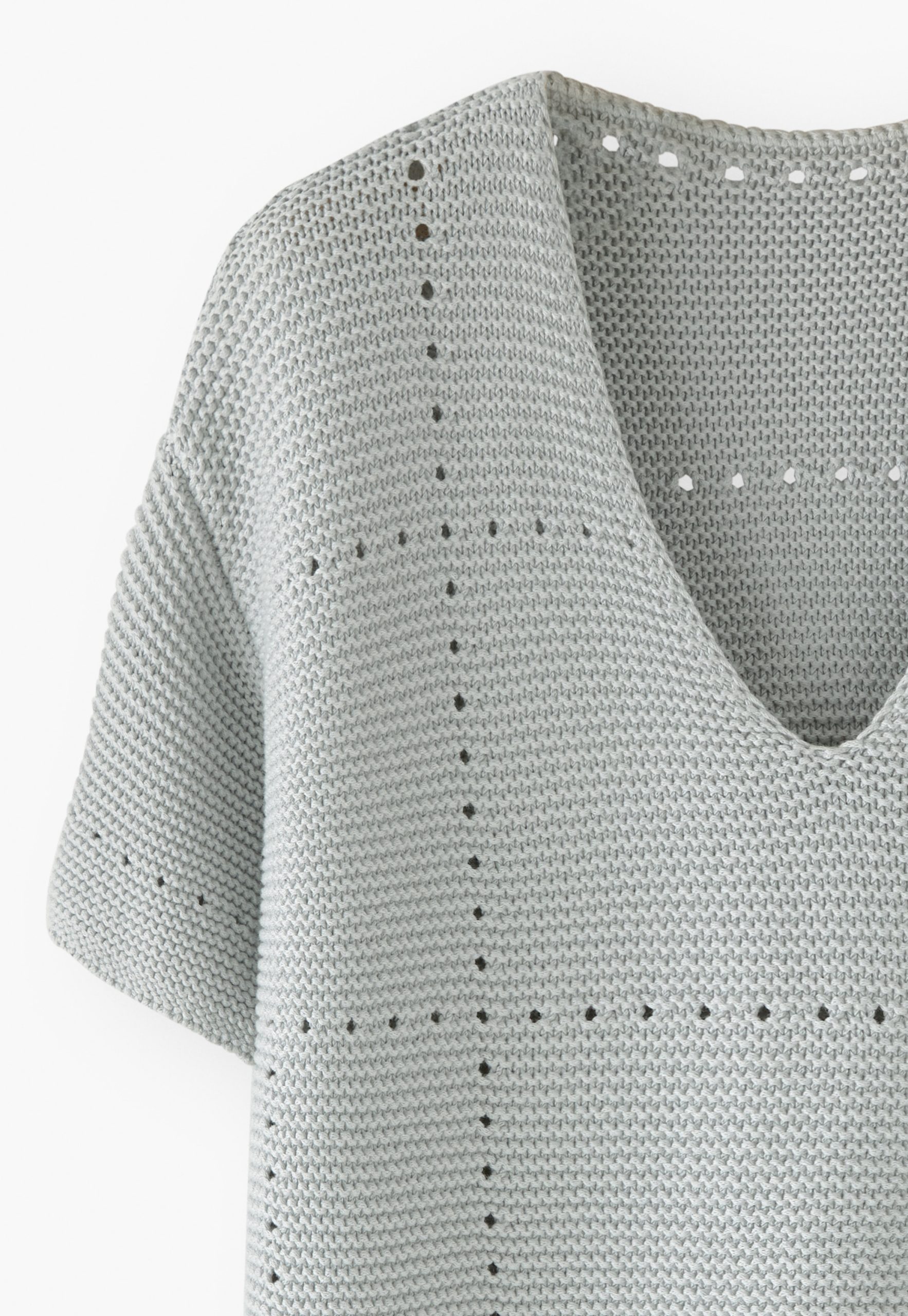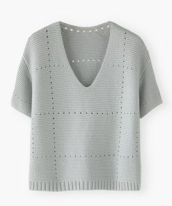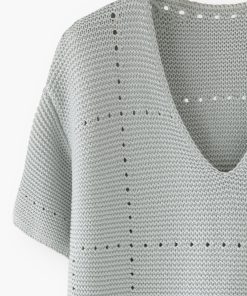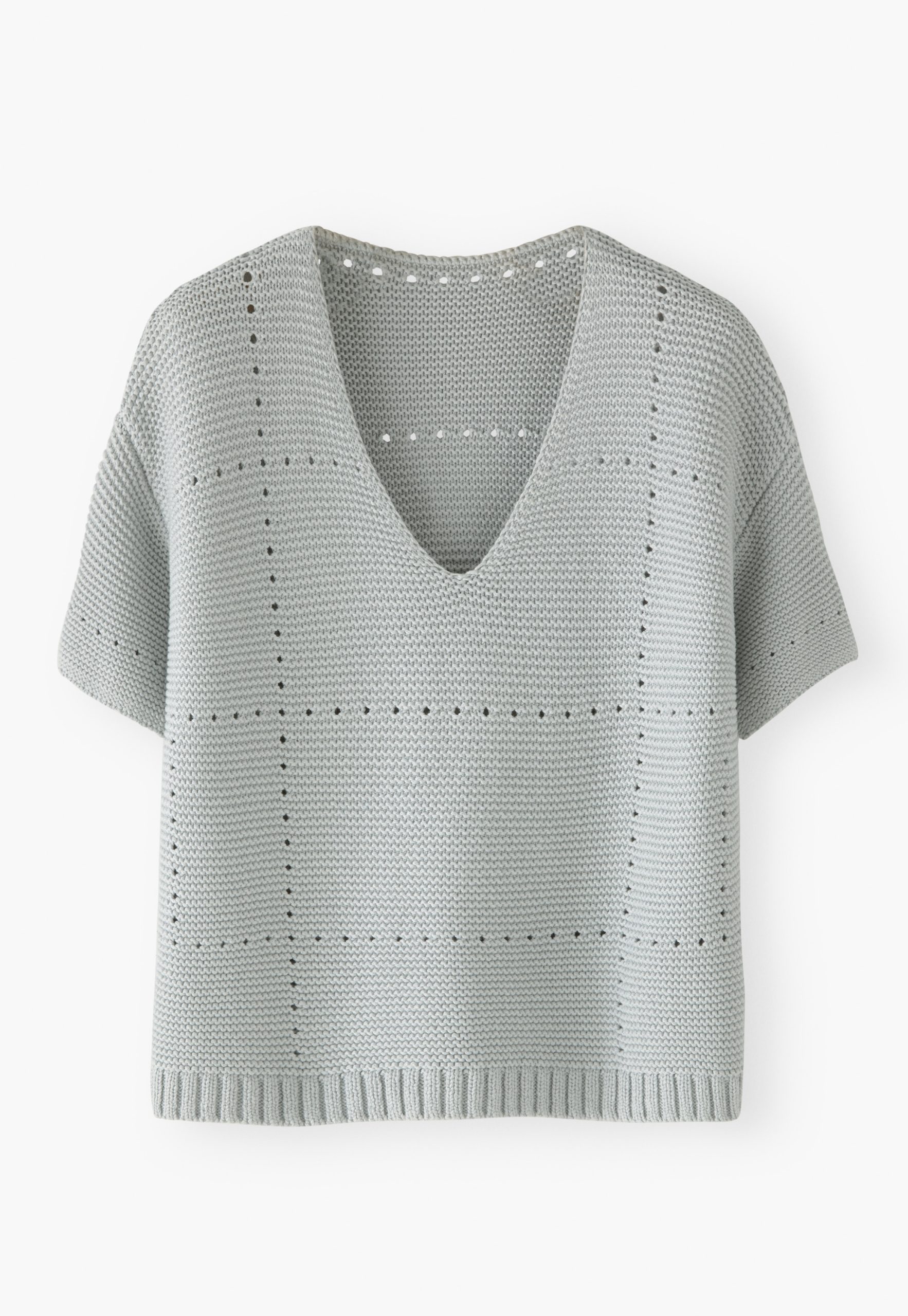 Super-nice summer v-neck sweater knitted from soft, smooth cotton. Boxy fit so it finishes at the top of your trousers or shorts, the all-over stitching is interrupted with a deliberate hole detail.
