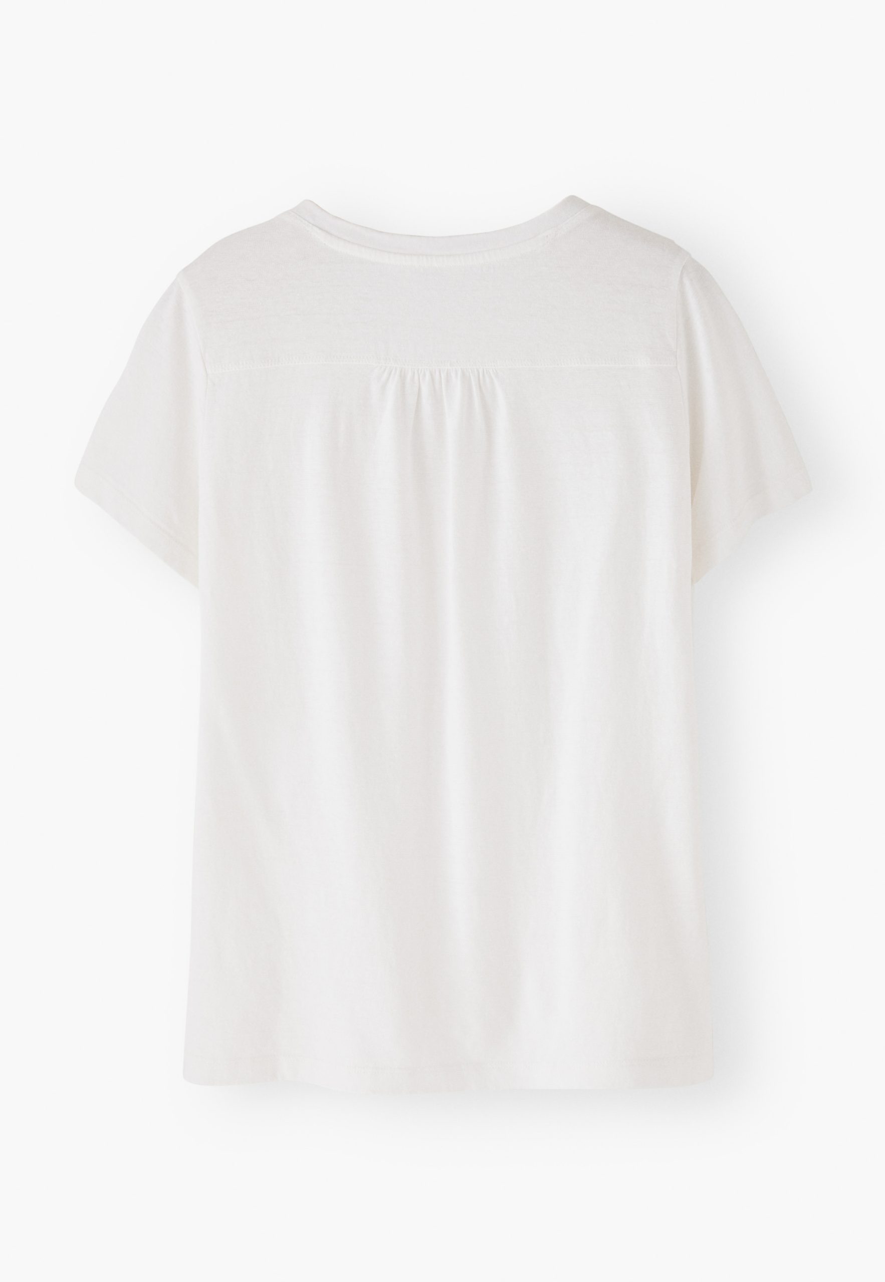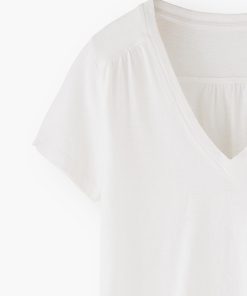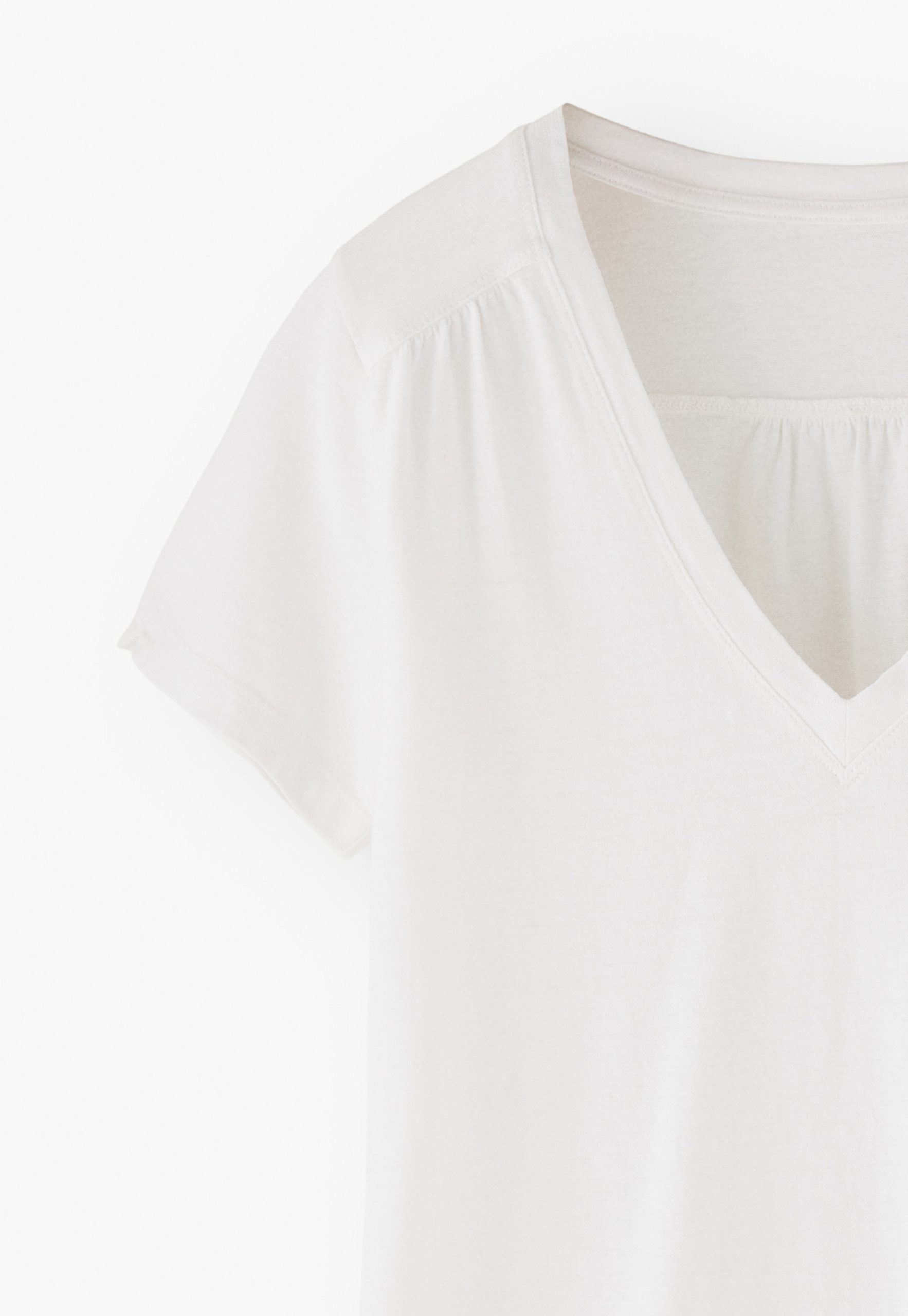 A relaxed v-neck T-shirt in soft and drapey hemp and organic cotton jersey, that makes it easy to show off a favourite necklace. Gentle gathers at the shoulders and back elevate this from the ordinary, and the short sleeves have a neat split detail.